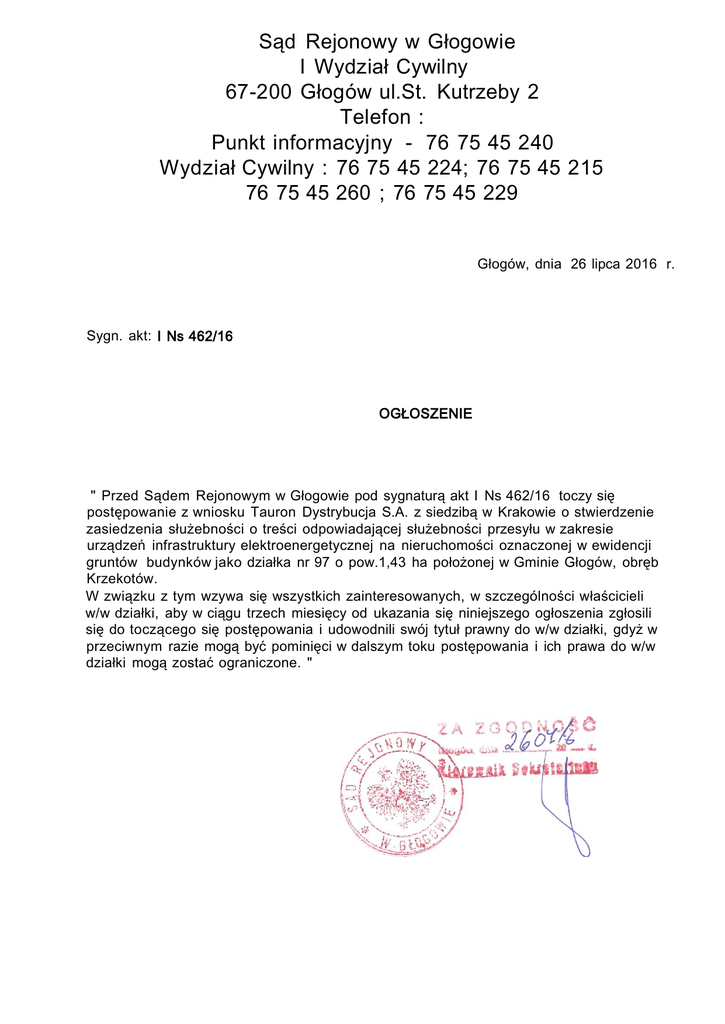 Sąd Rejonowy w Głogowie I Wydział Cywilny 67-200 Głogów ul.St. Kutrzeby 2 Telefon : Punkt informacyjny - 76 75 45 240 Wydział Cywilny : 76 75 45 224; 76 75 45 215 76 75 45 260 ; 76 75 45 229 Głogów, dnia 26 lipca 2016 r. Sygn. akt: I Ns 462/16 OGŁOSZENIE " Przed Sądem Rejonowym w Głogowie pod sygnaturą akt I Ns 462/16 toczy się postępowanie z wniosku Tauron Dystrybucja S.A. z siedzibą w Krakowie o stwierdzenie zasiedzenia służebności o treści odpowiadającej służebności przesyłu w zakresie urządzeń infrastruktury elektroenergetycznej na nieruchomości oznaczonej w ewidencji gruntów budynków jako działka nr 97 o pow.1,43 ha położonej w Gminie Głogów, obręb Krzekotów. W związku z tym wzywa się wszystkich zainteresowanych, w szczególności właścicieli w/w działki, aby w ciągu trzech miesięcy od ukazania się niniejszego ogłoszenia zgłosili się do toczącego się postępowania i udowodnili swój tytuł prawny do w/w działki, gdyż w przeciwnym razie mogą być pominięci w dalszym toku postępowania i ich prawa do w/w działki mogą zostać ograniczone. "