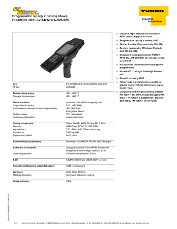 Programator ręczny z baterią litową PD-IDENT-UHF-S2D-RWBTA-920-925 ■ Odczyt i zapis danych na nośnikach RFID pozostających w ruchu ■ Programator ręczny z anteną UHF ■ Skaner kodów 2D (czyta kody 1D i 2D) ■ System operacyjny Windows Embedded CE 6.0 (CN) ■ Dołączone oprogramowanie TURCK RFID TA-UHF (CN/EN) do odczytu i zapisu danych ■ Na życzenie indywidualne rozwiązanie programowe ■ WLAN 802.11a/b/g/n i interfejs Bluetooth ■ Stopień ochrony IP65 PD-IDENT-UHF-S2D-RWBTA-920-925 7030645 Temperatura pracy Storage temperature -20…+50 °C -40…+60 °C Dane transferu Częstotliwość pracy Komunikacja radiowa i standard protokołu Output power Antenna polarization zmienne pole elektromagnetyczne 920…925 MHz ISO 18000-6C EPCglobal Gen 2 1W, ustawialne linear horizontal Cechy urządzenia Memory Wyświetlacz Klawiatura Pojemność baterii Sitara AM37x ARM Cortex-A8, 1 GHz 4GB Flash ROM; 512MB RAM 3.7'', 640 x 480, Ekran dotykowy 55 Przyciski 4400 mAh Komunikacja za pomocą Bluetooth V2.0+EDR, WLAN 802.11a/b/g/n Software w zestawie Operating system Oprogramowanie Turck RFID, Możliwość ściągnięcia darmowego zestawu SDK Windows Embedded CE 6.0 Kod Czytnik kodów 2D (czyta kody 1D i 2D) Sposób podłączenia stacji dokującej USB (szeregowe) Wymiary Materiał obudowy 260x 100x 190mm tworzywo sztuczne, czarny Klasa ochrony IP65 ■ Odporność na wielokrotne upadki na gładką powierzchnię betonową z wysokości 1,5 m ■ Dołączony uchwyt pistoletowy, bateria PD-IDENT-TA-4400, stacja dokująca PDIDENT-TA-DOCK z adapterem i przewodem USB, PD-IDENT-TA-STYLUS Edition • 2016-09-30T23:11:29+02:00 Typ Nr kat. 1/2 Hans Turck GmbH & Co.KG ñ D-45472 Mülheim an der Ruhr ñ Witzlebenstraße 7 ñ Tel. 0208 4952-0 ñ Fax 0208 4952-264 ñ [email protected] ñ www.turck.com Programator ręczny z baterią litową PD-IDENT-UHF-S2D-RWBTA-920-925 Akcesoria montażowe Nr kat. PD-IDENT-TA-4400 PD-IDENT-TA-RS232 7030518 7030554 PD-IDENT-TA-STYLUS PD-IDENT-TA-POWERSUPPLY PD-IDENT-TA-DOCK PD-IDENT-TA-DOCK-ETHERNET 7030550 7030597 Zamienna bateria 4400 mAh Przewód adaptera RS232 do bezpośredniego podłączenia programatorów ręcznych TA z urządzeniami z interfejsem RS-232 (np. PLC, PC) zamienne pisaki (25 szt.) Jednostka zasilająca Rysunek wymiarowy 7030596 7030595 Stacja bazowa, zawiera zasilacz Adapter Ethernet dla stacji bazowych Edition • 2016-09-30T23:11:29+02:00 Typ 2/2 Hans Turck GmbH & Co.KG ñ D-45472 Mülheim an der Ruhr ñ Witzlebenstraße 7 ñ Tel. 0208 4952-0 ñ Fax 0208 4952-264 ñ [email protected] ñ www.turck.com