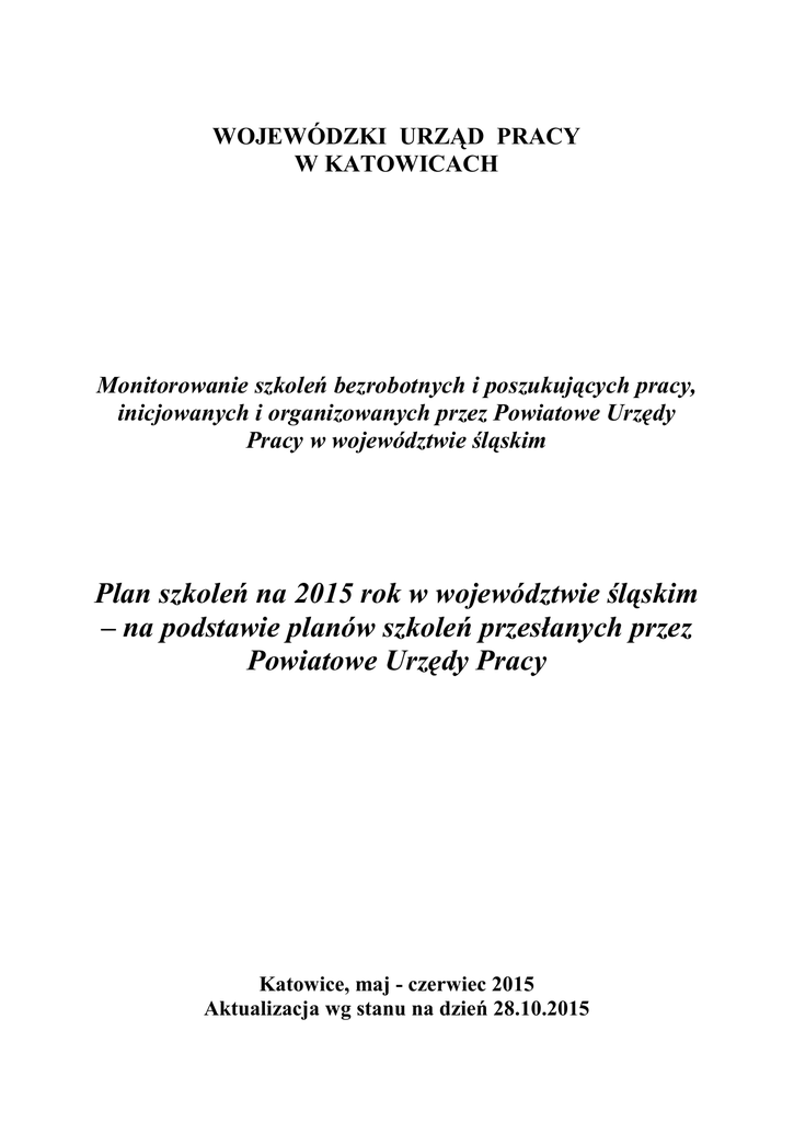 WOJEWÓDZKI URZĄD PRACY W KATOWICACH Monitorowanie szkoleń bezrobotnych i poszukujących pracy, inicjowanych i organizowanych przez Powiatowe Urzędy Pracy w województwie śląskim Plan szkoleń na 2015 rok w województwie śląskim – na podstawie planów szkoleń przesłanych przez Powiatowe Urzędy Pracy Katowice, maj - czerwiec 2015 Aktualizacja wg stanu na dzień 28.10.2015 WPROWADZENIE Wojewódzki Urząd Pracy w Katowicach opracował założenia „Monitorowania szkoleń bezrobotnych i poszukujących pracy inicjowanych i organizowanych przez Powiatowe Urzędy Pracy w województwie śląskim”. Przedsięwzięcie wynika z zapisów Ustawy o promocji zatrudnienia i instytucjach rynku pracy z 20 kwietnia 2004 roku (t.j. Dz. U. 2013 poz. 674. z późniejszymi zmianami) – art. 8, ust. 1, pkt 13 f oraz Rozporządzenia Ministra Pracy i Polityki Społecznej z dnia 22 maja 2014r. w sprawie szczegółowych warunków realizacji oraz trybu i sposobów prowadzenia usług rynku pracy (Dz. U. z 2014r., poz. 667). Przedsięwzięcie to realizowane jest corocznie w dwóch etapach: I ETAP ma na celu opracowanie wojewódzkiego planu szkoleń, przygotowanego w oparciu o dane uzyskane z poszczególnych Powiatowych Urzędów Pracy z terenu województwa śląskiego. Pierwszy plan szkoleń powstał w 2008 roku. II ETAP ma na celu zaprezentowanie w skali wojewódzkiej danych za poprzedni rok kalendarzowy, dotyczących analizy skuteczności i efektywności zrealizowanych szkoleń w poszczególnych Powiatowych Urzędach Pracy z terenu województwa śląskiego. Pierwsze rozliczenie planu szkoleń zostało opracowane w 2009 roku. Dane z obu etapów są upowszechnione na stronach internetowych Wojewódzkiego Urzędu Pracy w Katowicach. . 2 Spis treści 1. MONITOROWANIE SZKOLEŃ BEZROBOTNYCH I POSZUKUJĄCYCH PRACY, INICJOWANYCH I ORGANIZOWANYCH PRZEZ POWIATOWE URZĘDY PRACY W WOJEWÓDZTWIE ŚLĄSKIM ................................................................................................. 4 2. ZBIORCZY PLAN SZKOLEŃ BEZROBOTNYCH I POSZUKUJĄCYCH PRACY NA 2015 ROK W WOJEWÓDZTWIE ŚLĄSKIM – NA PODSTAWIE PLANÓW SZKOLEŃ PRZESŁANYCH PRZEZ POWIATOWE URZĘDY PRACY ................................................. 9 2.1. Powiatowy Urząd Pracy w Będzinie ................................................................................. 10 2.2. Powiatowy Urząd Pracy w Bielsku – Białej ..................................................................... 11 2.3. Powiatowy Urząd Pracy w Bytomiu ................................................................................. 13 2.4. Powiatowy Urząd Pracy w Chorzowie.............................................................................. 41 2.5. Powiatowy Urząd Pracy w Cieszynie ............................................................................... 48 2.6. Powiatowy Urząd Pracy w Częstochowie ......................................................................... 63 2.7. Powiatowy Urząd Pracy w Dąbrowie Górniczej ............................................................... 73 2.8. Powiatowy Urząd Pracy w Gliwicach ............................................................................... 76 2.9. Powiatowy Urząd Pracy w Jastrzębiu Zdroju ................................................................... 94 2.10. Powiatowy Urząd Pracy w Jaworznie ........................................................................... 100 2.11. Powiatowy Urząd Pracy w Katowicach ........................................................................ 119 2.12. Powiatowy Urząd Pracy w Kłobucku ........................................................................... 121 2.13. Powiatowy Urząd Pracy w Lublińcu ............................................................................. 125 2.14. Powiatowy Urząd Pracy w Mikołowie.......................................................................... 128 2.15. Powiatowy Urząd Pracy w Mysłowicach ...................................................................... 129 2.16. Powiatowy Urząd Pracy w Myszkowie ........................................................................ 129 2.17. Powiatowy Urząd Pracy w Piekarach Śląskich ............................................................. 131 2.18. Powiatowy Urząd Pracy w Pszczynie ........................................................................... 135 2.19. Powiatowy Urząd Pracy w Raciborzu ........................................................................... 141 2.20. Powiatowy Urząd Pracy w Rudzie Śląskiej .................................................................. 144 2.21. Powiatowy Urząd Pracy w Rybniku ............................................................................. 145 2.22. Powiatowy Urząd Pracy w Siemianowicach Śląskich .................................................. 149 2.23. Powiatowy Urząd Pracy w Sosnowcu ........................................................................... 150 2.24. Powiatowy Urząd Pracy w Świętochłowicach .............................................................. 170 2.25. Powiatowy Urząd Pracy w Tarnowskich Górach ......................................................... 177 2.26. Powiatowy Urząd Pracy w Tychach ............................................................................. 178 2.27. Powiatowy Urząd Pracy w Wodzisławiu Śląskim ........................................................ 179 2.28. Powiatowy Urząd Pracy w Zabrzu ................................................................................ 179 2.29. Powiatowy Urząd Pracy w Zawierciu ........................................................................... 182 2.30. Powiatowy Urząd Pracy w Żorach ................................................................................ 184 2.31. Powiatowy Urząd Pracy w Żywcu ................................................................................ 189 3. PODSUMOWANIE – WOJEWÓDZK