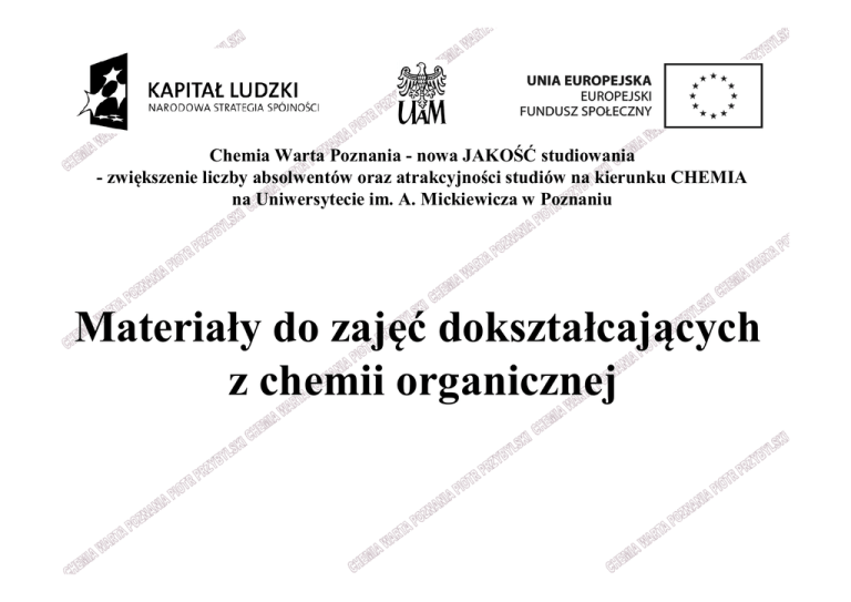 Chemia Warta Poznania - nowa JAKOŚĆ studiowania - zwiększenie liczby absolwentów oraz atrakcyjności studiów na kierunku CHEMIA na Uniwersytecie im. A. Mickiewicza w Poznaniu Materiały do zajęć dokształcających z chemii organicznej Zajęcia nr 1 1. Hybrydyzacja atomu węgla w głównych grupach funkcyjnych związków organicznych 2. Kwasy i zasady 3. Elementy stereochemii podstawionych alkanów i cykloalkanów 1. Hybrydyzacja atomu węgla w głównych grupach funkcyjnych związków organicznych Konfiguracja elektronowa atomu węgla 12 6 C ↑↓ ↑↓ ↑ ↑ 1s 2s 2p 2p 2p Konfiguracja elektronowa atomu węgla w stanie wzbudzonym 12 6 C * ↑↓ ↑ ↑ ↑ ↑ 1s 2s 2p 2p 2p Hybrydyzacja 1s 2s 2p 2p 2p 2sp3 s + 3·p CH4 3 sp = 4·sp3 C2H6 109,5o 2sp3 2sp3 2sp3 Hybrydyzacja sp2 1s 2s 2p 2p 2p 2sp2 s + 2·p = BH3 120o 2sp2 2sp2 3·sp2 Hybrydyzacja sp 1s 2s 2p 2p 2p s +p BeH2 180o 2sp = 2·sp 2sp Główne grupy funkcyjne PODSTAWOWE GRUPY ALKILOWE grupa metylowa CH3 H grupa metylenowa C H H H H H H H H H C C C C H C C C C C H H H H H H H H H H grupa butylowa grupa pentylowa H H H H H H H C C C C H grupa metinowa C H H H grupa sec-butylowa H H H C C H C C C H grupa etylowa HH C HH H H H C C C H H H H H grupa propylowa H C H C H H C H H grupa izopropylowa grupa izobutylowa H H H C H C C H HH C HH H H C C C H HH C HH H H H H H C H H H grupa tert-butylowa H grupa neopentylowa H H H C grupa cyklopropylowa C H C H ( ) H C H H H H H H H C C H H H H ( H H H H C ) H C C H H H grupa izopropylidenowa ( ) grupa benzylowa C C C H H H H C H H ( ) ( ) C C C C C H H C H grupa benzylidenowa C H C H C C H H C H grupa cyklopentylowa H H H C H C H C H C C ) ) H H H ( C C H C C grupa allilowa ( ) C H H H grupa fenylowa C C ) ( C C C H grupa winylowa H C H ( C H grupa cyklobutylowa C H C C H H C H C H H H H grupa cykloheksylowa ( ) O OH grupa hydroksylowa SH grupa tiolowa grupa acylowa R O grupa ketonowa O grupa karboksylowa OH O O grupa estrowa OR O O O O S OH grupa sulfonowa O O S CH3 O grupa p- toluenosulfonowa OCH3 grupa metoksylowa OCH2CH3 grupa etoksylowa O cykliczny ester = lakton O grupa nitrowa N R = alkil lub aryl O NH2 grupa aminowa H H C H grupa N,N-dimetyloaminowa N C H H H C N grupa nitrylowa (cyjanowa) grupa aldehydowa (formylowa) H grupa amidowa N H NH2 cykliczny amid = laktam O R O O R bezwodnik kwasowy O Cl chlorek kwasowy R R O R eter 2. Kwasy i zasady Kwasy i zasady Brønsteda-Lowry’ego H H H H O N H H O H H kwas (słabszy) zasada (słabsza) O H CH3C O H O zasada (silniejsza) kwas (silniejszy) O CH3C O H kwas (słabszy) H N H H H O H zasada (słabsza) zasada (silniejsza) kwas (silniejszy) pKa Sprzężona zasada NH3 ~35 NH2- ROH 15-19 RO- H2O 15,7 OH- RSH 10-12 RS- R3NH+ 9-11 R3N HCN 9.40 -CN NH4+ 9.25 NH3 H2S 7.0 HS- RCOOH 4-5 RCOO- HF 3.2 F- CH3-C6H6-SO3H -1 CH3-C6H6-SO3- H3O+ -1.7 H2O H2SO4 -3 HSO4- HCl -8-(-9) Cl- HClO4 -10 ClO4- HCN + OH ¯ pKa=9.4 ¯CN + H2O pKa=15.7 Wzrastająca zasadowość Wzrastająca kwasowość Sprzężony kwas Kwasy i zasady Lewisa F F F B NH3 F B F F kwas O zasada O O O + Na O NH3 O zasada O Na O kwas O O Podział kwasów i zasad Pearsona kwasy zasady twarde H , Na , K , Mg , Ca , Mn , Al , Cr , Co , Fe3+, As3+, Si4+, Ti4+, BF3, AlCl3, SO3, CO2, H2O pośrednie Fe2+, Co2+, Ni2+, Cu2+, Zn2+, Pb2+, Sn2+, Sb3+, B(CH3)3, SO2, NO+, R3C+ miękkie Cu+, Ag+, Au+, Pd2+, Cd2+, Pt2+, BH3, GaCl3, I+, Br+, RO+, I2, Br2 + + + R 2+ C 2+ 2+ 3+ 3+ 3+ OH-, F-, CH3COO-, Cl-, ROH, RO-, R2O, NH3, RNH2, PO42-, CO3-, NO3-, SO42- O C6H5NH2, C5H5N, N3-, Br-, S2O32- R2S, RSH, RS-, I-, SCN-, R3P, (RO)3P, CN-, CO Podział kwasów i zasad Pearsona O O O O Na+ O O O O O O N N Na+ N S S Ag N S N S S N Ag + + S + S S Fe2+ S S N N N Fe2+ N N N Ładunek cząstkowy a ładunek formalny O H NH2 H H C C H H H O F H O elektroujemn. w skali Paulinga F = 4,1 O = 3,5 C = 2,5 H = 2,2 Cl = 2,8 N = 3,1 B = 2,0 O B O H H wzrost mocy kwasu O O OH OH OH OH O O Cl Cl pKa= 2.84 Cl pKa= 4.82 OH pKa= 4.76 FCH2 O O O O H3C pKa= 4.06 pKa= 4.52 OH pKa= 2.66 F2CH OH pKa= 1.24 F3C OH pKa= 0.23 Zasadowość a nukleofilowość O O C C Nu H H nukleofil Nu O O C C H BH+ zasada B 3. Elementy stereochemii podstawionych alkanów i cykloalkanów Reguła Cahna-Ingolda-Preloga (CIP) H A. Ustalamy priorytet atomów lub grup atomów przyłączonych do centrum chiralności B. Ustawiamy (obracamy) tak cząsteczkę żeby podstawnik o najniższym priorytecie (4) znajdował się jak najdalej od nas i ustalamy kierunek obrotu zgodnie z wyznaczonym priorytetem podstawników od 1-3. C. Jeżeli postępując zgodnie z priorytetem podstawników wykonamy obrót zgodnie z kierunkiem ruchu wskazówek zegara to konfigurację określamy jako (R), jeżeli niezgodnie z kierunkiem ruchu wskazówek zegara to konfigurację określamy jako (S). H H C metan H H3C H3C H H H H3C C C H CH3 CH3 H F C ? Reguły pierwszeństwa podstawników: CH3 Br 3F 2. Jeżeli nie można ustalić względnego pierwszeństwa dwóch grup według pierwszego punktu nr. 1 to należy przeprowadzić porównanie kolejnych atomów w tych grupach (jeżeli nie przyniesie to wyniku to należy odsunąć się jeszcze dalej od centrum chiralności). Oznacza to w konsekwencji porównywanie kolejnych atomów w grupach aż do momentu ustalenia pary atomów z których jeden ma większą liczbę atomową lub masową niż drugi. C F (S) - Sinster /lewy/ (R) - Rectus /prawy/ 2 Cl * Jeżeli cztery atomy połączone z centrum chiralności są różne to pierwszeństwo grup uzależnione jest od ich liczb atomowych – im wyższa tym wyższy priotytet.Jeżeli dwa atomy są izotopami tego samego pierwiastka to pierwszeństwo ma atom o większej liczbie masowej. H Br 2 1. H4 C (S) 1 Br 1 (S)- bromochlorofluorometan Br Cl * H4 C (R) F3 (R)- bromochlorofluorometan os obrotu 4 4 2 CH3 CH2CH3 * CH3 3 3 CH2CH3 C C 1 1 2 * (S) (S)-3-fenylo-3-metylopent-1-en lub (w/g IUPAC) obrót struktury bez zrywania wiazañ tak aby 4 byl najbardziej oddalony od nas 1-((S)-3-met ylopent-1-en-3-ylo)benzen trakt