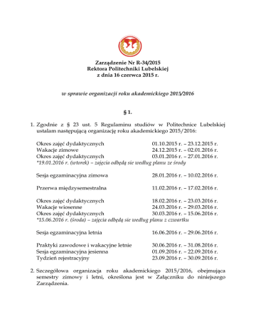 Zarządzenie Nr R-34/2015 Rektora Politechniki Lubelskiej z dnia 16 czerwca 2015 r. w sprawie organizacji roku akademickiego 2015/2016 § 1. 1. Zgodnie z § 23 ust. 5 Regulaminu studiów w Politechnice Lubelskiej ustalam następującą organizację roku akademickiego 2015/2016: Okres zajęć dydaktycznych 01.10.2015 r. – 23.12.2015 r. Wakacje zimowe 24.12.2015 r. – 02.01.2016 r. Okres zajęć dydaktycznych 03.01.2016 r. – 27.01.2016 r. *19.01.2016 r. (wtorek) – zajęcia odbędą sie według planu ze środy Sesja egzaminacyjna zimowa 28.01.2016 r. – 10.02.2016 r. Przerwa międzysemestralna 11.02.2016 r. – 17.02.2016 r. Okres zajęć dydaktycznych 18.02.2016 r. – 23.03.2016 r. Wakacje wiosenne 24.03.2016 r. – 29.03.2016 r. Okres zajęć dydaktycznych 30.03.2016 r. – 15.06.2016 r. *15.06.2016 r. (środa) – zajęcia odbędą sie według planu z czwartku Sesja egzaminacyjna letnia 16.06.2016 r. – 29.06.2016 r. Praktyki zawodowe i wakacyjne letnie Sesja egzaminacyjna jesienna Tydzień rejestracyjny 30.06.2016 r. – 31.08.2016 r. 01.09.2016 r. – 22.09.2016 r. 23.09.2016 r. – 30.09.2016 r. 2. Szczegółowa organizacja roku akademickiego 2015/2016, obejmująca semestry zimowy i letni, określona jest w Załączniku do niniejszego Zarządzenia. § 2. Opracowanie szczegółowej organizacji roku akademickiego 2015/2016 na studiach niestacjonarnych i doktoranckich, uwzględniającej w stosownym zakresie plan organizacyjny, o którym mowa w § 1, powierza sie dziekanom wydziałów. § 3. Dziekani wydziałów, w uzasadnionych przypadkach, mogą zmienić terminy realizacji zajęć dydaktycznych w semestrze oraz terminy sesji egzaminacyjnych, zachowując pełną realizację programu studiów. § 4. Terminy studenckich praktyk zawodowych oraz sposób i warunki ich zaliczania ustalają dziekani wydziałów. § 5. Za realizację postanowień niniejszego Zarządzenia odpowiadają dziekani wydziałów i kierownicy jednostek międzywydziałowych. § 6. Zarządzenie wchodzi w życie z dniem podpisania, z mocą obowiązująca od dnia 1 października 2015 r. Rektor Prof. dr hab. inż. Piotr Kacejko Załącznik do Zarządzenia Nr R-34/2015 Rektora Politechniki Lubelskiej z dnia 16 czerwca 2015 r. Semestr zimowy 2015/2016 Tygodnie Poniedziałek Wtorek Środa Czwartek Piątek Sobota Niedziela I - - - 01.10 02.10 03.10 04.10 II 05.10 06.10 07.10 08.10 09.10 10.10 11.10 I 12.10 13.10 14.10 15.10 16.10 17.10 18.10 II 19.10 20.10 21.10 22.10 23.10 24.10 25.10 I 26.10 27.10 28.10 29.10 30.10 31.10 - II - 03.11 04.11 05.11 06.11 07.11 08.11 I 09.11 10.11 - 12.11 13.11 14.11 15.11 II 16.11 17.11 18.11 19.11 20.11 21.11 22.11 I 23.11 24.11 25.11 26.11 27.11 28.11 29.11 II 30.11 01.12 02.12 03.12 04.12 05.12 06.12 I 07.12 08.12 09.12 10.12 11.12 12.12 13.12 II 14.12 15.12 16.12 17.12 18.12 19.12 20.12 21.12 22.12 23.12 - - - - I - - - - - - 03.01 II 04.01 05.01 - 07.01 08.01 09.01 10.01 I 11.01 12.01 13.01 14.01 15.01 16.01 17.01 II 18.01 19.01* 20.01 21.01 22.01 23.01 24.01 I 25.01 26.01 27.01 - - - - I II *19.01.2016 r. (wtorek) – zajęcia odbędą się według planu ze środy Semestr letni 2015/2016 Tygodnie Poniedziałek Wtorek Środa Czwartek Piątek Sobota Niedziela - - - 18.02 19.02 20.02 21.02 II 22.02 23.02 24.02 25.02 26.02 27.02 28.02 I 29.02 01.03 02.03 03.03 04.03 05.03 06.03 II 07.03 08.03 09.03 10.03 11.03 12.03 13.03 I 14.03 15.03 16.03 17.03 18.03 19.03 20.03 II 21.03 22.03 23.03 - - - - II - - 30.03 31.03 01.04 02.04 03.04 I 04.04 05.04 06.04 07.04 08.04 09.04 10.04 II 11.04 12.04 13.04 14.04 15.04 16.04 17.04 I 18.04 19.04 20.04 21.04 22.04 23.04 24.04 II 25.04 26.04 27.04 - - - - II - - - 05.05 06.05 07.05 08.05 I 09.05 10.05 11.05 12.05 13.05 14.05 15.05 II 16.05 17.05 18.05 19.05 20.05 21.05 22.05 I 23.05 24.05 25.05 - 27.05 28.05 29.05 II 30.05 31.05 01.06 02.06 03.06 04.06 05.06 I 06.06 07.06 08.06 09.06 10.06 11.06 12.06 II 13.06. 14.06. 15.06* - - - - I II *15 czerwca 2016 r. (środa) – zajęcia odbędą się według planu z czwartku
