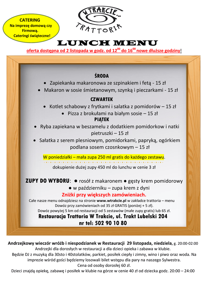 CATERING Na imprezę domową czy Firmową. Cateringi świąteczne! LUNCH MENU oferta dostępna od 2 listopada w godz. od 1200 do 1600 nowe dłuższe godziny! ŚRODA Zapiekanka makaronowa ze szpinakiem i fetą - 15 zł Makaron w sosie śmietanowym, szynką i pieczarkami - 15 zł CZWARTEK Kotlet schabowy z frytkami i salatka z pomidorów – 15 zł Pizza z brokułami na białym sosie – 15 zł PIĄTEK Ryba zapiekana w beszamelu z dodatkiem pomidorkow i natki pietruszki – 15 zł Sałatka z serem plesniowym, pomidorkami, papryką, ogórkiem podlana sosem czosnkowym – 15 zł W poniedziałki – mała zupa 250 ml gratis do każdego zestawu. dokupienie dużej zupy 450 ml do lunchu w cenie 3 zł ZUPY DO WYBORU: ● rosół z makaronem ● gęsty krem pomidorowy ● w październiku – zupa krem z dyni Zniżki przy większych zamówieniach. Całe nasze menu odnajdziesz na stronie www.wtrakcie.pl w zakładce trattoria – menu Dowóz przy zamówieniach od 35 zł GRATIS (poniżej + 5 zł). Dowóz powyżej 5 km od restauracji od 5 zestawów (małe zupy gratis) lub 65 zł. Restauracja Trattoria W Trakcie, ul. Trakt Lubelski 204 nr tel: 502 90 10 80 Andrzejkowy wieczór wróżb i niespodzianek w Restauracji 29 listopada, niedziela, g. 20:00-02:00 Andrzejki dla dorosłych w restauracji a dla dzieci opieka i zabawa w klubie. Będzie DJ z muzyką dla 30sto i 40stolatków, parkiet, posiłek ciepły i zimny, wino i piwo oraz woda. Na imprezie wśród gości będziemy losowali bilet wstępu dla pary na naszego Sylwestra. Cena od osoby dorosłej 60 zł. Dzieci znajdą opiekę, zabawę i posiłek w klubie na górze w cenie 40 zł od dziecka godz. 20:00 – 24:00