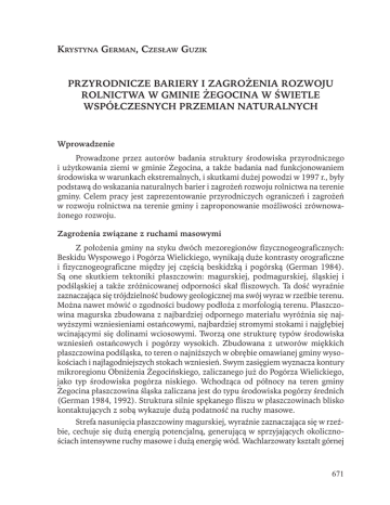 Krystyna German, Czesław Guzik PRZYRODNICZE BARIERY I ZAGROŻENIA ROZWOJU ROLNICTWA W GMINIE ŻEGOCINA W ŚWIETLE WSPÓŁCZESNYCH PRZEMIAN NATURALNYCH Wprowadzenie Prowadzone przez autorów badania struktury środowiska przyrodniczego i użytkowania ziemi w gminie Żegocina, a także badania nad funkcjonowaniem środowiska w warunkach ekstremalnych, i skutkami dużej powodzi w 1997 r., były podstawą do wskazania naturalnych barier i zagrożeń rozwoju rolnictwa na terenie gminy. Celem pracy jest zaprezentowanie przyrodniczych ograniczeń i zagrożeń w rozwoju rolnictwa na terenie gminy i zaproponowanie możliwości zrównoważonego rozwoju. Zagrożenia związane z ruchami masowymi Z położenia gminy na styku dwóch mezoregionów fizycznogeograficznych: Beskidu Wyspowego i Pogórza Wielickiego, wynikają duże kontrasty orograficzne i fizycznogeograficzne między jej częścią beskidzką i pogórską (German 1984). Są one skutkiem tektoniki płaszczowin: magurskiej, podmagurskiej, śląskiej i podśląskiej a także zróżnicowanej odporności skał fliszowych. Ta dość wyraźnie zaznaczająca się trójdzielność budowy geologicznej ma swój wyraz w rzeźbie terenu. Można nawet mówić o zgodności budowy podłoża z morfologią terenu. Płaszczowina magurska zbudowana z najbardziej odpornego materiału wyróżnia się najwyższymi wzniesieniami ostańcowymi, najbardziej stromymi stokami i najgłębiej wcinającymi się dolinami wciosowymi. Tworzą one strukturę typów środowiska wzniesień ostańcowych i pogórzy wysokich. Zbudowana z utworów miękkich płaszczowina podśląska, to teren o najniższych w obrębie omawianej gminy wysokościach i najłagodniejszych stokach wzniesień. Swym zasięgiem wyznacza kontury mikroregionu Obniżenia Żegocińskiego, zaliczanego już do Pogórza Wielickiego, jako typ środowiska pogórza niskiego. Wchodząca od północy na teren gminy Żegocina płaszczowina śląska zaliczana jest do typu środowiska pogórzy średnich (German 1984, 1992). Struktura silnie spękanego fliszu w płaszczowinach blisko kontaktujących z sobą wykazuje dużą podatność na ruchy masowe. Strefa nasunięcia płaszczowiny magurskiej, wyraźnie zaznaczająca się w rzeźbie, cechuje się dużą energią potencjalną, generującą w sprzyjających okolicznościach intensywne ruchy masowe i dużą energię wód. Wachlarzowaty kształt górnej 671 części zlewni Sanki odwadniającej zasadniczą część gminy, warunkuje zbliżoną długość jej dopływów, a w rezultacie stwarza niebezpieczeństwo nakładania się ich fal powodziowych tuż przed centrum Żegociny. Wymienione cechy środowiska wraz z niezwykle intensywnymi opadami, jakie wystąpiły w strefie granicznej Beskidu Wyspowego i Pogórza Wielickiego w lipcu 1997 r., były przyczyną największej w minionym stuleciu powodzi, która spowodowała wielkie zniszczenia, prawie na całym terenie gminy (German 1998b, 2000) W strefie granicznej regionów powstały nowe osuwiska stokowe, a ich jęzory rozpłynęły się po stokach w postaci spływów gruzowo-błotnych. W wielu miejscach na stokach i w górnej części lejów źródłowych, gdzie nie doszło do osunięcia się ziemi, obserwowano głębokie do 1 m pęknięcia i lokalne przemieszczenia gruntu, zagrażające na przyszłość stabilności stoków i znajdującej się na nich zabudowie zagrodowej, np. w przysiółku Podlas i na stokach Łopuszy. W części beskidzkiej osuwaniem jest szczególnie zagrożony południowy stok w Rozdzielu Dolnym, opadający ku dolinie potoku Rozdziele, którego powierzchnia w znacznej części została w 1997 r. przemodelowana przez duże osuwiska, spływ gruzowo-błotny, małe osuwiska, płytkie, lecz liczne przemieszczenia darni i wypływ szczelinowy, który utworzył w łące głęboką wyrwę. W wyniku tych procesów uległa zniszczeniu znaczna powierzchnia użytków zielonych oraz sadów i nadal jest ona zagrożona ruchami masowymi. Często nisze osuwisk tworzyły się w brzeżnej części lasów, a po łąkach i polach ornych rozpływał się osunięty materiał, niszcząc drugi pokos siana, i uprawy na gruntach ornych. Drzewa i krzewy owocowe w sadach przemieszczane były wraz z podłożem lub uległy pochyleniu pod naporem ciężkiej zwietrzeliny. Niestabilnością cechują się także stoki Łopuszy, na których zarówno w przeszłości, jak i w 1997 r. obserwowano podobne zjawiska (German 1998b, 2000). Na podstawie stanu środowiska przyrodniczego gminy badanego po powodzi w 1997 r., wydaje się, że właściwym przeciwdziałaniem ruchom masowym na stokach jest ich terasowanie prostopadłe do spadku, właściwe zmianowanie upraw na gruntach ornych (zboża, ziemniaki, motylkowe), przy większym udziale użytków zielonych w powierzchni ogólnej (Guzik 1981). Tak użytkowane powierzchnie stoków, chociaż częściowo zmyte, nie uległy większej degradacji podczas gwałtownych lipcowych opadów w 1997 r. Wprawdzie obserwowano wiele zerw i małych osuwisk na krawędziach teras polnych oraz akumulację na gruntach ornych, co niekiedy pociągało za sobą pojawienie się u podstawy teras wycieków i wysięków wody, ale krytykowany niekiedy nadmierny drenaż stoków na skutek sterasowania, prawdopodobnie uchronił gleby pól ornych przed wielkopowierzchniowym osuwaniem. Te małe płaty akumulacji materiału glebowego u podnóża krawędzi zostały zresztą bardzo szybko usunięte lub wyrównane przez właścicieli pól. Dzięki temu, następnego roku w tych miejscach obserwowano nawet bujniejszy wzrost roślin. Wzbogacona warstwa próchniczna poprawiła plonowanie upraw. Wąska, płaskodenna dolina Sanki na terenie Żegociny jest niemal w całości zajęta pod budownictwo. W związku z tym nowa zabudowa lokalizowana jest 672 w wyższych partiach stoków (Przybyszówka), na spłaszczeniach śródstokowych (górna część Żegociny), a nawet na wierzchowinach (Nowe, grzbiet Łopuszy, wierzchowina wododziałowa międ
