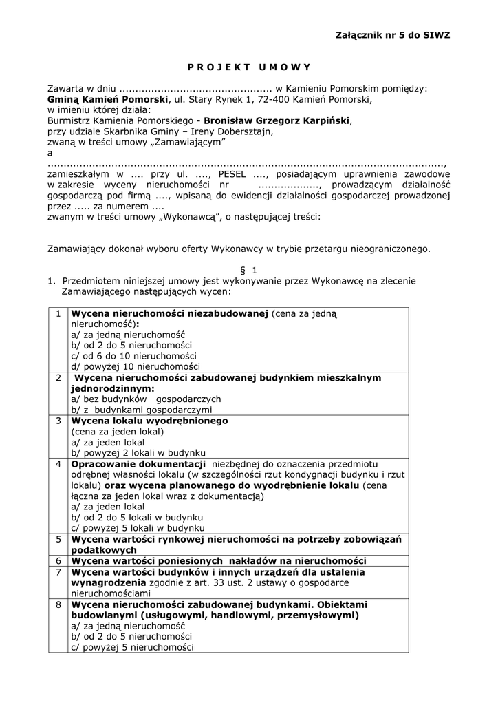 Załącznik nr 5 do SIWZ PROJEKT UMOWY Zawarta w dniu ................................................ w Kamieniu Pomorskim pomiędzy: Gminą Kamień Pomorski, ul. Stary Rynek 1, 72-400 Kamień Pomorski, w imieniu której działa: Burmistrz Kamienia Pomorskiego - Bronisław Grzegorz Karpiński, przy udziale Skarbnika Gminy – Ireny Dobersztajn, zwaną w treści umowy „Zamawiającym” a ............................................................................................................................, zamieszkałym w .... przy ul. ...., PESEL ...., posiadającym uprawnienia zawodowe w zakresie wyceny nieruchomości nr ..................., prowadzącym działalność gospodarczą pod firmą ...., wpisaną do ewidencji działalności gospodarczej prowadzonej przez ..... za numerem .... zwanym w treści umowy „Wykonawcą”, o następującej treści: Zamawiający dokonał wyboru oferty Wykonawcy w trybie przetargu nieograniczonego. § 1 1. Przedmiotem niniejszej umowy jest wykonywanie przez Wykonawcę na zlecenie Zamawiającego następujących wycen: 1 2 3 4 5 6 7 8 Wycena nieruchomości niezabudowanej (cena za jedną nieruchomość): a/ za jedną nieruchomość b/ od 2 do 5 nieruchomości c/ od 6 do 10 nieruchomości d/ powyżej 10 nieruchomości Wycena nieruchomości zabudowanej budynkiem mieszkalnym jednorodzinnym: a/ bez budynków gospodarczych b/ z budynkami gospodarczymi Wycena lokalu wyodrębnionego (cena za jeden lokal) a/ za jeden lokal b/ powyżej 2 lokali w budynku Opracowanie dokumentacji niezbędnej do oznaczenia przedmiotu odrębnej własności lokalu (w szczególności rzut kondygnacji budynku i rzut lokalu) oraz wycena planowanego do wyodrębnienie lokalu (cena łączna za jeden lokal wraz z dokumentacją) a/ za jeden lokal b/ od 2 do 5 lokali w budynku c/ powyżej 5 lokali w budynku Wycena wartości rynkowej nieruchomości na potrzeby zobowiązań podatkowych Wycena wartości poniesionych nakładów na nieruchomości Wycena wartości budynków i innych urządzeń dla ustalenia wynagrodzenia zgodnie z art. 33 ust. 2 ustawy o gospodarce nieruchomościami Wycena nieruchomości zabudowanej budynkami. Obiektami budowlanymi (usługowymi, handlowymi, przemysłowymi) a/ za jedną nieruchomość b/ od 2 do 5 nieruchomości c/ powyżej 5 nieruchomości 9 10 11 12 13 14 15 16 17 18 19 20 Wycena lokalu użytkowego lub boksu garażowego w zabudowie zwartej, wraz z udziałem w gruncie (cena za jeden lokal lub boks) – cena za jedną nieruchomość a/ za jeden lokal b/ od 2 do 5 lokali w kompleksie c/ powyżej 5 lokali w kompleksie Wycena dla potrzeb ustanowienia trwałego zarządu lub aktualizacji opłat z tego tytułu (cena za jedną nieruchomość) a/ za jedną nieruchomość b/ od 2 do 5 nieruchomości c/ powyżej 5 nieruchomości Wycena nieruchomości gruntowej niezabudowanej dla potrzeb aktualizacji opłat za użytkowanie wieczyste (cena za jedną nieruchomość) a/ za jedną nieruchomość b/ od 2 do 5 nieruchomości c/ powyżej 5 nieruchomości Wycena nieruchomości gruntowej zabudowanej dla potrzeb aktualizacji opłat za użytkowanie wieczyste (cena za jedną nieruchomość) a/ za jedną nieruchomość b/ od 2 do 5 nieruchomości c/ powyżej 5 nieruchomości Wycena nieruchomości gruntowej dla potrzeb sprzedaży w trybie art. 32 ustawy o gospodarce nieruchomościami lub przekształcenia prawa użytkowania wieczystego w prawo własności nieruchomości Wycena nieruchomości gruntowej jako przedmiotu prawa użytkowania wieczystego Wycena wartości rynkowej gruntów przeznaczonych lub zajętych pod drogi publiczne Wyceny dla potrzeb ustalenia opłat adiacenckich na podstawie art. 98 ust. 1 ustawy o gospodarce nieruchomościami (cena za jedną działkę): a/ do 5 działek b/ od 6 do 10 działek c/ od 11 do 20 działek d/ powyżej 20 działek Wycena nasadzeń ogrodniczych i elementów urządzenia terenu dla potrzeb ustalenia odszkodowania – za jedną działkę Inwentaryzacja budynków a/ za 1 m2 powierzchni użytkowej Wycena nieruchomości przeznaczonych na cele rolne lub leśne Określenie wartości służebności gruntowej §2 1. Za wykonanie prace Wykonawca otrzyma wynagrodzenie według załączonego formularza cenowego na rok 2010. 2. Wynagrodzenie ustalone w ust. 1 jest wynagrodzeniem ryczałtowym. 3. Wynagrodzenie ustalone w ust. 1 obowiązuje strony przez cały okres obowiązywania umowy, bez możliwości jego zmiany. §3 1. Wynagrodzenie płatne będzie po sporządzeniu wyceny, przekazaniu jej Zamawiającemu i przedłożeniu rachunku. 2. Wynagrodzenie płatne będzie w terminie 30 dni od daty doręczenia rachunku Zamawiającemu, na wskazany na nim rachunek bankowy. §4 Wykonawca zobowiązuje się wykonać w/w prace w terminie do 10 dni od dnia otrzymania zlecenia. § 5 Niniejsza umowa zostaje zawarta na czas oznaczony do dnia 31 grudnia 2010 r. § 6 1. W przypadku uchybienia terminom, o których mowa w §§ 4 i 6 ust. 3, Wykonawca zapłaci karę umowną w wysokości 0,2 % wynagrodzenia za wycenę, której terminowi wykonania lub poprawienia uchybił, za każdy dzień opóźnienia. 2. Strony ustalają odpowiedzialność odszkodowawczą w formie kary umownej, w przypadku odstąpienia od umowy przez jedną ze stron w wysokości 2.000 zł (słownie: dwa tysiące złotych), płatną przez stronę winną odstąpienia. 3. W przypadku stwierdzenia błędów w wykonanym operacie, Wykonawca zobowiązuje się do ich nieodpłatnego poprawienia w terminie 3 dni od daty zgłoszenia. § 7 1. Zamawiający każdorazowo zgłosi faksem, pisemnie lub drogą elektroniczną zlecenie sporządzenia wyceny. 2. Wykonawca zobowiązany jest stawić się w terminie 3 dni, licząc od dnia dokonania zgłoszenia, w siedzibie Zamawiającego celem potwierdzenia przyjęcia do realizacji zgłoszonej wyceny. 3. W przypadku nie stawienia się Wykonawcy w terminie, o którym mowa w ust. 2 oraz przekroczenia umownego terminu wykonania wyceny z winy Wykonawcy, Zamawiający może rozwiązać umowę w 
