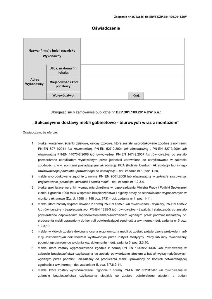 Załącznik nr 2C (wzór) do SIWZ DZP.381.109.2014.DW Oświadczenie Nazwa (firma) / imię i nazwisko Wykonawcy Ulica, nr domu / nr lokalu: Adres Wykonawcy: Miejscowość i kod pocztowy: Województwo: Kraj: Ubiegając się o zamówienie publiczne nr DZP.381.109.2014.DW p.n.: „Sukcesywne dostawy mebli gabinetowo - biurowych wraz z montażem” Oświadczam, że oferuje: 1. biurka, kontenery, ścianki działowe, osłony czołowe, które zostały wyprodukowane zgodnie z normami: PN-EN 527-1:2011 lub równoważną, PN-EN 527-2:2004 lub równoważną , PN-EN 527-3:2004 lub równoważną PN-EN 14073-2:2006 lub równoważną, PN-EN 14749:2007 lub równoważną, co zostało potwierdzone certyfikatem wystawionym przez jednostki uprawnione do certyfikowania w zakresie zgodności z ww. normami posiadającymi akredytację PCA (Polskie Centrum Akredytacji) lub innego równoważnego podmiotu uprawnionego do akredytacji – dot. zadania nr 1, poz. 1-20, 2. meble wyprodukowane zgodnie z normą PN EN 9001:2008 lub równoważną w zakresie stosowania: projektowanie, produkcja, sprzedaż i serwis mebli – dot. zadania nr 1,2,3,4, 3. biurka spełniające warunki i wymagania określone w rozporządzeniu Ministra Pracy i Polityki Społecznej z dnia 1 grudnia 1998 roku w sprawie bezpieczeństwa i higieny pracy na stanowiskach wyposażonych w monitory ekranowe (Dz. U. 1998 nr 148 poz. 973) – dot. zadania nr 1, poz. 1-11, 4. meble, które zostały wyprodukowane z normą PN-EN 1335-1 lub równoważną – wymiary, PN-EN 1335-2 lub równoważną - bezpieczeństwo, PN-EN 1335-3 lub równoważną - trwałość i stateczność co zostało potwierdzone odpowiednim raportem/atestem/sprawozdaniem wydanym przez podmiot niezależny od producenta mebli uprawniony do kontroli potwierdzającej zgodność z ww. normą– dot. zadania nr 5 poz. 1,2,3,10, 5. meble, w których została dokonana ocena ergonomiczna mebli co zostało potwierdzone protokołem lub inny równoważnym dokumentem wystawionym przez Instytut Medycyny Pracy lub inny równoważny podmiot uprawniony do wydania ww. dokumentu – dot. zadania 5, poz. 2,3,10, 6. meble, które zostały wyprodukowane zgodnie z normą PN EN 16139:2013-07 lub równoważną w zakresie bezpieczeństwa użytkowania co zostało potwierdzone atestem z badań wytrzymałościowych wydanym przez podmiot niezależny od producenta mebli uprawniony do kontroli potwierdzającej zgodność z ww. normą – dot. zadania nr 5, poz. 6,7,8,9,11, 7. meble, które zostały wyprodukowane zakresie bezpieczeństwa zgodnie z normą PN-EN 16139:2013-07 lub równoważną w użytkowania siedzisk co zostało potwierdzone atestem z badan wytrzymałościowych wydanym przez podmiot niezależny od producenta mebli uprawniony do kontroli potwierdzającej zgodność z ww. normą - dot. zadania nr 5, poz. 4,12, 8. meble, które zostały wyprodukowane zgodnie z normą PN EN 1728:2012 lub równoważną, PN EN 1022:2007 lub równoważną w zakresie wytrzymałości i trwałości użytkowania co zostało potwierdzone atestem z badań wytrzymałościowym wydanym przez podmiot niezależny od producenta mebli uprawniony do kontroli potwierdzającej zgodność z ww. normami – dot. zadania nr 5, poz. 12,13,14 9. meble, które zostały wyprodukowane zgodnie z normą PN EN 16139:2013-07 lub równoważną w zakresie bezpieczeństwa użytkowania co zostało potwierdzone atestem z badań wytrzymałościowym wydanym przez podmiot niezależny od producenta mebli uprawniony do kontroli potwierdzającej zgodność z ww. normą.– dot. zadania nr 5, poz. 13,14, 10. meble, które posiadają atest higieniczny PZH lub równoważny – dot. zadania nr 5, poz. 3,6,7,8,9,10,11, 11. meble, które zostały wyprodukowane zgodnie z normą PN EN 1729-1: 2007 lub równoważną, PN EN 1729-2:2012 lub równoważną, PN F 06009:2001 lub równoważną, co zostało potwierdzone certyfikatem wystawionym przez jednostki uprawnione do certyfikowania w zakresie zgodności z ww. normami posiadającymi akredytację PCA (Polskie Centrum Akredytacji) lub innego równoważnego podmiotu uprawnionego do akredytacji – dot. zadania nr 6, poz. 1,2, 12. trudnopalność tapicerki mebli wg normy BS EN 1021 – 1: 2 2007 lub równoważnej oraz odporność tapicerki na ścieranie wg normy BS EN ISO 12947 – 2: 2000 lub równoważnej co zostało potwierdzone raportem z badań wydanym przez podmiot niezależny od producenta mebli uprawniony do kontroli potwierdzającej zgodność z ww. normami - dot. zadania nr 5 poz. 2,3,4,5,6,11,13,14, 13. meble wyprodukowane zgodnie z normą PN EN 9001:2008 lub równoważną oraz zgodnie z normą PN EN ISO 14 001:2005 lub równoważną – dot. zadania nr 5, poz. 1,2,4,5,12, 1 14. Wskazujemy dokumenty równoważne : Poz. 1 ………………………………………………………………………… Poz. 2………………………………………………………………………… Poz. 3………………………………………………………………………… Poz. 4………………………………………………………………………… Poz. 5………………………………………………………………………… Poz. 6………………………………………………………………………… Poz. 7 ………………………………………………………………………… Poz. 8………………………………………………………………………… Poz. 9………………………………………………………………………… Poz. 10………………………………………………………………………… Poz. 11………………………………………………………………………… Poz. 12………………………………………………………………………… Poz. 13………………………………………………………………………… Zobowiązujemy się na każde żądanie Zamaw