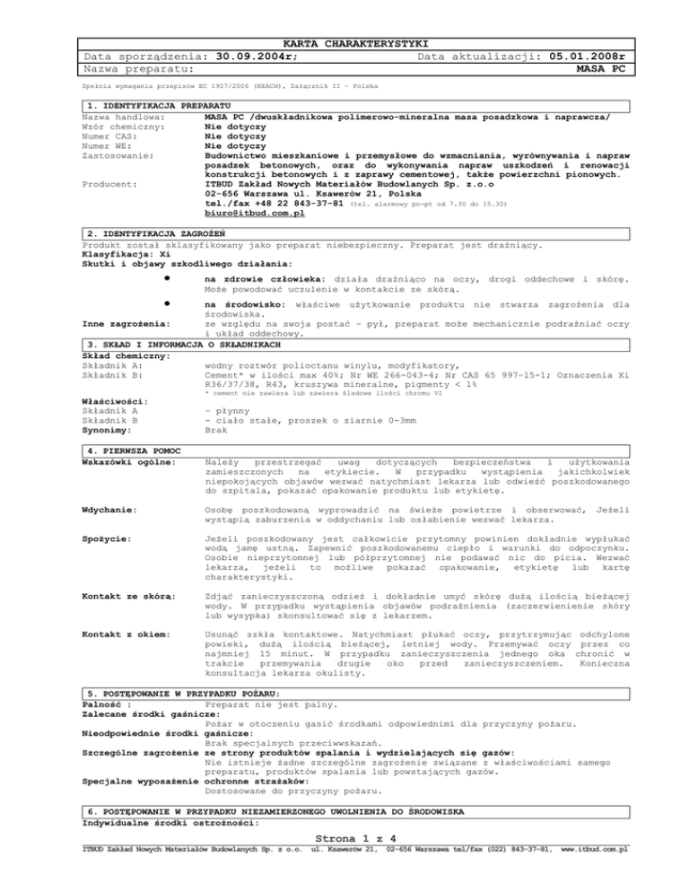 KARTA CHARAKTERYSTYKI Data sporządzenia: 30.09.2004r; Data aktualizacji: 05.01.2008r Nazwa preparatu: MASA PC Spełnia wymagania przepisów EC 1907/2006 (REACH), Załącznik II – Polska 1. IDENTYFIKACJA PREPARATU Nazwa handlowa: MASA PC /dwuskładnikowa polimerowo-mineralna masa posadzkowa i naprawcza/ Wzór chemiczny: Nie dotyczy Numer CAS: Nie dotyczy Numer WE: Nie dotyczy Zastosowanie: Budownictwo mieszkaniowe i przemysłowe do wzmacniania, wyrównywania i napraw posadzek betonowych, oraz do wykonywania napraw uszkodzeń i renowacji konstrukcji betonowych i z zaprawy cementowej, także powierzchni pionowych. Producent: ITBUD Zakład Nowych Materiałów Budowlanych Sp. z.o.o 02-656 Warszawa ul. Ksawerów 21, Polska tel./fax +48 22 843-37-81 (tel. alarmowy pn-pt od 7.30 do 15.30) [email protected] 2. IDENTYFIKACJA ZAGROŻEŃ Produkt został sklasyfikowany jako preparat niebezpieczny. Preparat jest drażniący. Klasyfikacja: Xi Skutki i objawy szkodliwego działania: na zdrowie człowieka: działa drażniąco na oczy, drogi oddechowe i skórę. Może powodować uczulenie w kontakcie ze skórą. na środowisko: właściwe użytkowanie produktu nie stwarza zagrożenia dla środowiska. Inne zagrożenia: ze względu na swoja postać – pył, preparat może mechanicznie podrażniać oczy i układ oddechowy. 3. SKŁAD I INFORMACJA O SKŁADNIKACH Skład chemiczny: Składnik A: wodny roztwór polioctanu winylu, modyfikatory, Składnik B: Cement* w ilości max 40%; Nr WE 266-043-4; Nr CAS 65 997–15-1; Oznaczenia Xi R36/37/38, R43, kruszywa mineralne, pigmenty < 1% * cement nie zawiera lub zawiera śladowe ilości chromu VI Właściwości: Składnik A Składnik B Synonimy: 4. PIERWSZA POMOC Wskazówki ogólne: – płynny - ciało stałe, proszek o ziarnie 0-3mm Brak Należy przestrzegać uwag dotyczących bezpieczeństwa i użytkowania zamieszczonych na etykiecie. W przypadku wystąpienia jakichkolwiek niepokojących objawów wezwać natychmiast lekarza lub odwieźć poszkodowanego do szpitala, pokazać opakowanie produktu lub etykietę. Wdychanie: Osobę poszkodowaną wyprowadzić na świeże powietrze i obserwować, wystąpią zaburzenia w oddychaniu lub osłabienie wezwać lekarza. Jeżeli Spożycie: Jeżeli poszkodowany jest całkowicie przytomny powinien dokładnie wypłukać wodą jamę ustną. Zapewnić poszkodowanemu ciepło i warunki do odpoczynku. Osobie nieprzytomnej lub półprzytomnej nie podawać nic do picia. Wezwać lekarza, jeżeli to możliwe pokazać opakowanie, etykietę lub kartę charakterystyki. Kontakt ze skórą: Zdjąć zanieczyszczoną odzież i dokładnie umyć skórę dużą ilością bieżącej wody. W przypadku wystąpienia objawów podrażnienia (zaczerwienienie skóry lub wysypka) skonsultować się z lekarzem. Kontakt z okiem: Usunąć szkła kontaktowe. Natychmiast płukać oczy, przytrzymując powieki, dużą ilością bieżącej, letniej wody. Przemywać oczy najmniej 15 minut. W przypadku zanieczyszczenia jednego oka trakcie przemywania drugie oko przed zanieczyszczeniem. konsultacja lekarza okulisty. odchylone przez co chronić w Konieczna 5. POSTĘPOWANIE W PRZYPADKU POŻARU: Palność : Preparat nie jest palny. Zalecane środki gaśnicze: Pożar w otoczeniu gasić środkami odpowiednimi dla przyczyny pożaru. Nieodpowiednie środki gaśnicze: Brak specjalnych przeciwwskazań. Szczególne zagrożenie ze strony produktów spalania i wydzielających się gazów: Nie istnieje żadne szczególne zagrożenie związane z właściwościami samego preparatu, produktów spalania lub powstających gazów. Specjalne wyposażenie ochronne strażaków: Dostosowane do przyczyny pożaru. 6. POSTĘPOWANIE W PRZYPADKU NIEZAMIERZONEGO UWOLNIENIA DO ŚRODOWISKA Indywidualne środki ostrożności: Strona 1 z 4 ITBUD Zakład Nowych Materiałów Budowlanych Sp. z o.o. ul. Ksawerów 21, 02-656 Warszawa tel/fax (022) 843-37-81, www.itbud.com.pl KARTA CHARAKTERYSTYKI Data sporządzenia: 30.09.2004r; Data aktualizacji: 05.01.2008r Nazwa preparatu: MASA PC Spełnia wymagania przepisów EC 1907/2006 (REACH), Załącznik II – Polska Unikać wdychania pyłu, kontaktu ze skórą i oczami. Środki ostrożności w zakresie ochrony środowiska: Nie należy dopuścić do przedostania się dużych ilości produktu do kanalizacji, wód gruntowych lub powierzchniowych oraz gleby. Metody oczyszczania/usuwania: Składnik B (stały) Odkurzyć powierzchnie lub zamieść nie wzbijając pyłów. Duże ilości odpadów usuwać zgodnie z obowiązującymi przepisami. Stwardniały pod wpływem wilgoci produkt można traktować jako gruz budowlany. Składnik A (ciekły) Zebrać do pojemnika, oczyścić zanieczyszczony teren wodą. 7. POSTĘPOWANIE Z SUBSTANCJĄ I JEJ MAGAZYNOWANIE Postępowanie z preparatem: Podczas przenoszenia unikać wzbijania pyłu. Magazynowanie: Przechowywać w zamkniętych oryginalnych opakowaniach w suchych pomieszczeniach, najlepiej na paletach. Chronić przed wilgocią – produkt pod wpływem wilgoci ulega stwardnieniu. Specyficzne zastosowania: Składnik A przechowywać temp. > 5°C. 8. KONTROLA NARAŻENIA I ŚRODKI OCHRONY INDYWIDUALNEJ Rozporządzenie Ministra Pracy i Polityki Społecznej z dnia 29 listopada 2002 roku w sprawie najwyższych dopuszczalnych stężeń i natężeń czynników szkodliwych dla zdrowia w środowisku pracy (Dz.U. nr 217 z 2002 r., poz. 1833): NDS i NDSCh: pyły cementu portlandzkiego i hutniczego: - pył całkowity NDS – 6 mg/m3 - pył respirabilny NDS mg/m3 Normy biologiczne (DSB): Brak Kontrola narażenia w miejscu pracy: Zapewnić właściwą wentylację pomieszczenia podczas pracy z preparatem oraz środki ochrony indywidualnej. Zachowywać warunki higieny pracy; nie jeść, nie pić, nie palić tytoniu w trakcie pracy. Ochrona dróg oddechowych: Jednorazowa półmaska przeciwpyłowa (w przypadku pracy w atmosferze z zawartością pyłu) Ochrona rąk: Rękawice ochronne gumowe lub z innego nieprzepuszczalnego materiału – podczas pra