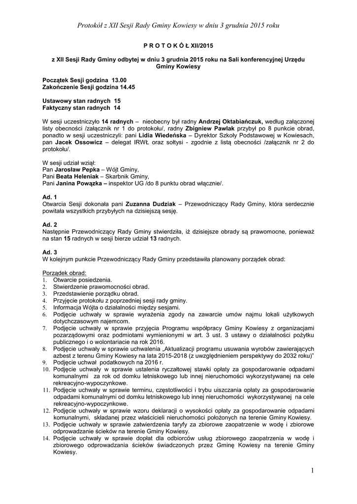 Protokół z XII Sesji Rady Gminy Kowiesy w dniu 3 grudnia 2015 roku P R O T O K Ó Ł XII/2015 z XII Sesji Rady Gminy odbytej w dniu 3 grudnia 2015 roku na Sali konferencyjnej Urzędu Gminy Kowiesy Początek Sesji godzina 13.00 Zakończenie Sesji godzina 14.45 Ustawowy stan radnych 15 Faktyczny stan radnych 14 W sesji uczestniczyło 14 radnych – nieobecny był radny Andrzej Oktabiańczuk, według załączonej listy obecności /załącznik nr 1 do protokołu/, radny Zbigniew Pawlak przybył po 8 punkcie obrad, ponadto w sesji uczestniczyli: pani Lidia Wiedeńska – Dyrektor Szkoły Podstawowej w Kowiesach, pan Jacek Ossowicz – delegat IRWŁ oraz sołtysi - zgodnie z listą obecności /załącznik nr 2 do protokołu/. W sesji udział wziął: Pan Jarosław Pepka – Wójt Gminy, Pani Beata Heleniak – Skarbnik Gminy, Pani Janina Powązka – inspektor UG /do 8 punktu obrad włącznie/. Ad. 1 Otwarcia Sesji dokonała pani Zuzanna Dudziak – Przewodniczący Rady Gminy, która serdecznie powitała wszystkich przybyłych na dzisiejszą sesję. Ad. 2 Następnie Przewodniczący Rady Gminy stwierdziła, iż dzisiejsze obrady są prawomocne, ponieważ na stan 15 radnych w sesji bierze udział 13 radnych. Ad. 3 W kolejnym punkcie Przewodniczący Rady Gminy przedstawiła planowany porządek obrad: Porządek obrad: 1. Otwarcie posiedzenia. 2. Stwierdzenie prawomocności obrad. 3. Przedstawienie porządku obrad. 4. Przyjęcie protokołu z poprzedniej sesji rady gminy. 5. Informacja Wójta o działalności między sesjami. 6. Podjęcie uchwały w sprawie wyrażenia zgody na zawarcie umów najmu lokali użytkowych dotychczasowym najemcom. 7. Podjęcie uchwały w sprawie przyjęcia Programu współpracy Gminy Kowiesy z organizacjami pozarządowymi oraz podmiotami wymienionymi w art. 3 ust. 3 ustawy o działalności pożytku publicznego i o wolontariacie na rok 2016. 8. Podjęcie uchwały w sprawie uchwalenia „Aktualizacji programu usuwania wyrobów zawierających azbest z terenu Gminy Kowiesy na lata 2015-2018 (z uwzględnieniem perspektywy do 2032 roku)” 9. Podjęcie uchwał podatkowych na 2016 r. 10. Podjęcie uchwały w sprawie ustalenia ryczałtowej stawki opłaty za gospodarowanie odpadami komunalnymi za rok od domku letniskowego lub innej nieruchomości wykorzystywanej na cele rekreacyjno-wypoczynkowe. 11. Podjęcie uchwały w sprawie terminu, częstotliwości i trybu uiszczania opłaty za gospodarowanie odpadami komunalnymi od domku letniskowego lub innej nieruchomości wykorzystywanej na cele rekreacyjno-wypoczynkowe. 12. Podjęcie uchwały w sprawie wzoru deklaracji o wysokości opłaty za gospodarowanie odpadami komunalnymi, składanej przez właścicieli nieruchomości położonych na terenie Gminy Kowiesy. 13. Podjęcie uchwały w sprawie zatwierdzenia taryfy za zbiorowe zaopatrzenie w wodę i zbiorowe odprowadzanie ścieków na terenie Gminy Kowiesy. 14. Podjęcie uchwały w sprawie dopłat dla odbiorców usług zbiorowego zaopatrzenia w wodę i zbiorowego odprowadzania ścieków świadczonych przez Gminę Kowiesy na terenie Gminy Kowiesy. 1 Protokół z XII Sesji Rady Gminy Kowiesy w dniu 3 grudnia 2015 roku 15. Podjęcie uchwały w sprawie ustalenia wysokości ekwiwalentu pieniężnego dla członków Ochotniczej Straży Pożarnej uczestniczących w działaniach ratowniczych lub szkoleniu pożarniczym organizowanym przez Państwową Straż Pożarną lub Gminę. 16. Podjęcie uchwały w sprawie zmian budżetu i w budżecie Gminy Kowiesy na 2015 rok. 17. Interpelacje i zapytania radnych. 18. Wolne wnioski i informacje. 19. Zamknięcie obrad. Nikt nie wystąpił z wnioskiem o zmianę porządku. Ad. 4 W następnym punkcie przystąpiono do przyjęcia protokołu z XI Sesji Rady Gminy w dniu 29 października 2015 r. Z uwagi na fakt, iż protokół był przesłany w materiałach treści protokołu nie odczytywano. Przy braku uwag do protokołu z XI Sesji Rady Gminy przystąpiono do jego przyjęcia w drodze głosowania. W głosowaniu jawnym za przyjęciem protokołu głosowało 13 radnych, nikt nie głosował przeciw, nikt się nie wstrzymał od głosu. Protokół został przyjęty 13 głosami. Ad. 5 Kolejny punkt to informacja Wójta o działalności między sesjami, jak poniżej: I. Zadania inwestycyjne i sprawy bieżące: 1. W listopadzie miała miejsce kontrola z WFOŚiGW w Łodzi zakończonej inwestycji pn. „Przebudowa zbiornika małej retencji wodnej w Michałowicach. Podmiot kontrolujący pozytywnie ocenił zrealizowane zadanie – brak uwag w protokole. 2. W wyniku zapytania ofertowego na udrożnienie i pogłębienie rowów oraz wykonanie poboczy wzdłuż rowów przy drodze gminnej w Chrzczonowicach /od kapliczki do wiaduktu/ wpłynęły dwie oferty od firm: EKOBAU ze Słupca – cena 44.280 zł brutto i AGAR SERWIS z Żyrardowa – cena 42.681 zł brutto. Roboty będą wykonane w grudniu br. przez AGAR SERWIS z Żyrardowa. W ramach zadania będą ułożone przepusty pod zjazdami z nieruchomości – koszt przepustów ponoszą właściciele nieruchomości. 3. Na stronie internetowej gminy i na tablicy ogłoszeń urzędu zostało umieszczone ogłoszenie o sprzedaży pługa do odśnieżania zakupionego w 2008 r. z terminem składania ofert do dnia 7 grudnia. Cena wywoławcza to 4 tys. zł. 4. W majątek gminy został w drodze umowy darowizny przekazany samochód STAR 266, który będzie służył do odśnieżania dróg gminnych. 5. 16.11. został zatrudniony na umowę na czas określony na 3 miesiące drugi pracownik na pełny etat robotnika gospodarczego. Mając zatrudnionych dwóch robotników gospodarczych nie musimy zawierać umowy zlecenia na palacza w UG. 6. 17.11. został podpisany akt notarialny na zakup działek nr 110/39 i 111/9 o łącznej powierzchni 0,4350 ha położonych w Kowiesach celem rozbudowy szkoły i zagospodarowania terenu. 7. W dniu wczorajszym została umieszczona na stronie ŁUW w Łodzi wstępna lista rankingowa wniosków o dofinansowanie w ramach Progr