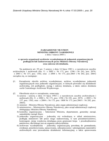 Dziennik Urzędowy Ministra Obrony Narodowej Nr 4 z dnia 17.03.2005 r., poz. 20 ZARZĄDZENIE NR 5/MON MINISTRA OBRONY NARODOWEJ z dnia 3 marca 2005 r. w sprawie organizacji archiwów wyodrębnionych jednostek organizacyjnych podległych lub nadzorowanych przez Ministra Obrony Narodowej oraz zakresu ich działania. Na podstawie art. 29 ust. 3 ustawy z dnia 14 lipca 1983 r. o narodowym zasobie archiwalnym i archiwach (Dz. U. z 2002 r. Nr 171, poz. 1396 i Nr 241, poz. 2074, z 2003 r. Nr 137, poz. 1302, oraz z 2004 r. Nr 173, poz.2065 i Nr 202, poz. 2065) zarządza się, co następuje: §1. Zarządzenie określa archiwa wyodrębnione, archiwa wyodrębnione jednostek organizacyjnych oraz jednostki organizacyjne, w których prowadzi się działalność archiwalną, ich podległość, zasięg i zakresy działania, a także zakres działania szefa Centralnego Archiwum Wojskowego. §2. Określenia użyte w zarządzeniu, oznaczają: 1) ustawa - ustawę z dnia 14 lipca 1983 r. o narodowym zasobie archiwalnym i archiwach (Dz. U. z 2002 r. Nr 171, poz. 1396 i Nr 241, poz. 2074, z 2003 r. Nr 137, poz. 1302, oraz z 2004 r. Nr 173, poz. 1808 Nr 173, poz.2065 i Nr 202, poz. 2065); 2) minister - Ministra Obrony Narodowej, jako organ administracji rządowej; 3) ministerstwo - Ministerstwo Obrony Narodowej, jako urząd administracji rządowej obsługujący Ministra Obrony Narodowej; 4) komórka organizacyjna - Sekretariat Ministra, departament, generalny zarząd, samodzielny zarząd, biuro; 5) jednostka organizacyjna - jednostkę nie wchodzącą w skład ministerstwa, podległą ministrowi lub przez niego nadzorowaną, w tym przedstawicielstwo, kontyngent, misję wojskową działającą poza granicami kraju i przedsiębiorstwo państwowe, dla którego jest on organem założycielskim; 6) archiwum wyodrębnione – jednostkę organizacyjną powołaną do gromadzenia, ewidencji, przechowywania, opracowania, zabezpieczenia i udostępniania materiałów archiwalnych oraz prowadzenia działalności informacyjnej, a także sprawowania nadzoru w komórkach organizacyjnych i jednostkach organizacyjnych w zakresie postępowania z materiałami archiwalnymi i dokumentacją niearchiwalną; 7) archiwum wyodrębnione jednostki organizacyjnej – komórkę organizacyjną powołaną w jednostce organizacyjnej w celu gromadzenia, ewidencji, przechowywania, zabezpieczenia i udostępniania materiałów archiwalnych oraz dokumentacji niearchiwalnej; 8) szef archiwum – dyrektora, kierownika archiwum. §3.1. Działalność archiwalną prowadzi wojskowa sieć archiwalna, którą tworzą jednostki organizacyjne: 1) archiwa wyodrębnione: a) Centralne Archiwum Wojskowe, b) Archiwum Instytucji Ministerstwa Obrony Narodowej, c) Archiwum Wojsk Lądowych wraz z trzema filiami, zwane dalej „Archiwum Wojsk Lądowych”, d) Archiwum Sił Powietrznych, e) Archiwum Marynarki Wojennej; 2) archiwa wyodrębnione jednostek organizacyjnych: a) Żandarmerii Wojskowej, b) Agencji Mienia Wojskowego, c) Wojskowej Agencji Mieszkaniowej, d) rejonowych zarządów infrastruktury, Stołecznego i Wojskowego Zarządu Infrastruktury oraz Biura Infrastruktury Specjalnej, e) akademii i wyższych szkół wojskowych oraz wojskowych instytutów naukowych. 2. W ramach wojskowej sieci archiwalnej działalność archiwalną prowadzą ponadto Muzeum Wojska Polskiego, Centralna Biblioteka Wojskowa, Wojskowe Biuro Badań Historycznych oraz muzea wojskowe podległe dowódcom rodzajów Sił Zbrojnych Rzeczypospolitej Polskiej i dowódcom okręgów wojskowych. §4.1. Centralne Archiwum Wojskowe obejmuje zasięg działania komórek organizacyjnych i jednostek organizacyjnych podległych lub nadzorowanych przez Ministra Obrony Narodowej funkcjonujących w kraju i za granicą. 2. Archiwum Instytucji Ministerstwa Obrony Narodowej obejmuje zasięg działania komórek organizacyjnych, jednostek organizacyjnych w Warszawie bezpośrednio podporządkowanych ministrowi, jednostek organizacyjnych bezpośrednio podporządkowanych osobom zajmującym kierownicze stanowiska ministerstwa i szefom komórek organizacyjnych, jednostek organizacyjnych w Warszawie podległych dowódcy Garnizonu Warszawa, z wyłączeniem jednostek organizacyjnych podległych dowódcom rodzajów Sił Zbrojnych Rzeczypospolite Polskiej oraz jednostek organizacyjnych, o których mowa w § 3 ust. 1 pkt. 2 i ust. 2. 3. Archiwum Wojsk Lądowych obejmuje zasięg działania jednostek organizacyjnych podległych dowódcy Wojsk Lądowych, jak też innych jednostek organizacyjnych funkcjonujących w obszarze działania tych archiwów, z wyłączeniem jednostek organizacyjnych, których materiały archiwalne wchodzą do zasobu archiwalnego Centralnego Archiwum Wojskowego i Archiwum Instytucji Ministerstwa Obrony Narodowej, a także jednostek organizacyjnych podległych dowódcom Sił Powietrznych oraz Marynarki Wojennej. 4. Archiwa, o których mowa w § 3 ust. 1 pkt 1 lit. d i e obejmują zasięg działania jednostek organizacyjnych podległych dowódcom Sił Powietrznych oraz Marynarki Wojennej, jak też innych jednostek organizacyjnych funkcjonujących w obszarze działania tych archiwów, z wyłączeniem jednostek organizacyjnych, których materiały archiwalne wchodzą do zasobu archiwalnego Centralnego Archiwum Wojskowego i Archiwum Instytucji Ministerstwa Obrony Narodowej oraz jednostek organizacyjnych podległych dowódcy Wojsk Lądowych. 5. Działalność archiwalna jednostek organizacyjnych, o których mowa w § 3 ust. 1 pkt 2 i ust. 2 obejmuje zasięg ich działania. §5. Jednostki organizacyjne, o których mowa w § 3 ust. 1 pkt 2 i ust. 2, w zakresie zgromadzonych i powstających materiałów archiwalnych podlegają przepisom ustawy i przepisom wykonawczym wydanym na jej podstawie. §6.1. Tworzenie, łączenie, przekształcanie i znoszenie archiwów wyodrębnionych, o których mowa w § 3 ust. 1 pkt 1, następuje według odrębnych przepisów. 2. Archiwa wyodrębnione podlegają: 1) Centralne Archiwum Woj