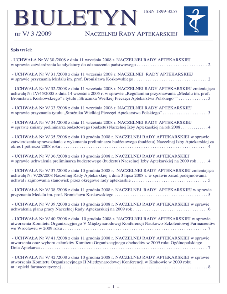 BIULETYN nr V/ 3 /2009 ISSN 1899-3257 NACZELNEJ RADY APTEKARSKIEJ _______________________________________________________________________________________________ Spis tre ci: - UCHWAŁA Nr V/ 30 /2008 z dnia 11 wrze nia 2008 r. NACZELNEJ RADY APTEKARSKIEJ w sprawie zatwierdzenia kandydatury do odznaczenia pa stwowego . . . . . . . . . . . . . . . . . . . . . . . . . . . . . . . 2 - UCHWAŁA Nr V/ 31 /2008 z dnia 11 wrze nia 2008 r. NACZELNEJ RADY APTEKARSKIEJ w sprawie przyznania Medalu im. prof. Bronisława Koskowskiego . . . . . . . . . . . . . . . . . . . . . . . . . . . . . . . . 2 - UCHWAŁA Nr V/ 32 /2008 z dnia 11 wrze nia 2008 r. NACZELNEJ RADY APTEKARSKIEJ zmieniaj ca uchwał Nr IV/45/2005 z dnia 14 wrze nia 2005 r. w sprawie „Regulaminu przyznawania „Medalu im. prof. Bronisława Koskowskiego” i tytułu „Stra nika Wielkiej Piecz ci Aptekarstwa Polskiego”” . . . . . . . . . . . . . 3 - UCHWAŁA Nr V/ 33 /2008 z dnia 11 wrze nia 2008 r. NACZELNEJ RADY APTEKARSKIEJ w sprawie przyznania tytułu „Stra nika Wielkiej Piecz ci Aptekarstwa Polskiego” . . . . . . . . . . . . . . . . . . . . 3 - UCHWAŁA Nr V/ 34 /2008 z dnia 11 wrze nia 2008 r. NACZELNEJ RADY APTEKARSKIEJ w sprawie zmiany preliminarza bud etowego (bud etu) Naczelnej Izby Aptekarskiej na rok 2008 . . . . . . . . . . . . . 4 - UCHWAŁA Nr V/ 35 /2008 z dnia 10 grudnia 2008 r. NACZELNEJ RADY APTEKARSKIEJ w sprawie zatwierdzenia sprawozdania z wykonania preliminarza bud etowego (bud etu) Naczelnej Izby Aptekarskiej za okres I półrocza 2008 roku . . . . . . . . . . . . . . . . . . . . . . . . . . . . . . . . . . . . . . . . . . . . . . . . . . . . . . . . . . . . . . . . 4 - UCHWAŁA Nr V/ 36 /2008 z dnia 10 grudnia 2008 r. NACZELNEJ RADY APTEKARSKIEJ w sprawie uchwalenia preliminarza bud etowego (bud etu) Naczelnej Izby Aptekarskiej na 2009 rok . . . . . 4 - UCHWAŁA Nr V/ 37 /2008 z dnia 10 grudnia 2008 r. NACZELNEJ RADY APTEKARSKIEJ zmieniaj ca uchwał Nr V/28/2008 Naczelnej Rady Aptekarskiej z dnia 3 lipca 2008 r. w sprawie zasad podejmowania uchwał i zajmowania stanowisk przez okr gowe rady aptekarskie . . . . . . . . . . . . . . . . . . . . . . . . . . . . . . . . . 5 - UCHWAŁA Nr V/ 38 /2008 z dnia 11 grudnia 2008 r. NACZELNEJ RADY APTEKARSKIEJ w sprawie przyznania Medalu im. prof. Bronisława Koskowskiego . . . . . . . . . . . . . . . . . . . . . . . . . . . . . . . . . . . . . . . . . 5 - UCHWAŁA Nr V/ 39 /2008 z dnia 10 grudnia 2008 r. NACZELNEJ RADY APTEKARSKIEJ w sprawie uchwalenia planu pracy Naczelnej Rady Aptekarskiej na 2009 rok . . . . . . . . . . . . . . . . . . . . . . . . . . . . . . . . . 6 - UCHWAŁA Nr V/ 40 /2008 z dnia 10 grudnia 2008 r. NACZELNEJ RADY APTEKARSKIEJ w sprawie utworzenia Komitetu Organizacyjnego V Mi dzynarodowej Konferencji Naukowo-Szkoleniowej Farmaceutów we Wrocławiu w 2009 roku . . . . . . . . . . . . . . . . . . . . . . . . . . . . . . . . . . . . . . . . . . . . . . . . . . . . . . . . . . . . . . . 7 - UCHWAŁA Nr V/ 41 /2008 z dnia 11 grudnia 2008 r. NACZELNEJ RADY APTEKARSKIEJ w sprawie utworzenia oraz wyboru członków Komitetu Organizacyjnego obchodów w 2009 roku Ogólnopolskiego Dnia Aptekarza . . . . . . . . . . . . . . . . . . . . . . . . . . . . . . . . . . . . . . . . . . . . . . . . . . . . . . . . . . . . . . . . . . . . . . . . . 7 - UCHWAŁA Nr V/ 42 /2008 z dnia 10 grudnia 2008 r. NACZELNEJ RADY APTEKARSKIEJ w sprawie utworzenia Komitetu Organizacyjnego II Mi dzynarodowej Konferencji w Krakowie w 2009 roku nt.: opieki farmaceutycznej . . . . . . . . . . . . . . . . . . . . . . . . . . . . . . . . . . . . . . . . . . . . . . . . . . . . . . . . . . . . . . . . 8 – 1 – Biuletyn Naczelnej Rady Aptekarskiej nr V/ 3 /2009 www.biuletyn.nia.org.pl - UCHWAŁA Nr V/ 43 /2008 z dnia 10 grudnia 2008 r. NACZELNEJ RADY APTEKARSKIEJ w sprawie utworzenia Komitetu Organizacyjnego II Spotka Farmaceutów Artystów Twórców Amatorów 2009 . . . . . 8 - UCHWAŁA Nr V/ 44 /2008 NACZELNEJ RADY APTEKARSKIEJ z dnia 10 grudnia 2008 r. w sprawie wyja niania w tpliwo ci dotycz cych tre ci uchwały Naczelnej Rady Aptekarskiej Nr IV/137/2007 z dnia 5 wrze nia 2007 r. w sprawie dopłat na wydawanie „Biuletynu Naczelnej Rady Aptekarskiej”. . . . . . 9 - UCHWAŁA Nr V/ 45 /2008 z dnia 10 grudnia 2008 r. NACZELNEJ RADY APTEKARSKIEJ w sprawie wyznaczenia przedstawiciela Naczelnej Rady Aptekarskiej do udziału w posiedzeniach Rady Narodowego Funduszu Zdrowia oraz do reprezentowania Rady wobec Funduszu . . . . . . . . . . . . . . . . . . . . . . . . . . . . . . . . 9 - UCHWAŁA Nr V/ 46 /2008 z dnia 10 grudnia 2008 r. NACZELNEJ RADY APTEKARSKIEJ w sprawie upowa nia Prezesa Naczelnej Rady Aptekarskiej Grzegorza Kucharewicza do reprezentowania Naczelnej Rady Aptekarskiej, w sprawie ze skargi Ewy Gle na uchwał Prezydium NRA . . . . . . . . . . . . . . . . . . . . . . . . . . . 10 - STANOWISKO Nr V/ 1 /2008 z dnia 22 pa dziernika 2008 r. PREZYDIUM NACZELNEJ RADY APTEKARSKIEJ . . . . . . . . . . . . . . . . . . . . . . . . . . . . . . . . . . . . . . . . . . . . . . . . . . . . . . . . . . . . . . . . . . . . . . . 10 ___________________ ___________________ UCHWAŁA Nr V/ 30 /2008 z dnia 11 wrze nia 2008 r. NACZELNEJ RADY APTEKARSKIEJ Na podstawie § 4 ust. 1 „Regulaminu przyznawania „Medalu im. prof. Bronisława Koskowskiego” i tytułu „Stra nika Wielkiej Piecz ci Aptekarstwa Polskiego”, w brzmieniu ustalonym uchwałami Naczelnej Rady Aptekarskiej Nr IV/45/2005 z dnia 14 wrze nia 2005 r. oraz Nr IV/132/2007 r. , Naczelna Rada Aptekarska, w drodze głosowania tajnego, uchwala, co nast puje: w sprawie zatwierdzenia kandydatury do odznaczenia pa stwowego Na podstawie art. 39 ust. 1 ustawy z dnia 19 kwietnia 1991 r. o izbach aptekarskich (t.j. Dz. U. z 2003 r. Nr 9, poz. 108 z pó n. zm.) stanowi si , co nast puje: § 1. Zatwierdza si w drodze głosowania tajnego kandydatur (zał cznik do uchwały), proponowan do odznaczenia pa stwowego z tytułu szczególnych zasłu