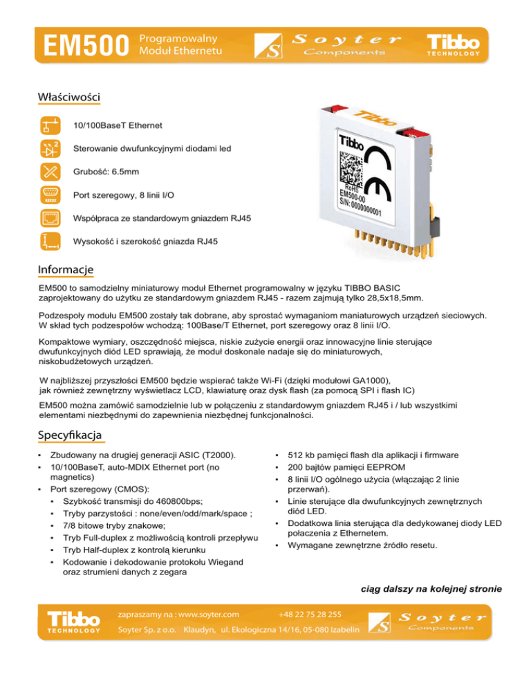 Programowalny Moduł Ethernetu Właściwości 10/100BaseT Ethernet 2 Sterowanie dwufunkcyjnymi diodami led Grubość: 6.5mm Port szeregowy, 8 linii I/O Współpraca ze standardowym gniazdem RJ45 Wysokość i szerokość gniazda RJ45 Informacje EM500 to samodzielny miniaturowy moduł Ethernet programowalny w języku TIBBO BASIC zaprojektowany do użytku ze standardowym gniazdem RJ45 - razem zajmują tylko 28,5x18,5mm. Podzespoły modułu EM500 zostały tak dobrane, aby sprostać wymaganiom maniaturowych urządzeń sieciowych. W skład tych podzespołów wchodzą: 100Base/T Ethernet, port szeregowy oraz 8 linii I/O. Kompaktowe wymiary, oszczędność miejsca, niskie zużycie energii oraz innowacyjne linie sterujące dwufunkcyjnych diód LED sprawiają, że moduł doskonale nadaje się do miniaturowych, niskobudżetowych urządzeń. W najbliższej przyszłości EM500 będzie wspierać także Wi-Fi (dzięki modułowi GA1000), jak również zewnętrzny wyświetlacz LCD, klawiaturę oraz dysk flash (za pomocą SPI i flash IC) EM500 można zamówić samodzielnie lub w połączeniu z standardowym gniazdem RJ45 i / lub wszystkimi elementami niezbędnymi do zapewnienia niezbędnej funkcjonalności. Specyfikacja ▪ ▪ ▪ Zbudowany na drugiej generacji ASIC (T2000). 10/100BaseT, auto-MDIX Ethernet port (no magnetics) Port szeregowy (CMOS): ▪ Szybkość transmisji do 460800bps; ▪ Tryby parzystości : none/even/odd/mark/space ; ▪ 7/8 bitowe tryby znakowe; ▪ Tryb Full-duplex z możliwością kontroli przepływu ▪ Tryb Half-duplex z kontrolą kierunku ▪ Kodowanie i dekodowanie protokołu Wiegand oraz strumieni danych z zegara ▪ ▪ ▪ ▪ ▪ ▪ 512 kb pamięci flash dla aplikacji i firmware 200 bajtów pamięci EEPROM 8 linii I/O ogólnego użycia (włączając 2 linie przerwań). Linie sterujące dla dwufunkcyjnych zewnętrznych diód LED. Dodatkowa linia sterująca dla dedykowanej diody LED połaczenia z Ethernetem. Wymagane zewnętrzne źródło resetu. ciąg dalszy na kolejnej stronie zapraszamy na : www.soyter.com +48 22 75 28 255 Soyter Sp. z o.o. Klaudyn, ul. Ekologiczna 14/16, 05-080 Izabelin Programowalny Moduł Ethernetu Specifikacja (ciąg dalszy) ▪ ▪ ▪ Zasilanie: 260mA @ 3.3V (100BaseT mode). Konstrukcja „pionowego plastra”; wymiary: 18.5x16.0x6.5mm. Oprogramowanie firmware może być aktualizowane za pomocą portu szeregowego bądź sieci (włączając „cold update” firmware poprzez sieci). ▪ W przyszłości dostępne będą : ▪ Interfejs Wi-Fi - opcja (wymagać będzie dodatkowego modułu GA1000). ▪ Dysk Flash (będzie wymagał zewnętrznej pamięci flash IC SPI) ▪ Obsługa zewnętrznego wyświetlacza LCD i klawiatury. Programowanie Obiekty platformy ▪ ▪ ▪ ▪ Sock — komunikacja z socketem (do 16 sesji UDP, TCP i HTTP). Net — sterowanie portem Ethernet Ser — do 4 portów szeregowych (tryby UART, Wiegand, a także zegar/dane). Io — obsługa linii I/O, portów oraz przerwań. ▪ ▪ ▪ ▪ ▪ Stor — zapewnia dostęp do pamięci EEPROM Romfile — ułatwia dostęp do plików źrodłowych (dane utrwalone). Pat — wyświetla wzory na pięciu parach diód LED Button — monitoruje linie MD (przycisk setup). Sys — odpowiada za ogólną funkcjonalność urządzenia. Grupy funkcyjne Funkcje String (razem 21!), funkcje konwersji czasu/daty, kalkulacje wartości z algorytmów (md5 i sha1). Typy zmiennych Byte, char, integer (word), short, dword, long, real, string, dodatkowo zdefiniowane przez użytkownika tablice i struktury Tibbo Integrated Development Environment (TIDE) Wszystkie programowalne w języku BASIC urządzenia marki Tibbo dostarczane są wraz z darmowym oprogramowaniem TIDE. Komfortowe kodowanie Nowoczesny edytor kodu umożliwia podświetlenie składni, pomoc konktekstową, podpowiedzi i automatyczne kompletowanie Proste debugowanie Ustawianie breakpointów, obserwacja zmiennych, inspekcja stosu, debugowanie krok po kroku. Wbudowany w Tibbo debugger zapewnia wszystkie niezbędne narzędzie do szybkiego i prostego debugowania. Debugger w Tibbo nie wymaga podłączenia typu JTAG lub ICE, ponieważ są zaimplementowane wewnątrz modułu. Wystarczy jedynie podpiąć produkt Tibbo do sieci Ethernet i jest już gotowy! Po więcej informacji odnośnie TIDE zapraszamy na : zapraszamy na : www.soyter.com http://basic.tibbo.com/product/tide.html +48 22 75 28 255 Soyter Sp. z o.o. Klaudyn, ul. Ekologiczna 14/16, 05-080 Izabelin © Tibbo Technology Inc. 2010. Tibbo is a registered trademark of Tibbo Technology Inc.