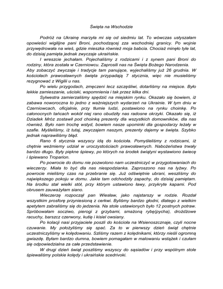 Święta na Wschodzie Podróż na Ukrainę marzyła mi się od siedmiu lat. To wówczas usłyszałam opowieści wigilijne pani Broni, pochodzącej zza wschodniej granicy. Po wojnie przywędrowała na wieś, gdzie mieszka również moja babcia. Chociaż minęło tyle lat, do dzisiaj pamięta jednak zwyczaje ukraińskie. I wreszcie jechałam. Pojechaliśmy z rodzicami i z synem pani Broni do rodziny, która została w Czerniowcu. Zaprosili nas na Święta Bożego Narodzenia. Aby zobaczyć zwyczaje i tradycje tam panujące, wyjechaliśmy już 26 grudnia. W kościołach prawosławnych święta przypadają 7 stycznia, więc nie musieliśmy rezygnować z Wigilii u nas. Po wielu przygodach, zmęczeni lecz szczęśliwi, dotarliśmy na miejsce. Było lekkie zamieszanie, uściski, wspomnienia i tak przez kilka dni. Sylwestra zamierzaliśmy spędzić na miejskim rynku. Okazało się bowiem, iż zabawa noworoczna to jedno z ważniejszych wydarzeń na Ukrainie. W tym dniu w Czerniowcach, oficjalnie, przy tłumie ludzi, postawiono na rynku choinkę. Po całonocnych tańcach wokół niej rano obudziły nas radosne okrzyki. Okazało się, iż Dziadek Mróz zostawił pod choinką prezenty dla wszystkich domowników, dla nas również. Było nam trochę wstyd, bowiem nasze upominki dla gospodarzy leżały w szafie. Myśleliśmy, iż tutaj, zwyczajem naszym, prezenty dajemy w święta. Szybko jednak naprawiliśmy błąd. Rano 6 stycznia wszyscy idą do kościoła. Pomyśleliśmy z rodzicami, iż chętnie weźmiemy udział w uroczystościach prawosławnych. Nabożeństwa trwały bardzo długo. Były piękne śpiewy, po których na środek świątyni wystawiono świecę i śpiewano Troparion. Po powrocie do domu nie pozwolono nam uczestniczyć w przygotowaniach do wieczerzy. Miała to być dla nas niespodzianka. Zaproszono nas na łyżwy. Po powrocie mieliśmy czas na przebranie się. Już odświętnie ubrani, weszliśmy do największego pokoju w domu. Jakie tam odchodziły zapachy, do dzisiaj pamiętam. Na środku stał wielki stół, przy którym ustawiono ławy, przykryte kapami. Pod obrusem zauważyłam siano. Wieczerzę rozpoczął pan Wiesław, jako najstarszy w rodzie. Rozdał wszystkim prosforę przyniesioną z cerkwi. Byliśmy bardzo głodni, dlatego z wielkim apetytem zabraliśmy się do jedzenia. Na stole ustawionych było 12 postnych potraw. Spróbowałam socziwo, pierogi z grzybami, smażoną rybę(pycha), drożdżowe racuchy, barszcz czerwony, kutię i kisiel owsiany. Po kolacji nasi przyjaciele poszli do kościoła na Wsienoszcznaje, czyli nocne czuwanie. My położyliśmy się spać. Za to w pierwszy dzień świąt chętnie uczestniczyliśmy w kolędowaniu. Szliśmy razem z kolędnikami, którzy nieśli ogromną gwiazdę. Byłam bardzo dumna, bowiem pomagałam w malowaniu wstążek i czułam się odpowiedzialna za całe przedstawienie. W drugi dzień świąt poszliśmy wszyscy do sąsiadów i przy wspólnym stole śpiewaliśmy polskie kolędy i ukraińskie scedrivoki. Skończyły się święta, skończył się nasz pobyt na Ukrainie. Była to dla mnie niezapomniana podróż, pełna wrażeń i wzruszeń. Mam nadzieję, iż w przyszłym roku nasi przyjaciele przyjadą do nas na święta i będziemy mogli zrewanżować się im takimi samymi wrażeniami. Natalia Ziętkiewicz kl. II A