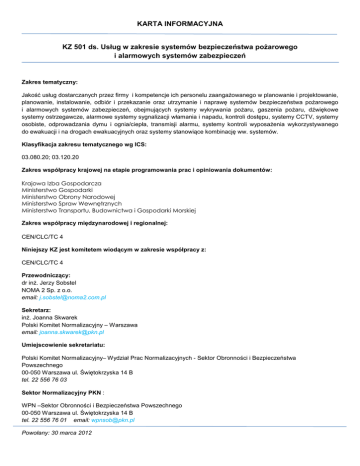 KARTA INFORMACYJNA KZ 501 ds. Usług w zakresie systemów bezpieczeństwa pożarowego i alarmowych systemów zabezpieczeń Zakres tematyczny: Jakość usług dostarczanych przez firmy i kompetencje ich personelu zaangażowanego w planowanie i projektowanie, planowanie, instalowanie, odbiór i przekazanie oraz utrzymanie i naprawę systemów bezpieczeństwa pożarowego i alarmowych systemów zabezpieczeń, obejmujących systemy wykrywania pożaru, gaszenia pożaru, dźwiękowe systemy ostrzegawcze, alarmowe systemy sygnalizacji włamania i napadu, kontroli dostępu, systemy CCTV, systemy osobiste, odprowadzania dymu i ognia/ciepła, transmisji alarmu, systemy kontroli wyposażenia wykorzystywanego do ewakuacji i na drogach ewakuacyjnych oraz systemy stanowiące kombinację ww. systemów. Klasyfikacja zakresu tematycznego wg ICS: 03.080.20; 03.120.20 Zakres współpracy krajowej na etapie programowania prac i opiniowania dokumentów: Krajowa Izba Gospodarcza Ministerstwo Gospodarki Ministerstwo Obrony Narodowej Ministerstwo Spraw Wewnętrznych Ministerstwo Transportu, Budownictwa i Gospodarki Morskiej Zakres współpracy międzynarodowej i regionalnej: CEN/CLC/TC 4 Niniejszy KZ jest komitetem wiodącym w zakresie współpracy z: CEN/CLC/TC 4 Przewodniczący: dr inż. Jerzy Sobstel NOMA 2 Sp. z o.o. email: [email protected] Sekretarz: inż. Joanna Skwarek Polski Komitet Normalizacyjny – Warszawa email: [email protected] Umiejscowienie sekretariatu: Polski Komitet Normalizacyjny– Wydział Prac Normalizacyjnych - Sektor Obronności i Bezpieczeństwa Powszechnego 00-050 Warszawa ul. Świętokrzyska 14 B tel. 22 556 76 03 Sektor Normalizacyjny PKN : WPN –Sektor Obronności i Bezpieczeństwa Powszechnego 00-050 Warszawa ul. Świętokrzyska 14 B tel. 22 556 76 01 email: [email protected] Powołany: 30 marca 2012