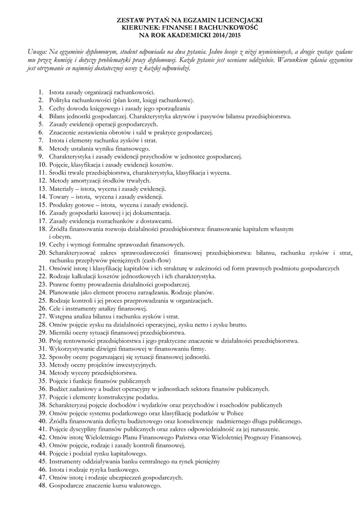 ZESTAW PYTAŃ NA EGZAMIN LICENCJACKI KIERUNEK: FINANSE I RACHUNKOWOŚĆ NA ROK AKADEMICKI 2014/2015 Uwaga: Na egzaminie dyplomowym, student odpowiada na dwa pytania. Jedno losuje z niżej wymienionych, a drugie zostaje zadane mu przez komisję i dotyczy problematyki pracy dyplomowej. Każde pytanie jest oceniane oddzielnie. Warunkiem zdania egzaminu jest otrzymanie co najmniej dostatecznej oceny z każdej odpowiedzi. 1. 2. 3. 4. 5. 6. 7. 8. 9. 10. 11. 12. 13. 14. 15. 16. 17. 18. 19. 20. 21. 22. 23. 24. 25. 26. 27. 28. 29. 30. 31. 32. 33. 34. 35. 36. 37. 38. 39. 40. 41. 42. 43. 44. 45. 46. 47. 48. Istota zasady organizacji rachunkowości. Polityka rachunkowości (plan kont, księgi rachunkowe). Cechy dowodu księgowego i zasady jego sporządzania Bilans jednostki gospodarczej. Charakterystyka aktywów i pasywów bilansu przedsiębiorstwa. Zasady ewidencji operacji gospodarczych. Znaczenie zestawienia obrotów i sald w praktyce gospodarczej. Istota i elementy rachunku zysków i strat. Metody ustalania wyniku finansowego. Charakterystyka i zasady ewidencji przychodów w jednostce gospodarczej. Pojęcie, klasyfikacja i zasady ewidencji kosztów. Środki trwałe przedsiębiorstwa, charakterystyka, klasyfikacja i wycena. Metody amortyzacji środków trwałych. Materiały – istota, wycena i zasady ewidencji. Towary – istota, wycena i zasady ewidencji. Produkty gotowe – istota, wycena i zasady ewidencji. Zasady gospodarki kasowej i jej dokumentacja. Zasady ewidencja rozrachunków z dostawcami. Źródła finansowania rozwoju działalności przedsiębiorstwa: finansowanie kapitałem własnym i obcym. Cechy i wymogi formalne sprawozdań finansowych. Scharakteryzować zakres sprawozdawczości finansowej przedsiębiorstwa: bilansu, rachunku zysków i strat, rachunku przepływów pieniężnych (cash-flow) Omówić istotę i klasyfikację kapitałów i ich strukturę w zależności od form prawnych podmiotu gospodarczych Rodzaje kalkulacji kosztów jednostkowych i ich charakterystyka. Prawne formy prowadzenia działalności gospodarczej. Planowanie jako element procesu zarządzania. Rodzaje planów. Rodzaje kontroli i jej proces przeprowadzania w organizacjach. Cele i instrumenty analizy finansowej. Wstępna analiza bilansu i rachunku zysków i strat. Omów pojęcie zysku na działalności operacyjnej, zysku netto i zysku brutto. Mierniki oceny sytuacji finansowej przedsiębiorstwa. Próg rentowności przedsiębiorstwa i jego praktyczne znaczenie w działalności przedsiębiorstwa. Wykorzystywanie dźwigni finansowej w finansowaniu firmy. Sposoby oceny pogarszającej się sytuacji finansowej jednostki. Metody oceny projektów inwestycyjnych. Metody wyceny przedsiębiorstwa. Pojęcie i funkcje finansów publicznych Budżet zadaniowy a budżet operacyjny w jednostkach sektora finansów publicznych. Pojęcie i elementy konstrukcyjne podatku. Scharakteryzuj pojęcie dochodów i wydatków oraz przychodów i rozchodów publicznych Omów pojęcie systemu podatkowego oraz klasyfikację podatków w Polsce Źródła finansowania deficytu budżetowego oraz konsekwencje nadmiernego długu publicznego. Pojęcie dyscypliny finansów publicznych oraz zakres odpowiedzialność za jej naruszenie. Omów istotę Wieloletniego Planu Finansowego Państwa oraz Wieloletniej Prognozy Finansowej. Omów pojęcie, rodzaje i zasady kontroli finansowej. Pojęcie i podział rynku kapitałowego. Instrumenty oddziaływania banku centralnego na rynek pieniężny Istota i rodzaje ryzyka bankowego. Omów istotę i rodzaje ubezpieczeń gospodarczych. Gospodarcze znaczenie kursu walutowego. 49. Europejska Unia Monetarna – zasady przystępowania do Unii i jej działania. 50. Międzynarodowe instytucje finansowe i ich rola w gospodarce światowej. PODSTAWOWA LITERATURA: 1. 2. 3. 4. 5. 6. 7. 8. 9. 10. 11. Banaszczak-Soroka U., Rynki finansowe. Organizacja, instytucje, uczestnicy, C.H. Beck, Warszawa 2012. Cebrowska T., Rachunkowość finansowa i podatkowa. PWN, Warszawa 2010. Chojna- Duch E, Podstawy finansów publicznych i prawa finansowego, LexisNexis, Warszawa 2011. Dobosiewicz Z., Bankowość, Wydawnictwo PWE, Warszawa 2011. Dziawgo D., A. Zawadzki, Finanse przedsiębiorstwa. Istota – Narzędzia – Zarządzanie, Wydawnictwo Stowarzyszenia Księgowych w Polsce, Warszawa 2011. Gabrusewicz W., Analiza finansowa przedsiębiorstwa. Teoria i zastosowanie, PWE, Warszawa 2014. Kalwasińska E., D. Maciejewska, Rachunkowość firm w teorii i praktyce (według polskiego prawa bilansowego), Wydawnictwo Naukowe WZ Uniwersytetu Warszawskiego, Warszawa 2011. Oręziak L. Finanse Unii Europejskiej, WN PWN, Warszawa 2009. Ostaszewski J. (red.), Finanse, Difin, Warszawa 2013. Sierpińska M, T. Jachna, Ocena przedsiębiorstwa według standardów światowych, WN PWN, Warszawa 20009. Skowronek C., B. Piechowicz, Analiza i kształtowanie sytuacji finansowej polskiego sektora przedsiębiorstw, Wydawnictwo Collegium Mazovia Innowacyjnej Szkoły Wyższej w Siedlcach, Siedlce 2012. 2