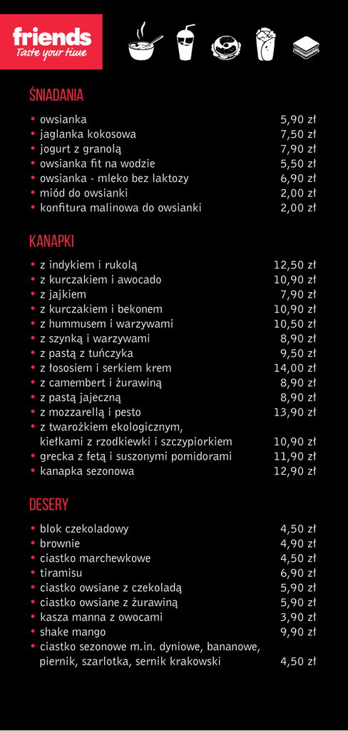 Śniadania • owsianka • jaglanka kokosowa • jogurt z granolą • owsianka fit na wodzie • owsianka - mleko bez laktozy • miód do owsianki • konfitura malinowa do owsianki 5,90 zł 7,50 zł 7,90 zł 5,50 zł 6,90 zł 2,00 zł 2,00 zł kanapki • z indykiem i rukolą • z kurczakiem i awocado • z jajkiem • z kurczakiem i bekonem • z hummusem i warzywami • z szynką i warzywami • z pastą z tuńczyka • z łososiem i serkiem krem • z camembert i żurawiną • z pastą jajeczną • z mozzarellą i pesto • z twarożkiem ekologicznym, kiełkami z rzodkiewki i szczypiorkiem • grecka z fetą i suszonymi pomidorami • kanapka sezonowa 12,50 zł 10,90 zł 7,90 zł 10,90 zł 10,50 zł 8,90 zł 9,50 zł 14,00 zł 8,90 zł 8,90 zł 13,90 zł 10,90 zł 11,90 zł 12,90 zł desery • blok czekoladowy • brownie • ciastko marchewkowe • tiramisu • ciastko owsiane z czekoladą • ciastko owsiane z żurawiną • kasza manna z owocami • shake mango • ciastko sezonowe m.in. dyniowe, bananowe, piernik, szarlotka, sernik krakowski 4,50 zł 4,90 zł 4,50 zł 6,90 zł 5,90 zł 5,90 zł 3,90 zł 9,90 zł 4,50 zł sałatki Zapytaj nas o sałatkę sezonową • kuskus z kurczakiem • z indykiem w sosie słodko-kwaśnym • z kurczakiem i ciecierzycą • grecka • zdrowy kubek z hummusem 12,90 zł 17,90 zł 12,90 zł 12,90 zł 12,40 zł wrapy • meksykański • z tuńczykiem i sambalem • z hummusem i marchewką • z szynką i jajkiem 10,90 zł 11,90 zł 9,50 zł 9,50 zł zupy Zapytaj nas o aktualne smaki, m.in.: • krem marchewkowy • krem z gruszki i pietruszki • pieczarkowa z makaronem 8,50 zł 8,50 zł 8,90 zł lunch Zapytaj nas o aktualne dania, m.in.: • kasza pęczak z oliwkami i pomidorami suszonymi • kotlet z kaszy jaglanej w sosie pieczarkowym z marchewką z groszkiem • łosoś pieczony z warzywami i ryżem • kotlet z łososia i jarmużu z ryżem • indyk z grillowanymi warzywami i ryzem • kotleciki libańskie z ryżem • kasza pęczak z indykiem i warzywami • schab w sosie grzybowym z kaszą gryczaną • spaghetti bolognese • makaron penne arrabiata • makaron z sosem serowo-cukiniowym 14,90 zł 14,90 zł 19,00 zł 17,90 zł 17,90 zł 15,90 zł 16,90 zł 16,90 zł 15,90 zł 14,90 zł 13,90 zł
