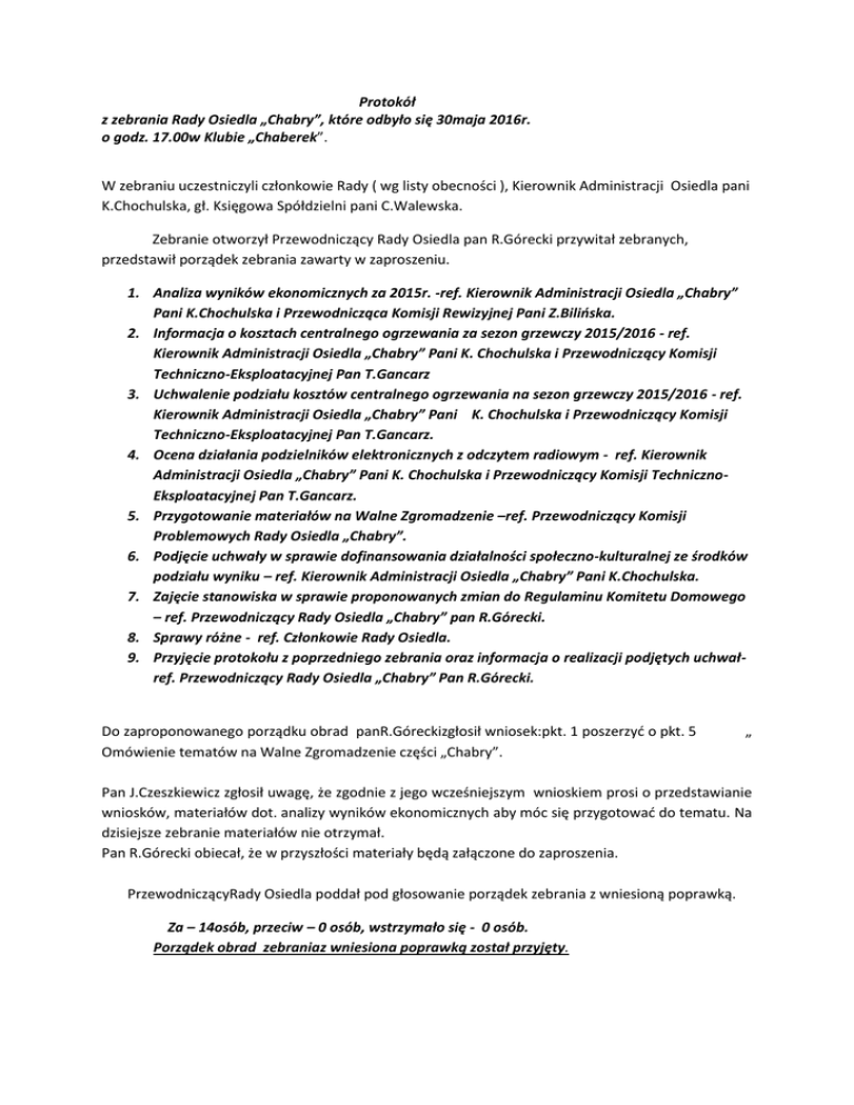 Protokół z zebrania Rady Osiedla „Chabry”, które odbyło się 30maja 2016r. o godz. 17.00w Klubie „Chaberek”. W zebraniu uczestniczyli członkowie Rady ( wg listy obecności ), Kierownik Administracji Osiedla pani K.Chochulska, gł. Księgowa Spółdzielni pani C.Walewska. Zebranie otworzył Przewodniczący Rady Osiedla pan R.Górecki przywitał zebranych, przedstawił porządek zebrania zawarty w zaproszeniu. 1. Analiza wyników ekonomicznych za 2015r. -ref. Kierownik Administracji Osiedla „Chabry” Pani K.Chochulska i Przewodnicząca Komisji Rewizyjnej Pani Z.Bilioska. 2. Informacja o kosztach centralnego ogrzewania za sezon grzewczy 2015/2016 - ref. Kierownik Administracji Osiedla „Chabry” Pani K. Chochulska i Przewodniczący Komisji Techniczno-Eksploatacyjnej Pan T.Gancarz 3. Uchwalenie podziału kosztów centralnego ogrzewania na sezon grzewczy 2015/2016 - ref. Kierownik Administracji Osiedla „Chabry” Pani K. Chochulska i Przewodniczący Komisji Techniczno-Eksploatacyjnej Pan T.Gancarz. 4. Ocena działania podzielników elektronicznych z odczytem radiowym - ref. Kierownik Administracji Osiedla „Chabry” Pani K. Chochulska i Przewodniczący Komisji TechnicznoEksploatacyjnej Pan T.Gancarz. 5. Przygotowanie materiałów na Walne Zgromadzenie –ref. Przewodniczący Komisji Problemowych Rady Osiedla „Chabry”. 6. Podjęcie uchwały w sprawie dofinansowania działalności społeczno-kulturalnej ze środków podziału wyniku – ref. Kierownik Administracji Osiedla „Chabry” Pani K.Chochulska. 7. Zajęcie stanowiska w sprawie proponowanych zmian do Regulaminu Komitetu Domowego – ref. Przewodniczący Rady Osiedla „Chabry” pan R.Górecki. 8. Sprawy różne - ref. Członkowie Rady Osiedla. 9. Przyjęcie protokołu z poprzedniego zebrania oraz informacja o realizacji podjętych uchwałref. Przewodniczący Rady Osiedla „Chabry” Pan R.Górecki. Do zaproponowanego porządku obrad panR.Góreckizgłosił wniosek:pkt. 1 poszerzyd o pkt. 5 Omówienie tematów na Walne Zgromadzenie części „Chabry”. „ Pan J.Czeszkiewicz zgłosił uwagę, że zgodnie z jego wcześniejszym wnioskiem prosi o przedstawianie wniosków, materiałów dot. analizy wyników ekonomicznych aby móc się przygotowad do tematu. Na dzisiejsze zebranie materiałów nie otrzymał. Pan R.Górecki obiecał, że w przyszłości materiały będą załączone do zaproszenia. PrzewodniczącyRady Osiedla poddał pod głosowanie porządek zebrania z wniesioną poprawką. Za – 14osób, przeciw – 0 osób, wstrzymało się - 0 osób. Porządek obrad zebraniaz wniesiona poprawką został przyjęty. Ad.1i 5 . Zebrani omówili sprawy organizacyjne związane z Walnym Zgromadzeniem części „Chabry”, które odbędzie się 11.06.16r. Pan R.Górecki przypomniał, że na Walnym Zgromadzeniu będzie przedstawiony do podziału bardzo dobry wynik finansowy Spółdzielni za 2015 rok. Wg. informacji Zarządu do podziału jest nadwyżka 2.377.600,00zł., dla Osiedla „Chabry”przypada największa kwota539 tys. zł. Jest to zasługa wszystkich organów samorządowych Spółdzielni. Pan A.Wojakowski przedstawił informację dot. realizacji tematów, których realizacja leży w gestii Gminy Opole i jest pilotowana przez Radę Osiedla : - monitoring ul. Chabrów - , - wykonanie zatoczek parkingowych przy Chabrach Południe- oświetlenie ul. Luboszyckiej - rondo przy ul. Chabrów-Luboszycka. Rada Osiedla „Chabry” zajęła stanowisko : dla Osiedla„Chabry” ważna jest bardzo dobra współpraca z Urzędem Miasta Opole. Analizy wyników ekonomicznych za 2015r. dokonała pani K.Chochulska Kierownik Administracji Osiedla „Chabry”: - eksploatacja – w kilku pozycjach jest przekroczona /zieleo – duży zakres robót : przycinka zieleni na placu rekreacyjnym, dodatkowe nasadzenia, odmłodzenie zieleni /. - fundusz remontowy – wykonany kwotowo w 94 % wynika z oszczędności na remontach bieżących - koszty administracji – najniższe ze wszystkich osiedli Spółdzielni, - zaległości – odnotowano duży spadek zaległości na lokalach mieszkalnych i użytkowych. Informację dot. analizy ekonomicznej za 2015 rok Osiedla „Chabry” przedstawiła pani Z.Bilioska przewodnicząca Komisji Rewizyjnej Rady Osiedla. Materiał stanowi zał. do protokółu. Omówiła szczegółowo: eksploatację – lokale mieszkalne, koszty działalności operacyjno- finansowej, lokale użytkowe, garaże, koszty Administracji, fundusz remontowy, działalnośd społeczno-kulturalna, zaległości czynszowe, lokaty terminowe. Pan J.Czeszkiewicz odniósł się do wyników ekonomicznych i przyznał, że Osiedle „Chabry” stało się jednym z najpiękniejszym , najlepszych i najlepiej zarządzających w Spółdzielni. Ad.2. Informację o kosztach centralnego ogrzewania za sezon grzewczy 2015/2016 przedstawiła Kierownik Administracji Osiedla „Chabry” Pani K. Chochulska. Omówiła tabelę „Koszty c.oAO”Chabry” sezon 2015/2016 – symulacja. Tabela zwiera rzeczywiste koszty c.o sezonu grzewczego 2014/2015 i koszty 2015/2016 - koszty symulacyjne (ze względu na brak f-ry za IV/16, V/16 gdzie trwał jeszcze sezon grzewczy, do symulacji przyjęto koszty takie same jak w analogicznym okresie roku 2015. ),stawki obowiązujące i wynikowe. Stawki , które obowiązują są wystarczające, koszty są podobne jak w poprzednim sezonie grzewczym. Administracja Osiedla stara się aby stawki były jak najbardziej wyważone, posiadamy sporo stawek indywidualnych. Przewodniczący Komisji Techniczno-Eksploatacyjnej Pan T.Gancarzdodał, że koszty są porównywalne, zima również była porównywalna. Rada Osiedla „Chabry” przyjęła do wiadomości informację dot. kosztów centralnego ogrzewania za sen grzewczy 2015/2016. Ad.3 Pani K.ChochulskaKierownik Osiedla „Chabry” odczytała wniosek w sprawie podziału kosztów centralnego ogrzewania za sen grzewczy 2015/2016: Administracja Osiedla „Chabry” wnioskuje o pozostawie