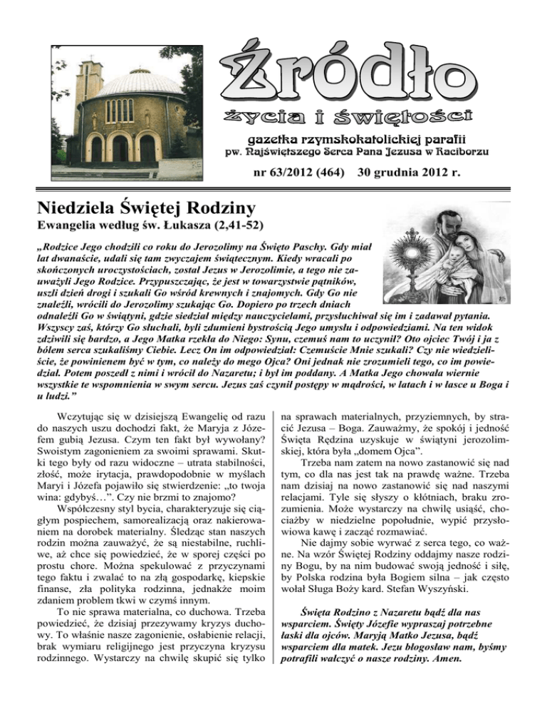 gazetka rzymskokatolickiej parafii pw. Najświętszego Serca Pana Jezusa w Raciborzu nr 63/2012 (464) 30 grudnia 2012 r. Niedziela Świętej Rodziny Ewangelia według św. Łukasza (2,41-52) „Rodzice Jego chodzili co roku do Jerozolimy na Święto Paschy. Gdy miał lat dwanaście, udali się tam zwyczajem świątecznym. Kiedy wracali po skończonych uroczystościach, został Jezus w Jerozolimie, a tego nie zauwaŜyli Jego Rodzice. Przypuszczając, Ŝe jest w towarzystwie pątników, uszli dzień drogi i szukali Go wśród krewnych i znajomych. Gdy Go nie znaleźli, wrócili do Jerozolimy szukając Go. Dopiero po trzech dniach odnaleźli Go w świątyni, gdzie siedział między nauczycielami, przysłuchiwał się im i zadawał pytania. Wszyscy zaś, którzy Go słuchali, byli zdumieni bystrością Jego umysłu i odpowiedziami. Na ten widok zdziwili się bardzo, a Jego Matka rzekła do Niego: Synu, czemuś nam to uczynił? Oto ojciec Twój i ja z bólem serca szukaliśmy Ciebie. Lecz On im odpowiedział: Czemuście Mnie szukali? Czy nie wiedzieliście, Ŝe powinienem być w tym, co naleŜy do mego Ojca? Oni jednak nie zrozumieli tego, co im powiedział. Potem poszedł z nimi i wrócił do Nazaretu; i był im poddany. A Matka Jego chowała wiernie wszystkie te wspomnienia w swym sercu. Jezus zaś czynił postępy w mądrości, w latach i w łasce u Boga i u ludzi.” Wczytując się w dzisiejszą Ewangelię od razu do naszych uszu dochodzi fakt, Ŝe Maryja z Józefem gubią Jezusa. Czym ten fakt był wywołany? Swoistym zagonieniem za swoimi sprawami. Skutki tego były od razu widoczne – utrata stabilności, złość, moŜe irytacja, prawdopodobnie w myślach Maryi i Józefa pojawiło się stwierdzenie: „to twoja wina: gdybyś…”. Czy nie brzmi to znajomo? Współczesny styl bycia, charakteryzuje się ciągłym pospiechem, samorealizacją oraz nakierowaniem na dorobek materialny. Śledząc stan naszych rodzin moŜna zauwaŜyć, Ŝe są niestabilne, ruchliwe, aŜ chce się powiedzieć, Ŝe w sporej części po prostu chore. MoŜna spekulować z przyczynami tego faktu i zwalać to na złą gospodarkę, kiepskie finanse, zła polityka rodzinna, jednakŜe moim zdaniem problem tkwi w czymś innym. To nie sprawa materialna, co duchowa. Trzeba powiedzieć, Ŝe dzisiaj przezywamy kryzys duchowy. To właśnie nasze zagonienie, osłabienie relacji, brak wymiaru religijnego jest przyczyna kryzysu rodzinnego. Wystarczy na chwilę skupić się tylko na sprawach materialnych, przyziemnych, by stracić Jezusa – Boga. ZauwaŜmy, Ŝe spokój i jedność Święta Rędzina uzyskuje w świątyni jerozolimskiej, która była „domem Ojca”. Trzeba nam zatem na nowo zastanowić się nad tym, co dla nas jest tak na prawdę waŜne. Trzeba nam dzisiaj na nowo zastanowić się nad naszymi relacjami. Tyle się słyszy o kłótniach, braku zrozumienia. MoŜe wystarczy na chwilę usiąść, chociaŜby w niedzielne popołudnie, wypić przysłowiowa kawę i zacząć rozmawiać. Nie dajmy sobie wyrwać z serca tego, co waŜne. Na wzór Świętej Rodziny oddajmy nasze rodziny Bogu, by na nim budować swoją jedność i siłę, by Polska rodzina była Bogiem silna – jak często wołał Sługa BoŜy kard. Stefan Wyszyński. Święta Rodzino z Nazaretu bądź dla nas wsparciem. Święty Józefie wypraszaj potrzebne łaski dla ojców. Maryją Matko Jezusa, bądź wsparciem dla matek. Jezu błogosław nam, byśmy potrafili wałczyć o nasze rodziny. Amen. 2 Źródło - gazetka Poniedziałek – 31 grudnia 2012 J 1,1-18 630 wolna intencja 700 Do BoŜej Opatrzności przez wstawiennictwo Matki Boskiej Nieustającej Pomocy z podziękowaniem za odebrane łaski, z prośbą o dalsze BoŜe błogosławieństwo i zdrowie dla Andrzeja i Zofii Ewy Blana z okazji 40. rocznicy ślubu 1600 NaboŜeństwo na zakończenie starego Roku 1630 1. W intencji Parafian 2. Za zmarłych w minionym miesiącu i minionym roku (zbiorowa): za † Augustynę Szramowską w rocznicę śmierci, za †† męŜa Zbigniewa, córkę Iwonę, synową Małgorzatę i rodziców, za †† męŜa i ojca Edwarda Korsistkę, rodziców z obu stron, siostrę Zofię Fuks w I rocznicę śmierci, za † Genowefę Jarosławską (w 30. dzień), za † sąsiadkę Bertę Borusiak 3. W intencji Barbary i Jana w I rocznicę ślubu z podziękowaniem za otrzymane łaski, z prośbą o dalsze BoŜe błogosławieństwo i zdrowie 4. Za † Stanisława Januszewskiego (od sąsiadów z ulicy Pomnikowej 9 – 13) Wtorek – 1 stycznia 2013 – Świętej BoŜej Rodzicielki Maryi Lb 6,22-27; Ga 4,4-7; Łk 2,16-21 015 O błogosławieństwo w intencji Parafian w całym Nowym Roku 700 Za dusze w czyśćcu cierpiące W intencji Parafian o błogosławieństwo w Nowym Roku 900 1030 Do BoŜej Opatrzności w intencji Małgorzaty w 50. rocznicę urodzin z podziękowaniem za otrzymane łaski, z prośbą o BoŜe błogosławieństwo i zdrowie na dalsze lata Ŝycia 1200 W intencji rodzin, które przyjęły odwiedziny kolędowe 1800 Za †† dziadków Władysławę i Jana, Leokadię i Michała, za wszystkich †† z rodzin Sulikowskich, Kiersztyn i Dolega oraz za dusze w czyśćcu cierpiące Środa – 2 stycznia 2013 – św. Bazylego Wielkiego i Grzegorza z Nazjanzu, biskupów i doktorów Kościoła J 1,19-28 630 1. Za †† rodziców Matyldę i Edwarda, †† z rodzin Brachaczek i Schattke, pokrewieństwo z obu stron oraz dusze w czyśćcu cierpiące 2. Za † Kazimierza Sopniewskiego w 5. rocznicę śmierci, † Ŝonę Krystynę, rodziców, teściów i †† z pokrewieństwa Do Trójcy Przenajświętszej za † Ŝonę Urszulę Slanina w 2. rocznicę śmierci (od męŜa i dzieci) 700 1730 Modlitwa Rycerstwa Niepokalanej 1800 Za † Emilię Wasiuk w 5. rocznicę śmierci I Czwartek miesiąca – 3 stycznia 2013 J 1,29-34 630 1. Za †† matkę Barbarę Rydzak, ojca Mikołaja, matkę Pelagię, ojca Filipa oraz za †† z obu stron 2. wolna intencja 700 W intencji Dawida z podziękowaniem