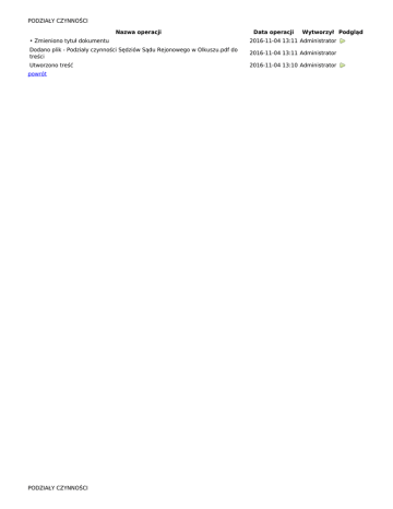 PODZIAŁY CZYNNOŚCI Nazwa operacji Data operacji Wytworzył Podgląd • Zmieniono tytuł dokumentu 2016-11-04 13:11 Administrator Dodano plik - Podziały czynności Sędziów Sądu Rejonowego w Olkuszu.pdf do treści 2016-11-04 13:11 Administrator Utworzono treść 2016-11-04 13:10 Administrator powrót PODZIAŁY CZYNNOŚCI