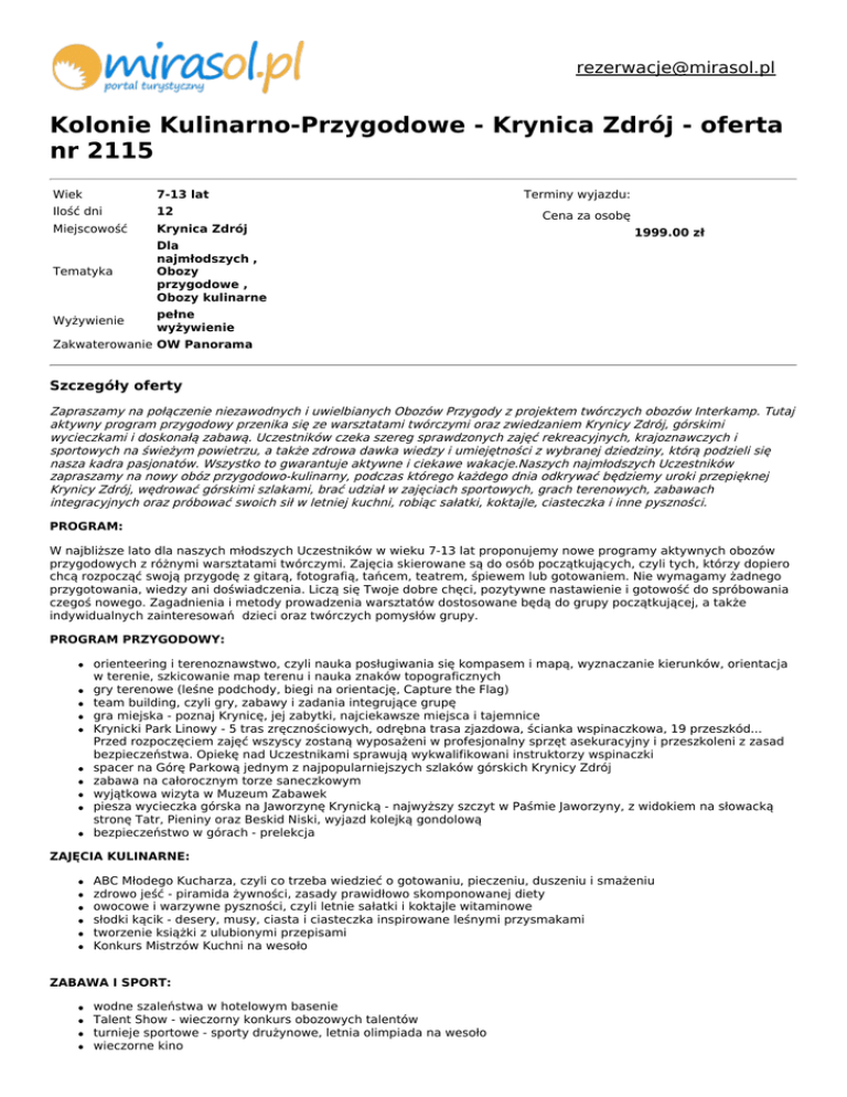 [email protected] Kolonie Kulinarno-Przygodowe - Krynica Zdrój - oferta nr 2115 Wiek 7-13 lat Ilość dni 12 Miejscowość Krynica Zdrój Tematyka Dla najmłodszych , Obozy przygodowe , Obozy kulinarne Wyżywienie pełne wyżywienie Terminy wyjazdu: Cena za osobę 1999.00 zł Zakwaterowanie OW Panorama Szczegóły oferty Zapraszamy na połączenie niezawodnych i uwielbianych Obozów Przygody z projektem twórczych obozów Interkamp. Tutaj aktywny program przygodowy przenika się ze warsztatami twórczymi oraz zwiedzaniem Krynicy Zdrój, górskimi wycieczkami i doskonałą zabawą. Uczestników czeka szereg sprawdzonych zajęć rekreacyjnych, krajoznawczych i sportowych na świeżym powietrzu, a także zdrowa dawka wiedzy i umiejętności z wybranej dziedziny, którą podzieli się nasza kadra pasjonatów. Wszystko to gwarantuje aktywne i ciekawe wakacje.Naszych najmłodszych Uczestników zapraszamy na nowy obóz przygodowo-kulinarny, podczas którego każdego dnia odkrywać będziemy uroki przepięknej Krynicy Zdrój, wędrować górskimi szlakami, brać udział w zajęciach sportowych, grach terenowych, zabawach integracyjnych oraz próbować swoich sił w letniej kuchni, robiąc sałatki, koktajle, ciasteczka i inne pyszności. PROGRAM: W najbliższe lato dla naszych młodszych Uczestników w wieku 7-13 lat proponujemy nowe programy aktywnych obozów przygodowych z różnymi warsztatami twórczymi. Zajęcia skierowane są do osób początkujących, czyli tych, którzy dopiero chcą rozpocząć swoją przygodę z gitarą, fotografią, tańcem, teatrem, śpiewem lub gotowaniem. Nie wymagamy żadnego przygotowania, wiedzy ani doświadczenia. Liczą się Twoje dobre chęci, pozytywne nastawienie i gotowość do spróbowania czegoś nowego. Zagadnienia i metody prowadzenia warsztatów dostosowane będą do grupy początkującej, a także indywidualnych zainteresowań dzieci oraz twórczych pomysłów grupy. PROGRAM PRZYGODOWY: orienteering i terenoznawstwo, czyli nauka posługiwania się kompasem i mapą, wyznaczanie kierunków, orientacja w terenie, szkicowanie map terenu i nauka znaków topograficznych gry terenowe (leśne podchody, biegi na orientację, Capture the Flag) team building, czyli gry, zabawy i zadania integrujące grupę gra miejska - poznaj Krynicę, jej zabytki, najciekawsze miejsca i tajemnice Krynicki Park Linowy - 5 tras zręcznościowych, odrębna trasa zjazdowa, ścianka wspinaczkowa, 19 przeszkód... Przed rozpoczęciem zajęć wszyscy zostaną wyposażeni w profesjonalny sprzęt asekuracyjny i przeszkoleni z zasad bezpieczeństwa. Opiekę nad Uczestnikami sprawują wykwalifikowani instruktorzy wspinaczki spacer na Górę Parkową jednym z najpopularniejszych szlaków górskich Krynicy Zdrój zabawa na całorocznym torze saneczkowym wyjątkowa wizyta w Muzeum Zabawek piesza wycieczka górska na Jaworzynę Krynicką - najwyższy szczyt w Paśmie Jaworzyny, z widokiem na słowacką stronę Tatr, Pieniny oraz Beskid Niski, wyjazd kolejką gondolową bezpieczeństwo w górach - prelekcja ZAJĘCIA KULINARNE: ABC Młodego Kucharza, czyli co trzeba wiedzieć o gotowaniu, pieczeniu, duszeniu i smażeniu zdrowo jeść - piramida żywności, zasady prawidłowo skomponowanej diety owocowe i warzywne pyszności, czyli letnie sałatki i koktajle witaminowe słodki kącik - desery, musy, ciasta i ciasteczka inspirowane leśnymi przysmakami tworzenie książki z ulubionymi przepisami Konkurs Mistrzów Kuchni na wesoło ZABAWA I SPORT: wodne szaleństwa w hotelowym basenie Talent Show - wieczorny konkurs obozowych talentów turnieje sportowe - sporty drużynowe, letnia olimpiada na wesoło wieczorne kino ognisko z kiełbaskami, konkursami i śpiewaniem przy gitarze dyskoteka z motywem przewodnim z uczestnikami innych obozów gry integracyjne i zabawy towarzyskie udział w Pokazie Finałowym wybór atrakcji dodatkowych (za dopłatą) Pakiet – każdy Uczestnik otrzymuje pakiet Interkamp zawierający T-shirt oraz wyjątkową opaskę na nadgarstek. WYŻYWIENIE: 4 posiłki dziennie (śniadanie, obiad + podwieczorek, kolacja) przygotowywane w ośrodku, od kolacji pierwszego dnia do śniadania dnia ostatniego. Suchy prowiant na drogę powrotną. CENA ZAWIERA: Zakwaterowanie (11 noclegów), wyżywienie 4 razy dziennie, bardzo aktywny program, opiekę kadry pedagogicznej i instruktorskiej oraz lekarza obozowego, pakiet Uczestnika Interkampu, śpiewnik, ubezpieczenie NNW (10.000 zł), podatek VAT. CENA NIE ZAWIERA: Dojazdu oraz dodatkowych atrakcji. Dopłaty, których realizacja uzależniona jest od ilości chętnych (min. 20 osób): Spływ pontonem Doliną Popradu – 120 zł CO ZABRAĆ: Fartuch kuchenny, mały plecak oraz wygodne buty do wycieczek pieszych, obuwie sportowe, gorszą bluzę i spodnie do zajęć terenowych, ciepły sweter lub polar, nieprzemakalną kurtkę, ręcznik, strój kąpielowy, czepek, duży ręcznik kąpielowy, krem z filtrem UV, letnie nakrycie głowy (czapkę lub chustę), latarkę z zapasem baterii, legitymację szkolną, poprawnie wypełnioną kartę kolonijną (z numerem PESEL). DODATKOWO: OBNIŻENIE KOSZTÓW REZYGNACJI W PRZYPADKU ZMIANY PLANÓW Jeżeli chcesz zarezerwować interesujący Cię obóz, na jakim jest ograniczona ilość miejsc, ale do wyjazdu zostało jeszcze wiele tygodni i nie jesteś pewny czy nie zmienisz zdania z uwagi na inne plany, wyjazd w inne miejsce ze znajomymi czy tym podobne sytuacje, proponujemy tą dodatkową usługę. Dla uniknięcia bowiem dość wysokich kosztów finansowych związanych z rezygnacją, proponujemy przy kupnie imprezy nabycie fakultatywnego Pakietu Ochronnego PARASOL lub SUPER PARASOL, pozwalającego na znaczące obniżenie kosztów wynikających z warunków uczestnictwa w wyżej wskazanych sytuacjach. Pakiet Ochronny PARASOL jest dodatkową usługą, pozwalającą znacząco zmniejszyć konsekwencje finansowe ponoszone przez Uczestnika w przypadku konieczności rezygnacji z imprezy. Opłata za Pakiet Ochronny PARA