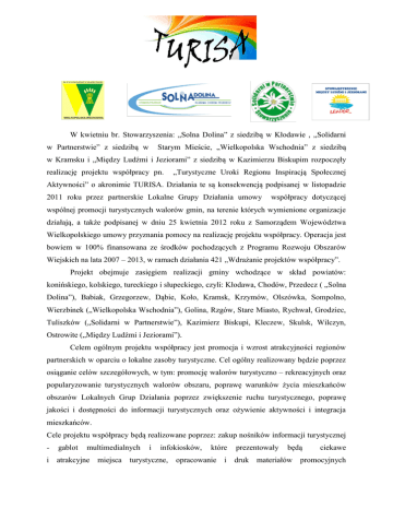 W kwietniu br. Stowarzyszenia: „Solna Dolina” z siedzibą w Kłodawie , „Solidarni w Partnerstwie” z siedzibą w Starym Mieście, „Wielkopolska Wschodnia” z siedzibą w Kramsku i „Między Ludźmi i Jeziorami” z siedzibą w Kazimierzu Biskupim rozpoczęły realizację projektu współpracy pn. „Turystyczne Uroki Regionu Inspiracją Społecznej Aktywności” o akronimie TURISA. Działania te są konsekwencją podpisanej w listopadzie 2011 roku przez partnerskie Lokalne Grupy Działania umowy współpracy dotyczącej wspólnej promocji turystycznych walorów gmin, na terenie których wymienione organizacje działają, a także podpisanej w dniu 25 kwietnia 2012 roku z Samorządem Województwa Wielkopolskiego umowy przyznania pomocy na realizację projektu współpracy. Operacja jest bowiem w 100% finansowana ze środków pochodzących z Programu Rozwoju Obszarów Wiejskich na lata 2007 – 2013, w ramach działania 421 „Wdrażanie projektów współpracy”. Projekt obejmuje zasięgiem realizacji gminy wchodzące w skład powiatów: konińskiego, kolskiego, tureckiego i słupeckiego, czyli: Kłodawa, Chodów, Przedecz ( „Solna Dolina”), Babiak, Grzegorzew, Dąbie, Koło, Kramsk, Krzymów, Olszówka, Sompolno, Wierzbinek („Wielkopolska Wschodnia”), Golina, Rzgów, Stare Miasto, Rychwał, Grodziec, Tuliszków („Solidarni w Partnerstwie”), Kazimierz Biskupi, Kleczew, Skulsk, Wilczyn, Ostrowite („Między Ludźmi i Jeziorami”). Celem ogólnym projektu współpracy jest promocja i wzrost atrakcyjności regionów partnerskich w oparciu o lokalne zasoby turystyczne. Cel ogólny realizowany będzie poprzez osiąganie celów szczegółowych, w tym: promocję walorów turystyczno – rekreacyjnych oraz popularyzowanie turystycznych walorów obszaru, poprawę warunków życia mieszkańców obszarów Lokalnych Grup Działania poprzez zwiększenie ruchu turystycznego, poprawę jakości i dostępności do informacji turystycznych oraz ożywienie aktywności i integracja mieszkańców. Cele projektu współpracy będą realizowane poprzez: zakup nośników informacji turystycznej - gablot multimedialnych i infokiosków, i atrakcyjne miejsca turystyczne, które prezentowały będą opracowanie i druk materiałów ciekawe promocyjnych i informacyjnych dotyczących projektu współpracy, a także opracowanie i publikację albumów promujących obszar Partnerów. W ramach realizacji projektu zostanie założona także wspólna strona internetowa, która prezentowała będzie turystyczne atrakcje regionów. Zaplanowano również organizację imprez promocyjnych pn. "TURISA partnerstwo LGD-ów - siłą Wielkopolski", w ramach których poszczególne Lokalne Grupy Działania prezentowały będą swoje obszary. Imprezy odbywać będą się w 2012 roku: 12 maja w Golinie, 17 czerwca w Wierzbinku, 2 września w Sławoszewku i 15 września w Kłodawie. Projekt skierowany jest przede wszystkim do mieszkańców, organizacji pozarządowych i grup nieformalnych, do turystów oraz wszystkich osób i instytucji zainteresowanych współpracą. Realizacja projektu zakończy się w listopadzie br. Całkowity budżet projektu współpracy wynosi 252.502 zł, przy czym wkład finansowy Stowarzyszenia „Solna Dolina” - 63.120 zł, Stowarzyszenia „Solidarni w Partnerstwie” - 60.000 zł, Stowarzyszenia „Wielkopolska Wschodnia” - 81.842 zł, a Stowarzyszenia „Między Ludźmi i Jeziorami” - 47.540 zł. Tworzenie partnerskich powiązań pomiędzy Lokalnymi Grupami Działania jest sposobem na przekazywanie dobrych praktyk, rozpowszechnianie innowacji i wyciąganie wniosków z doświadczeń w lokalnym rozwoju obszarów wiejskich. To także szansa na stworzenie nowego, kompleksowego i urozmaiconego produktu turystycznego. Wszelkie formy społecznej aktywności zasługują na uznanie, świadczą o zaangażowaniu i trosce o rozwój naszych lokalnych społeczności. Publikacja współfinansowana ze środków Unii Europejskiej w ramach osi 4 – LEADER Programu Rozwoju Obszarów Wiejskich na lata 2007 – 2013 w ramach działania 421 Wdrażanie projektów współpracy
