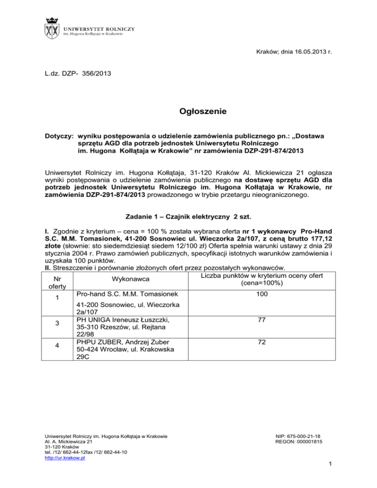 Kraków; dnia 16.05.2013 r. L.dz. DZP- 356/2013 Ogłoszenie Dotyczy: wyniku postępowania o udzielenie zamówienia publicznego pn.: „Dostawa sprzętu AGD dla potrzeb jednostek Uniwersytetu Rolniczego im. Hugona Kołłątaja w Krakowie” nr zamówienia DZP-291-874/2013 Uniwersytet Rolniczy im. Hugona Kołłątaja, 31-120 Kraków Al. Mickiewicza 21 ogłasza wyniki postępowania o udzielenie zamówienia publicznego na dostawę sprzętu AGD dla potrzeb jednostek Uniwersytetu Rolniczego im. Hugona Kołłątaja w Krakowie, nr zamówienia DZP-291-874/2013 prowadzonego w trybie przetargu nieograniczonego. Zadanie 1 – Czajnik elektryczny 2 szt. I. Zgodnie z kryterium – cena = 100 % została wybrana oferta nr 1 wykonawcy Pro-Hand S.C. M.M. Tomasionek, 41-200 Sosnowiec ul. Wieczorka 2a/107, z ceną brutto 177,12 złote (słownie: sto siedemdziesiąt siedem 12/100 zł) Oferta spełnia warunki ustawy z dnia 29 stycznia 2004 r. Prawo zamówień publicznych, specyfikacji istotnych warunków zamówienia i uzyskała 100 punktów. II. Streszczenie i porównanie złożonych ofert przez pozostałych wykonawców. Liczba punktów w kryterium oceny ofert Nr Wykonawca (cena=100%) oferty Pro-hand S.C. M.M. Tomasionek 100 1 41-200 Sosnowiec, ul. Wieczorka 2a/107 PH UNIGA Ireneusz Łuszczki, 77 3 35-310 Rzeszów, ul. Rejtana 22/98 PHPU ZUBER, Andrzej Zuber 72 4 50-424 Wrocław, ul. Krakowska 29C Uniwersytet Rolniczy im. Hugona Kołłątaja w Krakowie Al. A. Mickiewicza 21 31-120 Kraków tel. /12/ 662-44-12fax /12/ 662-44-10 http://ur.krakow.pl NIP: 675-000-21-18 REGON: 000001815 1 Zadanie 2 – Czajnik elektryczny 2 szt. I. Zgodnie z kryterium – cena = 100 % została przyjęta oferta nr 1 wykonawcy Pro-Hand S.C. M.M. Tomasionek, 41-200 Sosnowiec ul. Wieczorka 2a/107, z ceną brutto 177,12 złote (słownie: sto siedemdziesiąt siedem 12/100) Oferta spełnia warunki ustawy z dnia 29 stycznia 2004 r. Prawo zamówień publicznych, specyfikacji istotnych warunków zamówienia i uzyskała 100 punktów. II. Streszczenie o porównanie złożonych ofert przez pozostałych wykonawców. Nr oferty 1 3 4 Wykonawca Pro-hand S.C. M.M. Tomasionek 41-200 Sosnowiec, ul. Wieczorka 2a/107 PH UNIGA Ireneusz Łuszczki, 35-310 Rzeszów, ul. Rejtana 22/98 PHPU ZUBER, Andrzej Zuber 50-424 Wrocław, ul. Krakowska 29C Liczba punktów w kryterium oceny ofert (cena=100%) 100 77 72 Zadanie 3 – Ekspres do kawy 1 szt. I. Zgodnie z kryterium – cena = 100 % została wybrana oferta nr 1 wykonawcy Pro-Hand S.C. M.M. Tomasionek, 41-200 Sosnowiec ul. Wieczorka 2a/107, z ceną brutto 2 236,14, złote (słownie: dwa tysiące dwieście trzydzieści sześć 14/100). Oferta spełnia warunki ustawy z dnia 29 stycznia 2004 r. Prawo zamówień publicznych, specyfikacji istotnych warunków zamówienia i uzyskała 100 punktów. II. Streszczenie i porównanie złożonych ofert przez pozostałych wykonawców. Nr oferty 1 4 Wykonawca Liczba punktów w kryterium oceny ofert (cena=100%) Pro-hand S.C. M.M. Tomasionek 100 41-200 Sosnowiec, ul. Wieczorka 2a/107 PHPU ZUBER, Andrzej Zuber 50-424 Wrocław, ul. Krakowska 29C 98,27 Uniwersytet Rolniczy im. Hugona Kołłątaja w Krakowie Al. A. Mickiewicza 21 31-120 Kraków tel. /12/ 662-44-12fax /12/ 662-44-10 http://ur.krakow.pl NIP: 675-000-21-18 REGON: 000001815 2 Zadanie 4 – Czajnik elektryczny 20 szt. I. Zgodnie z kryterium – cena = 100 % została wybrana oferta nr 1 wykonawcy Pro-Hand S.C. M.M. Tomasionek, 41-200 Sosnowiec ul. Wieczorka 2a/107, z ceną brutto 1 771,20 złote (słownie: jeden tysiąc siedemset siedemdziesiąt jeden 20/100). Oferta spełnia warunki ustawy z dnia 29 stycznia 2004 r. Prawo zamówień publicznych, specyfikacji istotnych warunków zamówienia i uzyskała 100 punktów. II. Streszczenie i porównanie złożonych ofert przez pozostałych wykonawców: Liczba punktów w kryterium oceny ofert Nr Wykonawca (cena=100%) oferty Pro-hand S.C. M.M. Tomasionek 100 1 41-200 Sosnowiec, ul. Wieczorka 2a/107 PH UNIGA Ireneusz Łuszczki, 77 3 35-310 Rzeszów, ul. Rejtana 22/98 PHPU ZUBER, Andrzej Zuber 73,47 4 50-424 Wrocław, ul. Krakowska 29C Zadanie 5 – Odkurzacz 1 szt. I. Zgodnie z kryterium – cena = 100 % została przyjęta oferta nr 1 wykonawcy Pro-Hand S.C. M.M. Tomasionek, 41-200 Sosnowiec ul. Wieczorka 2a/107, z ceną brutto 266,91 złote (słownie: dwieście sześćdziesiąt sześć 91/100) Oferta spełnia warunki ustawy z dnia 29 stycznia 2004 r. Prawo zamówień publicznych, specyfikacji istotnych warunków zamówienia i uzyskała 100 punktów. II. Streszczenie i porównanie złożonych ofert przez pozostałych wykonawców: Liczba punktów w kryterium oceny ofert Nr Wykonawca (cena=100%) oferty Pro-hand S.C. M.M. Tomasionek 100 1 41-200 Sosnowiec, ul. Wieczorka 2a/107 PH UNIGA Ireneusz Łuszczki, 98,56 3 35-310 Rzeszów, ul. Rejtana 22/98 PHPU ZUBER, Andrzej Zuber 90,42 4 50-424 Wrocław, ul. Krakowska 29C Uniwersytet Rolniczy im. Hugona Kołłątaja w Krakowie Al. A. Mickiewicza 21 31-120 Kraków tel. /12/ 662-44-12fax /12/ 662-44-10 http://ur.krakow.pl NIP: 675-000-21-18 REGON: 000001815 3 Zadanie 6 – Zmywarka wolnostojąca 1 szt. I. Zgodnie z kryterium – cena = 100 % została wybrana oferta nr 3 wykonawcy PH UNIGA Ireneusz Łuszczki 35-310 Rzeszów ul. Rejtana 22/98, z ceną brutto 1 460,00 złote (słownie: jeden tysiąc czterysta sześćdziesiąt 00/100 zł) Oferta spełnia warunki ustawy z dnia 29 stycznia 2004 r. Prawo zamówień publicznych, specyfikacji istotnych warunków zamówienia i uzyskała 100 punktów. II. Streszczenie i porównanie złożonych ofert przez pozostałych wykonawców. Liczba punktów w kryterium oceny ofert Nr Wykonawca (cena=100%) oferty Pro-hand S.C. M.M. Tomasionek 95,73 1 41-200 Sosnowiec, ul. Wieczorka 2a/107 PH UNIGA Ireneusz Łuszczki, 100 3 35-310 Rzeszów, ul. Rejtana 22/98 PHPU ZUBER, Andrzej Zuber 91,31 4 50-424 Wrocław, ul. Krakowska 29C Zadanie 7 – Lodówka 1 szt. I. Zgodnie z kryterium – cena = 100 % została przyjęta ofe