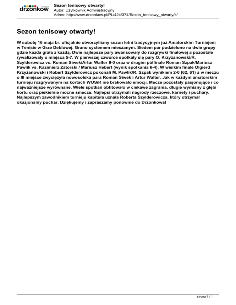 Sezon tenisowy otwarty! Autor: Użytkownik Administracyjny Adres: http://www.drzonkow.pl/PL/424/374/Sezon_tenisowy_otwarty/k/ Sezon tenisowy otwarty! W sobotę 16 maja br. oficjalnie otworzyliśmy sezon letni tradycyjnym już Amatorskim Turniejem w Tenisie w Grze Deblowej. Grano systemem mieszanym. Siedem par podzielono na dwie grupy gdzie każda grała z każdą. Dwie najlepsze pary awansowały do rozgrywki finałowej a pozostałe rywalizowały o miejsca 5-7. W pierwszej czwórce spotkały się pary O. Krzyżanowski/R. Szylderowicz vs. Roman Siwek/Artur Walter 6-0 oraz w drugim półfinale Roman Szpak/Mariusz Pawlik vs. Kazimierz Zatorski / Mariusz Hebert (wynik spotkania 6-4). W wielkim finale Olgierd Krzyżanowski i Robert Szylderowicz pokonali M. Pawlik/R. Szpak wynikiem 2-0 (62, 61) a w meczu o III miejsce zwyciężyła nowosolska para Roman Siwek i Artur Walter. Jak w każdym amatorskim turnieju rozgrywanym na kortach WOSiR nie brakowało emocji. Mecze pozostały pasjonujące i co najważniejsze wyrównane. Wiele spotkań obfitowało w ciekawe zagrania, długie wymiany z głębi kortu oraz piekielnie mocne smecze. Najlepsi otrzymali nagrody rzeczowe, karnety i puchary. Najlepszym zawodnikiem turnieju kapituła uznała Roberta Szylderowicza, który otrzymał okazjonalny puchar. Dziękujemy i zapraszamy ponownie do Drzonkowa! strona 1 / 1 Powered by TCPDF (www.tcpdf.org)