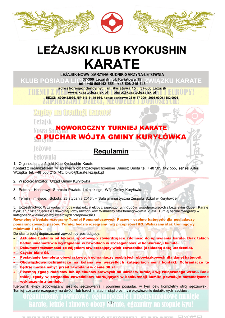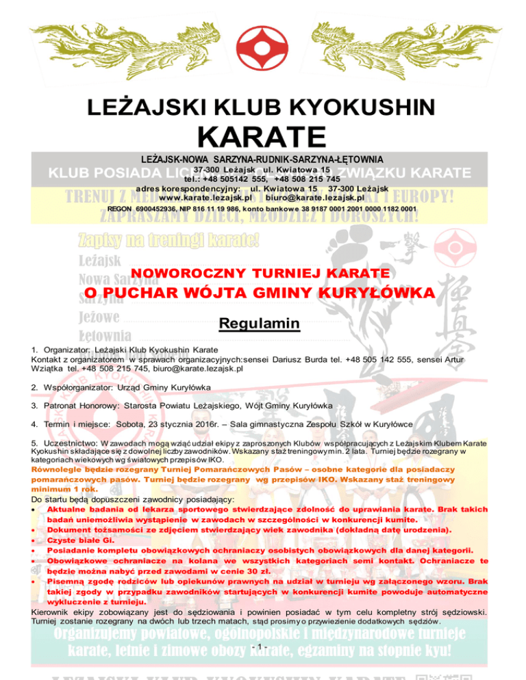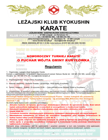 LEŻAJSKI KLUB KYOKUSHIN KARATE LEŻAJSK-NOWA SARZYNA-RUDNIK-SARZYNA-ŁĘTOWNIA 37-300 Leżajsk ul. Kwiatowa 15 tel.: +48 505142 555, +48 508 215 745 adres korespondencyjny: ul. Kwiatowa 15 37-300 Leżajsk www.karate.lezajsk.pl [email protected] REGON 6900452936, NIP 816 11 19 986, konto bankow e 38 9187 0001 2001 0000 1182 0001 NOWOROCZNY TURNIEJ KARATE O PUCHAR WÓJTA GMINY KURYŁÓWKA Regulamin 1. Organizator: Leżajski Klub Kyokushin Karate Kontakt z organizatorem w sprawach organizacyjnych:sensei Dariusz Burda tel. +48 505 142 555, sensei Artur Wziątka tel. +48 508 215 745, [email protected] 2. Współorganizator: Urząd Gminy Kuryłówka 3. Patronat Honorowy: Starosta Powiatu Leżajskiego, Wójt Gminy Kuryłówka 4. Termin i miejsce: Sobota, 23 stycznia 2016r. – Sala gimnastyczna Zespołu Szkół w Kuryłówce 5. Uczestnictwo: W zawodach mogą wziąć udział ekipy z zaproszonych Klubów współpracujących z Leżajskim Klubem Karate Kyokushin składające się z dowolnej liczby zawodników. Wskazany staż treningowy min. 2 lata. Turniej będzie rozegrany w kategoriach wiekowych wg światowych przepisów IKO. Równolegle będzie rozegrany Turniej Pomarańczowych Pasów – osobne kategorie dla posiadaczy pomarańczowych pasów. Turniej będzie rozegrany wg przepisów IKO. Wskazany staż treningowy minimum 1 rok. Do startu będą dopuszczeni zawodnicy posiadający: Aktualne badania od lekarza sportowego stwierdzające zdolność do uprawiania karate. Brak takich badań uniemożliwia wystąpienie w zawodach w szczególności w konkurencji kumite. Dokument tożsamości ze zdjęciem stwierdzający wiek zawodnika (dokładną datę urodzenia). Czyste białe Gi. Posiadanie kompletu obowiązkowych ochraniaczy osobistych obowiązkowych dla danej kategorii. Obowiązkowe ochraniacze na kolana we wszystkich kategoriach semi kontakt. Ochraniacze te będzie można nabyć przed zawodami w cenie 30 zł. Pisemną zgodę rodziców lub opiekunów prawnych na udział w turnieju wg załączonego wzoru. Brak takiej zgody w przypadku zawodników startujących w konkurencji kumite powoduje automatyczne wykluczenie z turnieju. Kierownik ekipy zobowiązany jest do sędziowania i powinien posiadać w tym celu kompletny strój sędziowski. Turniej zostanie rozegrany na dwóch lub trzech matach, stąd prosimy o przywiezienie dodatkowych sędziów. -1- NOWOROCZNY TURNIEJ KARATE O PUCHAR WÓJTA GMINY KURYŁÓWKA 6. Turniej będzie rozegrany w następujących konkurencjach: - Turniej Podstawowy Ogólny: kumite semi kontakt (wg przepisów IKO) - Turniej Pomarańczowych Pasów : kumite semi kontakt dla posiadaczy pomarańczowych pasów (wg przepisów IKO) dla osób w wieku poniżej 12 lat od stopnia 10,1 kyu lub 10 kyu do 9,3 kyu lub 9 kyu - Walka na tarczach konkurs uderzania w tarczę treningową, konkurencje z podziałem na grupy wiekowe (podział po zapisaniu zawodników): walka na tarczach przeznaczona jest dla zawodników z grup początkujących Leżajskiego Klubu Kyokushin Karate Turniej Pomarańczowych Pasów KATEGORIE KUMITE SEMI KONTAKT O przydziale do kategorii decyduje rok urodzenia! Kategorie wagowe mogą ulec zmianie, prosimy o podanie dokładnej wagi. Chłopcy: kadeci 12-13 lat (rocznik 2004-03) kadeci młodsi (chłopcy) 10-11 lat (rocznik 2006-05) dzieci (chłopcy) do 9 lat (rocznik 2007 i młodsi) Dziewczęta: kadetki 12-13 lat (rocznik 2004-03) kadetki młodsze 10-11 lat (rocznik 2006-05) dzieci (dziewczęta) do 9 lat (rocznik 2007 i młodsi) do 35 kg, do 45 kg, do 55 kg, pow. 55 kg do 30 kg, do 35 kg, do 45 kg, pow. 45 kg do 25 kg, do 30 kg, do 40 kg, pow. 40 kg do 35 kg, do 45 kg, pow. 45 kg do 35 kg, do 40 kg, pow. 40 kg do 25 kg, do 35 kg, pow. 35 kg ZASADY ROZGRYWANIA KONKURENCJI KUMITE SEMI KONTAKT Turniej rozegrany będzie indywidualnie systemem pucharowym. W kategoriach, gdzie będzie mniej niż ośmiu zawodników odbędą się walki o trzecie miejsce. Walki we wszystkich kategoriach wiekowych odbywać się będą wg przepisów IKO. Obowiązkiem zawodnika jest stawienie się do walki w regulaminowym czasie 1 minut y w komplecie ochraniaczy. Organizator nie zapewnia ww. obowiązkowych ochraniaczy osobistych. Walki odbędą się w ochraniaczach tułowia typu hogo. Przebieg i czas walki w kategoriach dzieci, kadetów młodszych, kadetów: 1 min runda podstawowa -> pierwsza dogrywka 1 min –> waga (o wyniku decyduje różnica wagi większa niż 2kg) -> druga dogrywka 0,30 min po której musi zapaść werdykt. Zawodnicy podczas walki są chronieni przez ochraniacze wg poniższej tabeli: kategoria dzieci kadeci młodsi kadeci obowiązkowe ochraniacze zapewniane przez organizatora obowiązkowe ochraniacze osobiste - białe ochraniacze goleń-stopa piąstków ki, nakolanniki mężczyźni-suspensorium białe ochraniacze goleń-stopa piąstków ki, nakolanniki mężczyźni-suspensorium białe ochraniacze goleń-stopa piąstków ki, nakolanniki mężczyźni-suspensorium - ochraniacz tułowia hogo - kask z ochroną tw arzy z (kratką) - ochraniacz tułowia hogo - kask z ochroną tw arzy z (kratką) - ochraniacz tułowia hogo - kask z ochroną tw arzy z (kratką) Turniej Podstawowy - Ogólny KATEGORIE KUMITE SEMI KONTAKT (wg przepisów IKO) O przydziale do kategorii decyduje rok urodzenia! Kategorie wagowe mogą ulec zmianie, prosimy o podanie dokładnej wagi. Chłopcy: kadeci 12 - 13 lat (rocznik 2004-03) kadeci młodsi (chłopcy) 10 - 11 lat (rocznik 2006-05) dzieci (chłopcy) do 9 lat (rocznik 2007 i młodsi) Dziewczęta: kadetki 12 - 13 lat (rocznik 2004-03) kadetki młodsze 10 - 11 lat (rocznik 2006-05) dzieci (dziewczęta) do 9 lat (rocznik 2007 i młodsi) do 45 kg, do 55 kg, pow. 55 kg do 35 kg, do 45 kg, pow. 45 kg do 25 kg, do 35 kg, pow. 35 kg do 45 kg, pow. 45 kg do 40 kg, pow. 40 kg do 35 kg, pow. 35 kg -2- NOWOROCZNY TURNIEJ KARATE O PUCHAR WÓJTA GMINY KURYŁÓWKA ZASADY ROZGRYWANIA KONKURENCJI KUMITE Turniej rozegrany będzie indywidualnie systemem pucharowym. W kategoriach, gdzie b