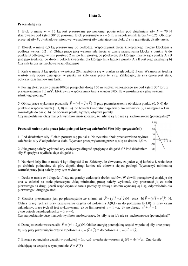 Lista 3. Praca stałej siły 1. Blok o masie m = 15 kg jest przesuwany po poziomej powierzchni pod działaniem siły F = 70 N skierowanej pod kątem 30o do poziomu. Blok przesunięto o s = 5 m, a współczynnik tarcia f = 0,25. Obliczyć pracę: a) siły F; b) składowej pionowej wypadkowej siły działającej na blok; c) siły grawitacji; d) siły tarcia. 2. Klocek o masie 0,5 kg przesuwamy po podłodze. Współczynnik tarcia kinetycznego między klockiem a podłogą wynosi 0,2 . a) Oblicz pracę jaką wykona siła tarcia w czasie przesuwania klocka z punktu A do punktu B odległego w linii prostej o 2 m: po linii prostej, po półokręgu, dla którego linia łącząca punkty A i B jest jego średnicą, po dwóch bokach kwadratu, dla którego linia łącząca punkty A i B jest jego przekątną b) Czy siła tarcia jest zachowawczą; dlaczego? 3. Kula o masie 5 kg spada z wysokości 20m zagłębiła się w piasku na głębokość 5 cm. Wyznaczyć średnią wartość siły oporu działającej w piasku na kulę oraz pracę tej siły. Zakładając, że siła oporu jest stała, obliczyć czas hamowania kulki. 4. Pociąg elektryczny o masie100ton przejechał drogę 150 m wzdłuż wznoszącego się pod kątem 30° toru z przyspieszeniem 1,5 m/s2. Efektywny współczynnik tarcia wynosi 0,05. Ile wynosiła praca jaką wykonał silnik tego pociągu? r r r r 5. Oblicz prace wykonana przez siłe F = (−i − j + k ) N przy przemieszczeniu obiektu z punktu (0, 0, 0) do punktu o współrzędnych (1, 1, 0) m: a) po bokach kwadratu: najpierw o 1m wzdłuż osi y, a następnie o 1 m równolegle do osi x; b) po odcinku prostej łączącej obydwa punkty. Czy na podstawie otrzymanych wyników możesz orzec, że siły te są lub nie są zachowawcze (potencjalne)? Praca sił zmiennych; praca jako pole pod krzywą zależności F(x) (siły sprężystości ) 1. Pod działaniem siły F ciało porusza się po osi x. Na rysunku obok przedstawiono wykres zależności siły F od położenia ciała. Wyznacz pracę wykonaną przez tę siłę na drodze 1,5 m. 2. Jaką pracę należy wykonać aby zwiększyć długość sprężyny o długość d ? Pod działaniem siły F sprężyna wydłuża się o długość a. 3. Na ziemi leży lina o masie 4 kg i długości 8 m. Załóżmy, że chwytamy za jeden z jej końców i, wchodząc po drabinie podnosimy do góry dopóki drugi koniec nie oderwie się od podłogi. Wyznaczyć minimalną wartość pracy jaką należy przy tym wykonać. 4. Deska o masie m i długości l leży na granicy zetknięcia dwóch stołów. W chwili początkowej znajduje się ona w całości na stole pierwszym. Jaką minimalną pracę należy wykonać, aby przesunąć ją ze stołu pierwszego na drugi, jeżeli współczynniki tarcia pomiędzy deską a stołem wynoszą µ1 i µ2, odpowiednio dla pierwszego i drugiego stołu. r r r r r r 5. Cząstka przesuwana jest po płaszczyźnie xy siłami: a) F = ( y 2 i + x 2 j ) N oraz b) F = ( x 2 i + y 2 j ) N. Oblicz pracę tych sił przy przesuwaniu cząstki od położenia A(0,1) m do położenia B(1,0) m przy czym zakładamy, praca tych sił jest wykonywana: a) po linii prostej y = 1 − x, b) po okręgu x2 + y2 = 1, c) po osiach współrzędnych x = 0, y = 0. Czy na podstawie otrzymanych wyników możesz orzec, że siły te są lub nie są zachowawcze (potencjalne)? r r r 6. Dana jest zachowawcza siła F = ( xi + 2 yj ) N. Oblicz energię potencjalną cząstki w polu tej siły oraz pracę r r r r r r tej siły przy przesunięciu cząstki z położenia r1 = (i + j ) m do położenia r2 = (−i + 2 j ) . r r 7. Energia potencjalna cząstki w punkcie r1 = ( x, y, z ) wyraża się wzorem E p (r ) = Ax 2 y 2 z . Znajdź siłę r r r działającą na cząstkę w tym punkcie F = F ( r ) Moc 1. Obciążona kabina windy wznosi się (ruchem jednostajnym) w ciągu 1 min na wysokość 50 m. Ile wynosi moc silnika, jeżeli masa kabiny wraz z obciążeniem jest rowna 10 ton? 2. Auto o masie 1500 kg rusza i przyspiesza jednostajnie do prędkości 10 m/s w czasie 3 sekund. Oblicz: a) pracę siły wypadkowej wykonaną nad autem; b) średnią moc silnika w pierwszych 3 sekundach ruchu; c) moc chwilową dla t = 2 sekundy. 3. Z jaką największą stałą prędkością może wjeżdżać samochód o masie 1000 kg pod wzniesienie o nachyleniu α = 300, jeżeli maksymalna moc silnika wynosi 50 kW a jego sprawność 0,8? Przyjąć, że efektywny współczynnik tarcia kół samochodu na osiach i o podłoże wynosi 0,1 opór powietrza pominąć. Zasada zachowania energii mechanicznej. Energia a praca siły niezachowawczej. 1. Paciorek nadziany na drut ślizga się bez tarcia po nachylonym drucie zakończonym pętlą (patrz rysunek obok) o promieniu R. Jeśli H = 3,5 R, to jaką prędkość ma paciorek w najwyższym punkcie pętli? Ile wynosi nacisk paciorka na drut w najniższym i najwyższym punkcie pętli? 2. W najwyższym punkcie idealnie gładkiej kuli o promieniu R znajduje się małe ciało w położeniu równowagi chwiejnej. Przy najmniejszym wychyleniu z tego położenia ciało zacznie się zsuwać po powierzchni kuli. Wyznacz kąt α jaki zatoczy promień R do chwili oderwania się ciała od powierzchni kuli. 3. Zawodnik o masie 65 kg wykonuje skok na linie z mostu. Ma on przywiązaną do nóg sprężystą linę (zamocowaną drugim końcem do mostu) o długości 20m i wartości współczynnika sprężystości 130 N/m. Zawodnik przechylając się rozpoczyna swobodne spadanie w dół. Po wyprostowaniu lina zaczyna się rozciągać i hamuje ruch zawodnika. a) Oblicz maksymalne wydłużenie liny podczas skoku. b) Oblicz maksymalną wartość prędkości skoczka. 4. Z balkonu znajdującego się na wysokości 5 m nad ziemią wypadła poduszka o masie 0,2 kg. Na poduszkę, oprócz siły grawitacji, działa siła oporu powietrza zależna od jej prędkości. Poduszka spadła na Ziemię z prędkością 8 m/s. O jakiej wartości pracę wykonała nad poduszką siła oporu powietrza? 5. Klocek 