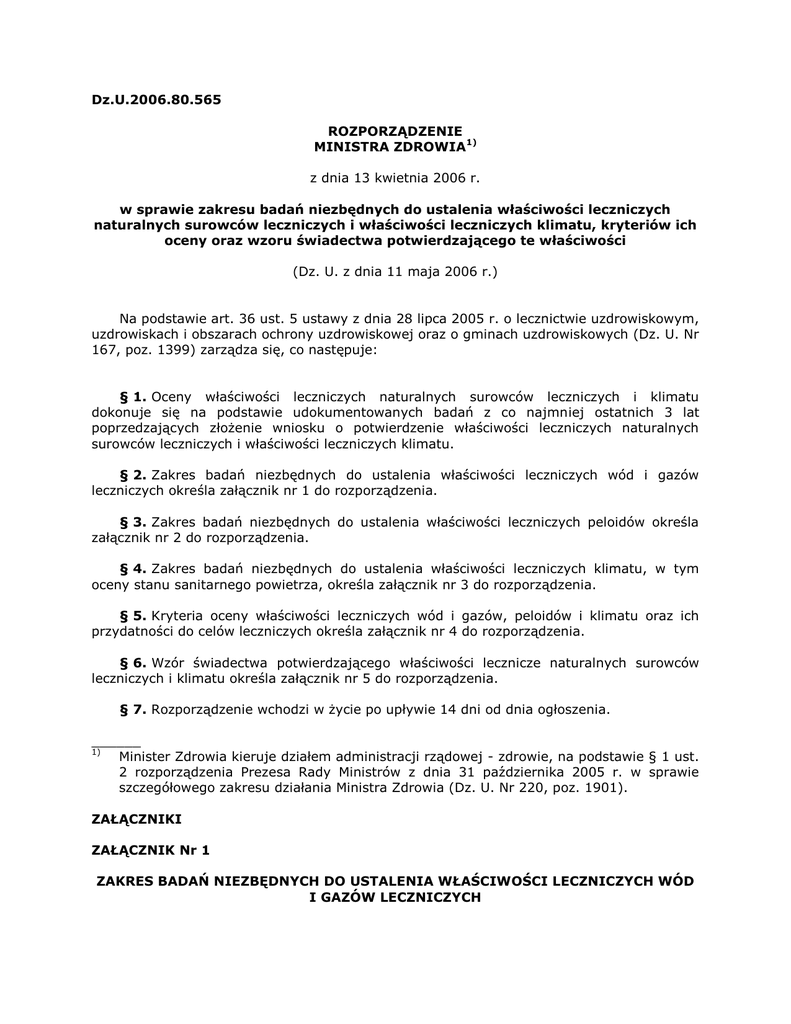 Dz.U.2006.80.565 ROZPORZĄDZENIE MINISTRA ZDROWIA1) z dnia 13 kwietnia 2006 r. w sprawie zakresu badań niezbędnych do ustalenia właściwości leczniczych naturalnych surowców leczniczych i właściwości leczniczych klimatu, kryteriów ich oceny oraz wzoru świadectwa potwierdzającego te właściwości (Dz. U. z dnia 11 maja 2006 r.) Na podstawie art. 36 ust. 5 ustawy z dnia 28 lipca 2005 r. o lecznictwie uzdrowiskowym, uzdrowiskach i obszarach ochrony uzdrowiskowej oraz o gminach uzdrowiskowych (Dz. U. Nr 167, poz. 1399) zarządza się, co następuje: § 1. Oceny właściwości leczniczych naturalnych surowców leczniczych i klimatu dokonuje się na podstawie udokumentowanych badań z co najmniej ostatnich 3 lat poprzedzających złożenie wniosku o potwierdzenie właściwości leczniczych naturalnych surowców leczniczych i właściwości leczniczych klimatu. § 2. Zakres badań niezbędnych do ustalenia właściwości leczniczych wód i gazów leczniczych określa załącznik nr 1 do rozporządzenia. § 3. Zakres badań niezbędnych do ustalenia właściwości leczniczych peloidów określa załącznik nr 2 do rozporządzenia. § 4. Zakres badań niezbędnych do ustalenia właściwości leczniczych klimatu, w tym oceny stanu sanitarnego powietrza, określa załącznik nr 3 do rozporządzenia. § 5. Kryteria oceny właściwości leczniczych wód i gazów, peloidów i klimatu oraz ich przydatności do celów leczniczych określa załącznik nr 4 do rozporządzenia. § 6. Wzór świadectwa potwierdzającego właściwości lecznicze naturalnych surowców leczniczych i klimatu określa załącznik nr 5 do rozporządzenia. § 7. Rozporządzenie wchodzi w życie po upływie 14 dni od dnia ogłoszenia. ______ 1) Minister Zdrowia kieruje działem administracji rządowej - zdrowie, na podstawie § 1 ust. 2 rozporządzenia Prezesa Rady Ministrów z dnia 31 października 2005 r. w sprawie szczegółowego zakresu działania Ministra Zdrowia (Dz. U. Nr 220, poz. 1901). ZAŁĄCZNIKI ZAŁĄCZNIK Nr 1 ZAKRES BADAŃ NIEZBĘDNYCH DO USTALENIA WŁAŚCIWOŚCI LECZNICZYCH WÓD I GAZÓW LECZNICZYCH 1. Badanie właściwości fizycznych i fizykochemicznych: odczyn wody; temperatura wody; potencjał redox; przewodność elektrolityczna właściwa mierzona na wypływie wody z ujęcia; absorbancja wody przy λ = 254 nm i λ = 436 nm; całkowita aktywność promieniotwórcza α i β, 226Ra, 222Rn. 2. Badanie składników mineralnych zdysocjowanych: 1) kationy: amonu, sodu, potasu, wapnia, magnezu, manganu, żelaza, litu, baru, strontu, miedzi, cynku, niklu, kadmu, ołowiu, chromu, selenu, arsenu, glinu, antymonu, kobaltu i rtęci; 2) aniony: fluorkowy, chlorkowy, bromkowy, jodkowy, siarczanowy, wodorowęglanowy, azotanowy (III i V), fosforanowy, siarczkowy, cyjankowy. 3. Badanie składników mineralnych niezdysocjowanych: związki boru i krzemu. 4. Badanie składników gazowych: 1) dwutlenek węgla; 2) siarkowodór; 3) radon. 5. Badanie substancji organicznych potencjalnie szkodliwych dla zdrowia i wskaźników zanieczyszczenia: 1) fenole; 2) wielopierścieniowe węglowodory aromatyczne (WWA); 3) substancje powierzchniowo czynne (anionowe); 4) pestycydy. 6. Badanie wskaźników zanieczyszczenia mikrobiologicznego: 1) bakterie grupy coli; 2) bakterie coli typu kałowego; 3) Pseudomonas aeruginosa; 4) Streptococcus faecalis; 5) Clostridia redukujące siarczyny; 6) ogólna liczba bakterii wyhodowanych na agarze w 1 dm 3 wody w temperaturach +22°C/74 h oraz +37°C/24 h. 1) 2) 3) 4) 5) 6) ZAŁĄCZNIK Nr 2 ZAKRES BADAŃ NIEZBĘDNYCH DO USTALENIA WŁAŚCIWOŚCI LECZNICZYCH PELOIDÓW 1. Badanie właściwości fizykochemicznych: barwa; konsystencja; zapach; stopień humifikacji; zawartość wody; odczyn (pH) wyciągu wodnego; chłonność wody; objętość sedymentacyjna. 2. Badanie zawartości składników: 1) nieorganicznych (ogółem), nierozpuszczalnych w 10 % kwasie solnym (krzemionka); 2) organicznych (ogółem) oraz kwasów humusowych, bitumin, pektyn, białek węglowodanów. 3. Badanie wskaźników zanieczyszczenia mikrobiologicznego: 1) bakterie grupy coli typu kałowego; 1) 2) 3) 4) 5) 6) 7) 8) i 2) 3) 4) 5) Pseudomonas aeruginosa; Staphylococcus aureus; Enterobacteriacae; Candida albicans. ZAŁĄCZNIK Nr 3 ZAKRES BADAŃ NIEZBĘDNYCH DO USTALENIA WŁAŚCIWOŚCI LECZNICZYCH KLIMATU, W TYM OCENY STANU SANITARNEGO POWIETRZA 1. Określenie warunków klimatycznych poprzez elementy klimatu, do których należą: temperatura powietrza; usłonecznienie; zachmurzenie; wilgotność względna powietrza; ciśnienie atmosferyczne i ciśnienie pary wodnej; wiatry - siła i kierunek; opady atmosferyczne; zjawiska atmosferyczne: mgła, burze, wiatr fenowy i halny, pokrywa śnieżna, gołoledź. Przy określaniu klimatu uwzględniane są trzy kategorie danych statystycznych: przeciętnego stanu albo przeciętnej sumy rocznej elementów klimatu, ich wahań oraz wartości największych odchyleń od stanu przeciętnego (absolutne maksimum, absolutne minimum). 2. Określenie zanieczyszczenia powietrza poprzez ocenę poziomów stężeń składników szkodliwych, z uwzględnieniem dopuszczalnych poziomów tych składników w powietrzu, zgodnie z rozporządzeniami Ministra Środowiska: 1) z dnia 6 czerwca 2002 r. w sprawie oceny poziomów substancji w powietrzu (Dz. U. Nr 87, poz. 798); 2) z dnia 6 czerwca 2002 r. w sprawie dopuszczalnych poziomów niektórych substancji w powietrzu, alarmowych poziomów niektórych substancji w powietrzu oraz marginesów tolerancji dla dopuszczalnych poziomów niektórych substancji (Dz. U. Nr 87, poz. 796). 3. Określenie poziomu hałasu zgodnie z rozporządzeniem Ministra Środowiska z dnia 29 lipca 2004 r. w sprawie dopuszczalnych poziomów hałasu w środowisku (Dz. U. Nr 178, poz. 1841). 4. Określenie poziomów pól elektromagnetycznych zgodnie z rozporządzeniem Ministra Środowiska z dnia 30 października 2003 r. w sprawie dopuszczalnych poziomów pól elektromagnetycznych w środowisku 