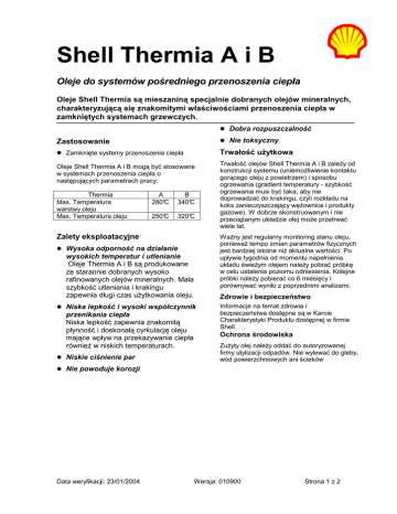 Shell Thermia A i B Oleje do systemów pośredniego przenoszenia ciepła Oleje Shell Thermia są mieszaniną specjalnie dobranych olejów mineralnych, charakteryzującą się znakomitymi właściwościami przenoszenia ciepła w zamkniętych systemach grzewczych. Dobra rozpuszczalność Zastosowanie Nie toksyczny. Zamknięte systemy przenoszenia ciepła Trwałość użytkowa Oleje Shell Thermia A i B mogą być stosowane w systemach przenoszenia ciepła o następujących parametrach pracy: Thermia Max. Temperatura warstwy oleju Max. Temperatura oleju A 280°C B 340°C 250°C 320°C Zalety eksploatacyjne Ważny jest regularny monitoring stanu oleju, ponieważ tempo zmian parametrów fizycznych jest bardziej istotne niż aktualne wartości. Po upływie tygodnia od momentu napełnienia układu świeżym olejem należy pobrać próbkę w celu ustalenia poziomu odniesienia. Kolejne próbki należy pobierać co 6 miesięcy i porównywać wyniki z poprzednimi analizami. Wysoka odporność na działanie wysokich temperatur i utlenianie Oleje Thermia A i B są produkowane ze starannie dobranych wysoko rafinowanych olejów mineralnych. Mała szybkość utleniania i krakingu zapewnia długi czas użytkowania oleju. Zdrowie i bezpieczeństwo Niska lepkość i wysoki współczynnik przenikania ciepła Niska lepkość zapewnia znakomitą płynność i doskonałą cyrkulację oleju mające wpływ na przekazywanie ciepła również w niskich temperaturach. Niskie ciśnienie par Trwałość olejów Shell Thermia A i B zależy od konstrukcji systemu (uniemożliwienie kontaktu gorącego oleju z powietrzem) i sposobu ogrzewania (gradient temperatury - szybkość ogrzewania musi być taka, aby nie doprowadzać do krakingu, czyli rozkładu na koks zanieczyszczający wężownice i produkty gazowe). W dobrze skonstruowanym i nie przeciążanym układzie olej może przetrwać wiele lat. Informacje na temat zdrowia i bezpieczeństwa dostępne są w Karcie Charakterystyki Produktu dostępnej w firmie Shell. Ochrona środowiska Zużyty olej należy oddać do autoryzowanej firmy utylizacji odpadów. Nie wylewać do gleby, wód powierzchniowych ani ścieków Nie powoduje korozji Data weryfikacji: 23/01/2004 Wersja: 010900 Strona 1 z 2 Typowe własności fizyczne A B 48 8,5 2,2 0,7 229 25 4,65 1,2 ISO 12185 893 868 Temperatura zapłonu °C (PMCC) ISO 2719 140 220 Temperatura zapłonu °C (COC) ISO 2592 150 232 Temperatura palenia °C ISO2592 175 255 Temperatura płynięcia °C ISO 3016 -60 -12 Początek wrzenia ISO 3771 285 > 355 0,0008 0,0008 DIN 51794 240 360 ASTM D974 <0,05 <0,05 Thermia 2 Lepkość kinematyczna mm /s w 0°C w 40°C w 100°C w 200°C Gęstość w 15°C kg/m 3 °C ISO 3104 Współczynnik rozszerzalności cieplnej 1/°C Temperatura samozapłonu °C Liczba kwasowa mg KOH/g Charakterystyka ta jest typowa dla obecnej produkcji.