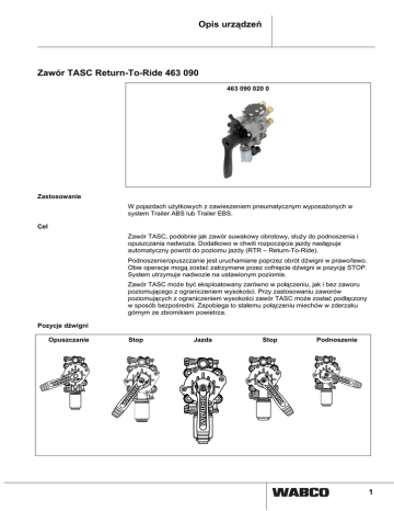 Opis urządzeń Zawór TASC Return-To-Ride 463 090 463 090 020 0 Zastosowanie W pojazdach użytkowych z zawieszeniem pneumatycznym wyposażonych w system Trailer ABS lub Trailer EBS. Cel Zawór TASC, podobnie jak zawór suwakowy obrotowy, służy do podnoszenia i opuszczania nadwozia. Dodatkowo w chwili rozpoczęcia jazdy następuje automatyczny powrót do poziomu jazdy (RTR – Return-To-Ride). Podnoszenie/opuszczanie jest uruchamiane poprzez obrót dźwigni w prawo/lewo. Obie operacje mogą zostać zatrzymane przez cofnięcie dźwigni w pozycję STOP. System utrzymuje nadwozie na ustawionym poziomie. Zawór TASC może być eksploatowany zarówno w połączeniu, jak i bez zaworu poziomującego z ograniczeniem wysokości. Przy zastosowaniu zaworów poziomujących z ograniczeniem wysokości zawór TASC może zostać podłączony w sposób bezpośredni. Zapobiega to stałemu połączeniu miechów w zderzaku górnym ze zbiornikiem powietrza. Pozycje dźwigni Opuszczanie Stop Jazda Stop Podnoszenie 1 Opis urządzeń Powrót do poziomu jazdy (RTR) Zablokowanie w pozycji opuszczania Czuwak Konserwacja Nie jest konieczne wykonywanie specjalnych czynności konserwacyjnych wykraczających poza przewidziany ustawowo zakres badań. Montaż Zawór TASC może zostać zamontowany na konsoli obsługowej przyczepy. 2 Opis urządzeń W zależności od ilości dostępnego miejsca, istnieje możliwość zamontowania urządzenia w pozycji obróconej w krokach co 90°. Dźwignia zaworu TASC może zostać obrócona tak, by umożliwić użytkownikowi jej łatwą obsługę. Przyłącze elektryczne Zawór TASC z funkcją RTR (Return-To-Ride) jest sterowany za pomocą impulsu prędkości z systemu ABS/EBS. Wyposażenie dodatkowe pojazdu w zawór TASC (w miejsce zaworu rampowego lub porównywalnego produktu) wymagać może urządzenia diagnostycznego i szkolenia w zakresie zamontowanego systemu. Systemy WABCO wymagają jednego z poniższych przewodów. Przewód System Długość 449 623 XXX 0 VCS II 6 m/6 m; 10 m/10 m 449 435 030 0 EBS D 3m 449 443 XXX 0 EBS E 0,8 m; 1 m; 2 m; 4 m; 6 m; 10 m Dane techniczne Numer części 463 090 020 0 463 090 021 0 463 090 023 0 463 090 123 0* 463 090 012 0 2-obwodowy 2-obwodowy 2-obwodowy 2-obwodowy 1-obwodowy Funkcja RTR x x x x x Zablokowanie dźwigni w pozycji opuszczania x x x – x 8x1 8x1 M 16x1,5 M 16x1,5 M 16x1,5 x – – – x Przyłącze pneumatyczne Przyłącze kontrolne Ciśnienie robocze 3,5 … 10 bar Napięcie 18 ... 32 V Zakres temperatur -40 … 65 °C Przyłącze elektryczne bagnet DIN 72585-B1-3.1-Sn/K2 Legenda * Urządzenie czuwakowe dla podwozi pojazdów o wartości skoku powyżej 300 mm Dopasowanie obudowy i dźwigni Legenda 1 TASC 2 Trzpień 3 Dźwignia 4 Śruba 3 Opis urządzeń 4