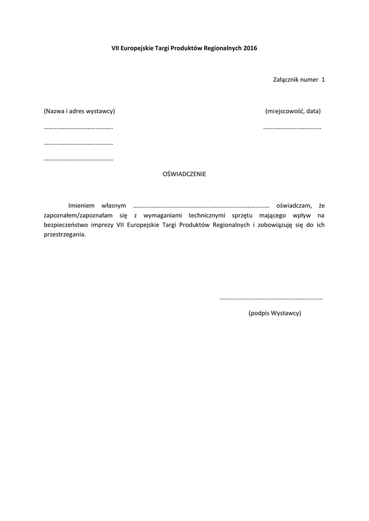 VII Europejskie Targi Produktów Regionalnych 2016 Załącznik numer 1 (Nazwa i adres wystawcy) (miejscowość, data) …………………………………….. ………………………………. …………………………………….. …………………………………….. OŚWIADCZENIE Imieniem własnym …………………………………………………………………………… oświadczam, że zapoznałem/zapoznałam się z wymaganiami technicznymi sprzętu mającego wpływ na bezpieczeństwo imprezy VII Europejskie Targi Produktów Regionalnych i zobowiązuję się do ich przestrzegania. ………………………………………………………… (podpis Wystawcy) VII Europejskie Targi Produktów Regionalnych 2016 Załącznik numer 2 Nazwa wystawcy : …………………………………………………………………….. Lp. Rodzaj przywiezionego sprzętu Ilość poboru energii elektrycznej (kW)