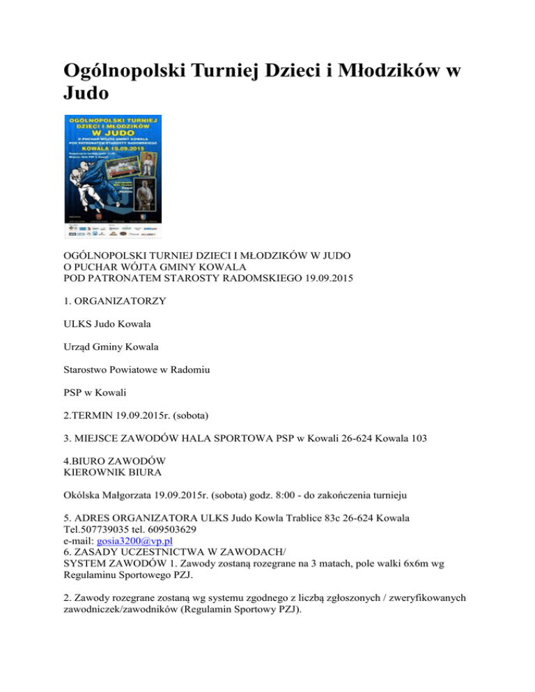 Ogólnopolski Turniej Dzieci i Młodzików w Judo OGÓLNOPOLSKI TURNIEJ DZIECI I MŁODZIKÓW W JUDO O PUCHAR WÓJTA GMINY KOWALA POD PATRONATEM STAROSTY RADOMSKIEGO 19.09.2015 1. ORGANIZATORZY ULKS Judo Kowala Urząd Gminy Kowala Starostwo Powiatowe w Radomiu PSP w Kowali 2.TERMIN 19.09.2015r. (sobota) 3. MIEJSCE ZAWODÓW HALA SPORTOWA PSP w Kowali 26-624 Kowala 103 4.BIURO ZAWODÓW KIEROWNIK BIURA Okólska Małgorzata 19.09.2015r. (sobota) godz. 8:00 - do zakończenia turnieju 5. ADRES ORGANIZATORA ULKS Judo Kowla Trablice 83c 26-624 Kowala Tel.507739035 tel. 609503629 e-mail: [email protected] 6. ZASADY UCZESTNICTWA W ZAWODACH/ SYSTEM ZAWODÓW 1. Zawody zostaną rozegrane na 3 matach, pole walki 6x6m wg Regulaminu Sportowego PZJ. 2. Zawody rozegrane zostaną wg systemu zgodnego z liczbą zgłoszonych / zweryfikowanych zawodniczek/zawodników (Regulamin Sportowy PZJ). 7. WIEK 1. Wiek uczestników 2. roczniki 2001 – 2002, 2003-2004, 2005-2006, 2007-2008 8. KATEGORIE WAGOWE Młodziczki -36kg, -40kg, -44kg, -48 kg, -52kg, -57kg, -63kg, 70kg,+70 kg Młodzicy -38kg, -42kg, -46kg, -50kg, -55kg, -60kg, -66 kg, -73kg, -81kg, +81kg Rocznik 2003-2004: Dziewczynki: 30kg, 33kg, 36kg, 40kg, 44kg, 48kg, 52kg, 57kg, +57kg Chłopcy: 32kg, 35kg, 38kg, 42kg, 46kg, 50kg, 55kg, 60kg, +60kg Rocznik 2005-2006: Dziewczynki: 24kg, 27kg, 30kg, 33kg, 36kg, 40kg, 44kg, 48kg, 52kg, +52kg Chłopcy: 27kg, 30kg, 34kg, 38kg, 42kg, 46kg, 50kg, 55kg, +55kg Rocznik 2007-2008: Co 3kg od najlżejszego zawodnika, zawodniczki (max. 8 kategorii wagowych) 9. CZAS WALKI Czas walki – 3 minuty, Golden Score – z otwartym czasem walki(młodzicy, młodziczki) Dzieci – 2 minuty 10. JUDOGI 1. Zawodniczka/zawodnik wyczytany jako drugi zakłada czerwoną przepaskę. 2. Podczas ceremonii dekoracji obowiązuje judogi koloru białego. 3. Dopuszcza się posiadanie na judogi backnumbers ze swoim nazwiskiem. 11. KOSZTY UCZESTNICTWA Zainteresowane Kluby. 12. OPŁATA STARTOWA 25,00 zł od uczestnika( zgłoszenia elektroniczne do 17.09.2015) 35,00 zł w dniu zawodów 13. ZGŁOSZENIA SPORTOWE DO ZAWODÓW Do 17.09.2015(włącznie) [email protected] Tel. 507 739 035 14. WAŻENIE Dzieci: waga godz. 9.00-10.00 Młodzicy: waga godz. 12.00-13.00 Podczas ważenia należy posiadać ważne badania lekarskie lub zgodę rodzica, trenera na start w zawodach. Nie zezwala się na ważenie zawodniczek i zawodników bez odzieży. Podczas ważenia zawodniczka musi mieć na sobie bieliznę osobistą i T-shirt, zawodnik bieliznę osobistą (spodenki). Limity wagowe są powiększone o dodatkowe 100g. 15. PROGRAM ZAWODÓW Weryfikacja i losowanie godz. 10.00-11.00 Otwarcie Turnieju godz.11.00 Dekoracje zawodników po każdej zakończonej kategorii wiekowej 16. NAGRADZANIE/ CEREMONIA DEKORACJI W ceremonii dekoracji uczestniczą zawodniczki i zawodnicy z miejsc I-V. Zawodniczki/zawodnicy, którzy zdobyli miejsca I-III w każdej kategorii wagowej otrzymują medal , dyplom i nagrodę; miejsce V – dyplom. Puchary dla 3 najlepszych klubów w klasyfikacji ogólnej. 17. INNE INFORMACJE 1. Zawodniczki / zawodnicy muszą posiadać ważne ubezpieczenie od następstw nieszczęśliwych wypadków NNW. Odpowiedzialność za zapewnienie ubezpieczenia dla uczestników zawodów spoczywa na klubach. 2. Na miejscu czynny będzie bufet z przekąskami. 3. Każdy zawodnik otrzyma drobny poczęstunek. 4. Gościem specjalnym turnieju będzie Paweł Nastula, który będzie dekorował wszystkich zawodników.