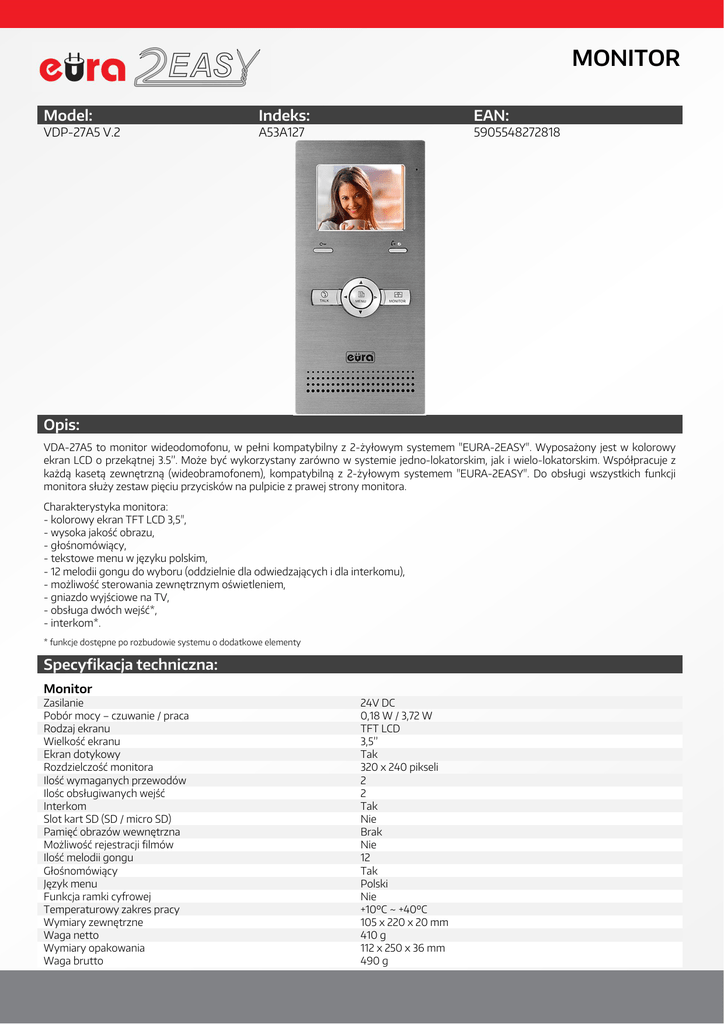 MONITOR Model: Indeks: EAN: VDP-27A5 V.2 A53A127 5905548272818 Opis: VDA-27A5 to monitor wideodomofonu, w pełni kompatybilny z 2-żyłowym systemem "EURA-2EASY". Wyposażony jest w kolorowy ekran LCD o przekątnej 3.5”. Może być wykorzystany zarówno w systemie jedno-lokatorskim, jak i wielo-lokatorskim. Współpracuje z każdą kasetą zewnętrzną (wideobramofonem), kompatybilną z 2-żyłowym systemem "EURA-2EASY". Do obsługi wszystkich funkcji monitora służy zestaw pięciu przycisków na pulpicie z prawej strony monitora. Charakterystyka monitora: - kolorowy ekran TFT LCD 3,5", - wysoka jakość obrazu, - głośnomówiący, - tekstowe menu w języku polskim, - 12 melodii gongu do wyboru (oddzielnie dla odwiedzających i dla interkomu), - możliwość sterowania zewnętrznym oświetleniem, - gniazdo wyjściowe na TV, - obsługa dwóch wejść*, - interkom*. * funkcje dostępne po rozbudowie systemu o dodatkowe elementy Specyfikacja techniczna: Monitor Zasilanie Pobór mocy – czuwanie / praca Rodzaj ekranu Wielkość ekranu Ekran dotykowy Rozdzielczość monitora Ilość wymaganych przewodów Ilośc obsługiwanych wejść Interkom Slot kart SD (SD / micro SD) Pamięć obrazów wewnętrzna Możliwość rejestracji filmów Ilość melodii gongu Głośnomówiący Język menu Funkcja ramki cyfrowej Temperaturowy zakres pracy Wymiary zewnętrzne Waga netto Wymiary opakowania Waga brutto 24V DC 0,18 W / 3,72 W TFT LCD 3,5” Tak 320 x 240 pikseli 2 2 Tak Nie Brak Nie 12 Tak Polski Nie +10ºC ~ +40ºC 105 x 220 x 20 mm 410 g 112 x 250 x 36 mm 490 g