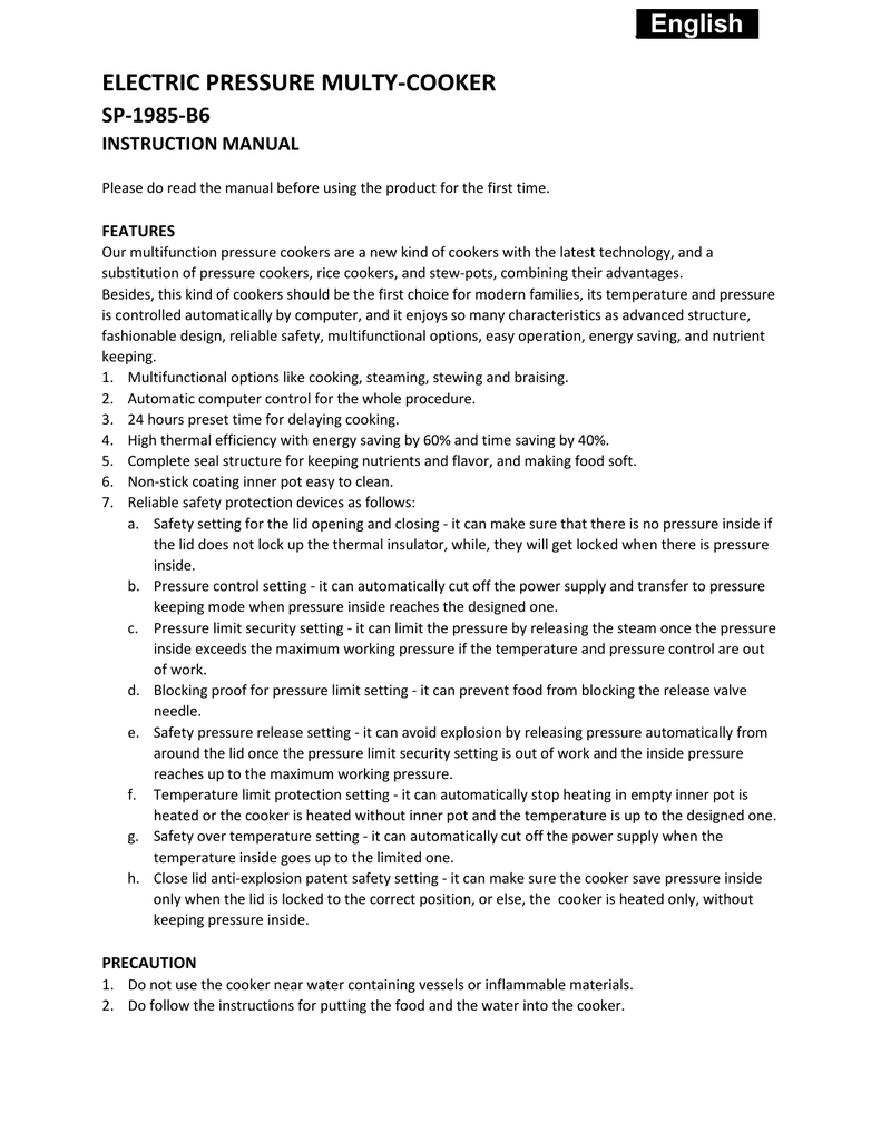 _English_ ELECTRIC PRESSURE MULTY-COOKER SP-1985-B6 INSTRUCTION MANUAL Please do read the manual before using the product for the first time. FEATURES Our multifunction pressure cookers are a new kind of cookers with the latest technology, and a substitution of pressure cookers, rice cookers, and stew-pots, combining their advantages. Besides, this kind of cookers should be the first choice for modern families, its temperature and pressure is controlled automatically by computer, and it enjoys so many characteristics as advanced structure, fashionable design, reliable safety, multifunctional options, easy operation, energy saving, and nutrient keeping. 1. Multifunctional options like cooking, steaming, stewing and braising. 2. Automatic computer control for the whole procedure. 3. 24 hours preset time for delaying cooking. 4. High thermal efficiency with energy saving by 60% and time saving by 40%. 5. Complete seal structure for keeping nutrients and flavor, and making food soft. 6. Non-stick coating inner pot easy to clean. 7. Reliable safety protection devices as follows: a. Safety setting for the lid opening and closing - it can make sure that there is no pressure inside if the lid does not lock up the thermal insulator, while, they will get locked when there is pressure inside. b. Pressure control setting - it can automatically cut off the power supply and transfer to pressure keeping mode when pressure inside reaches the designed one. c. Pressure limit security setting - it can limit the pressure by releasing the steam once the pressure inside exceeds the maximum working pressure if the temperature and pressure control are out of work. d. Blocking proof for pressure limit setting - it can prevent food from blocking the release valve needle. e. Safety pressure release setting - it can avoid explosion by releasing pressure automatically from around the lid once the pressure limit security setting is out of work and the inside pressure reaches up to the maximum working pressure. f. Temperature limit protection setting - it can automatically stop heating in empty inner pot is heated or the cooker is heated without inner pot and the temperature is up to the designed one. g. Safety over temperature setting - it can automatically cut off the power supply when the temperature inside goes up to the limited one. h. Close lid anti-explosion patent safety setting - it can make sure the cooker save pressure inside only when the lid is locked to the correct position, or else, the cooker is heated only, without keeping pressure inside. PRECAUTION 1. Do not use the cooker near water containing vessels or inflammable materials. 2. Do follow the instructions for putting the food and the water into the cooker. _English_ 3. Do not damage the seal ring and do not substitute with other rubber rings, or with a tension ring to intense seal. 4. It would be better to wash the blocking proof as often as possible to keep it clean. 5. Do not open the lid with force when the float is still up. 6. The pressure limiting valve is not allowed to be pressed with heavy objects or substituted with other objects. 7. Do not place cloth between the lid and the thermal insulator, otherwise, it threats safety. 8. It would be better to keep clean both the outside bottom of the inner pot and the heater surface. Moreover, the inner pot is not allowed to be heated directly over the fire, or to be substituted with other pots. 9. Do use wooden or plastic spoons to prevent the non-stick coating from damage. 10. Keep your face and hands away from the release outlet when it is releasing. Do not touch the lid when it is working, or you will get burnt. 11. The maximum of the warm-keeping time is 12. 24 hours, but it would be better not to surpass 6 hours so that you can get good dishes. 13. It is abnormal if a lot of steam releases from around the lid during working. In case of that, it can be protected by the safety pressure release setting. Unplug and stop working, and then return it to the authorized service facility for examination, repair or adjustment. 14. Hold the pot for its side handles, not the handle of the lid when moving the cooker. 15. In case of malfunction while working, return the cooker to the authorized service facility for examination, repair or adjustment. 16. Do not dismantle the cooker or substitute the parts with others by yourself. 17. Do not dismantle the power cord by yourself in case it is damaged. It must be replaced by the manufacturer or the authorized service center in order to avoid any hazard. 18. The surface of item gets very hot while working/using. Do not touch it! 19. This appliance is not intended for use by persons (including children) with reduced physical, sensory or mental capabilities, or lack of experience and knowledge, unless they have been given supervision or instruction concerning use of the appliance by a person responsible for their safety. 20. Children should be supervised to ensure that they do not play with the appliance. 21. This appliance intended for household use only. SPECIAL ATTENTION 1. Functions selecting and pressure keeping time setting. For example, the cooker is in RICE mode when power is on. If you would like POTTAGE, please press POTTAGE, and its indicator light will blink. After 8 blinks, it turns to working mode automatically and the indicator light of POTTAGE and that of PRESSURE KEEPING TIME stays on. NOTE: The time displayed on the screen only means the pressure keeping time, it does not include the heating time (this time depends on how much food and what kind of the food you cook), so the complete cooking time will be a little longer than the displayed time. 2. (1) (2) (3) (4) (5) When Using Do put the pressure limit valve to Seal before using it. Never touch the lid when it is working, it is very hot. Select the function and wait 8 blinks, it turns to working mode automatically. Do not put your hands over Release valve to avoid getting burnt when it is releas