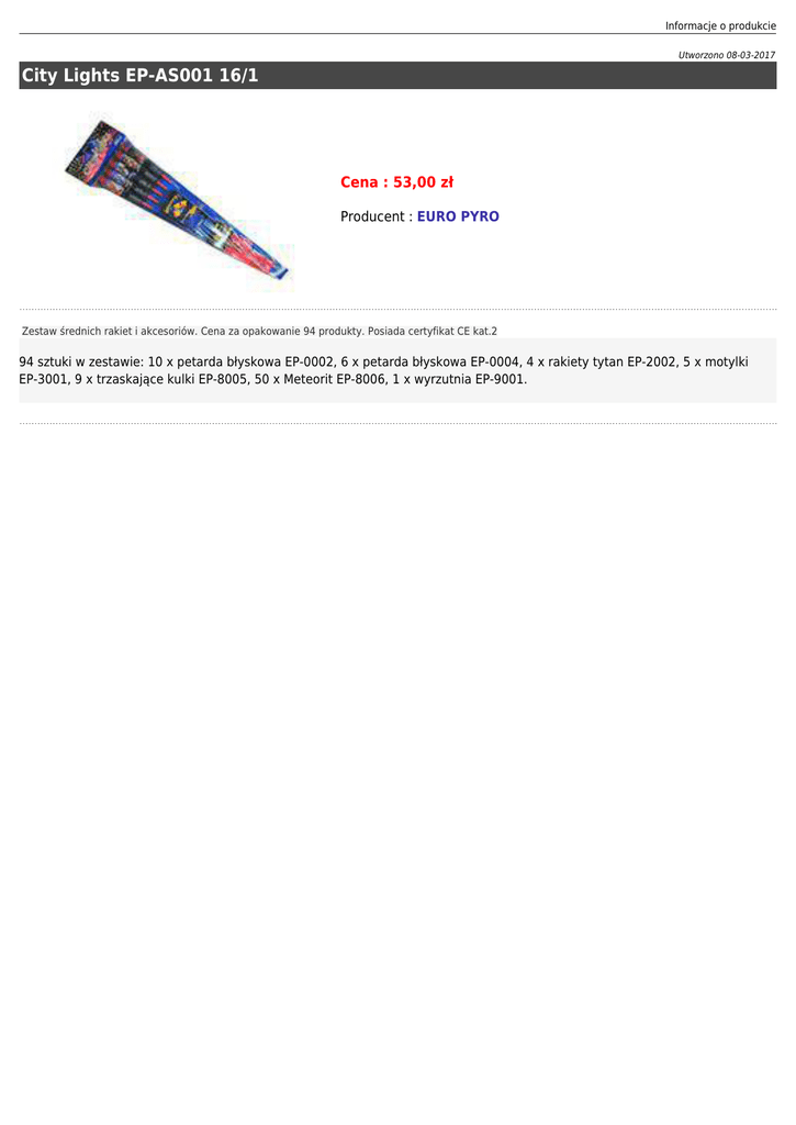 Informacje o produkcie Utworzono 08-03-2017 City Lights EP-AS001 16/1 Cena : 53,00 zł Producent : EURO PYRO Zestaw średnich rakiet i akcesoriów. Cena za opakowanie 94 produkty. Posiada certyfikat CE kat.2 94 sztuki w zestawie: 10 x petarda błyskowa EP-0002, 6 x petarda błyskowa EP-0004, 4 x rakiety tytan EP-2002, 5 x motylki EP-3001, 9 x trzaskające kulki EP-8005, 50 x Meteorit EP-8006, 1 x wyrzutnia EP-9001.