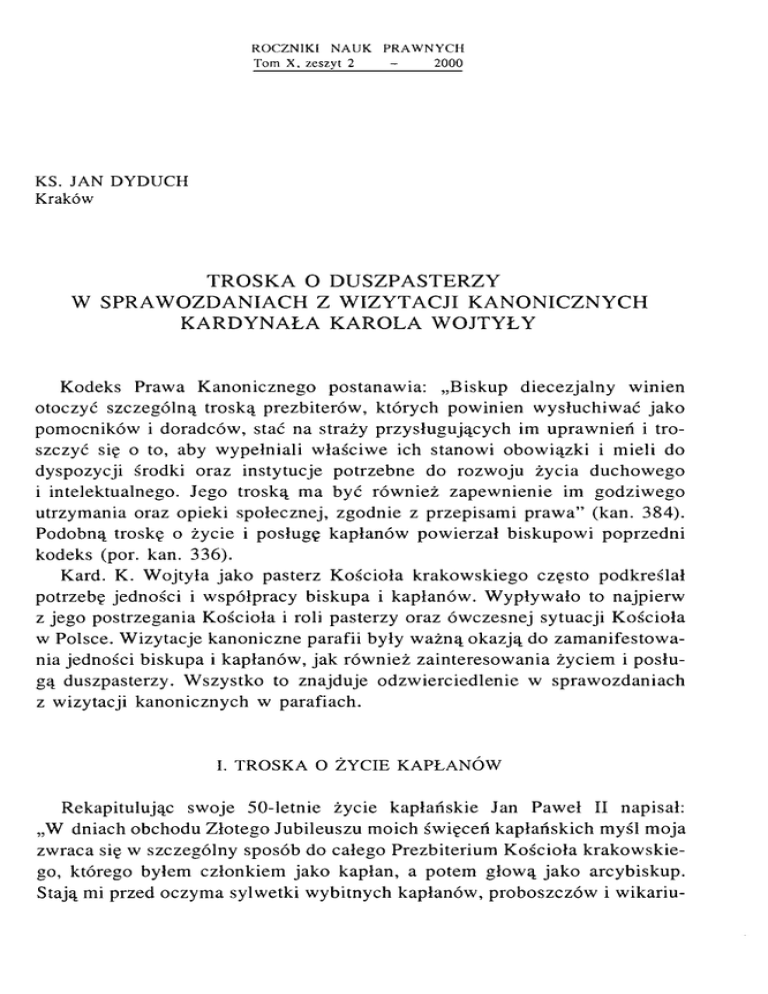 R O C Z N IK I NAUK T om X , zeszy t 2 PRA W N Y CH - 2000 KS. JAN DYDUCH Kraków TROSKA O D U SZPASTERZY W S P R A W O Z D A N IA C H Z W I Z Y T A C J I K A N O N IC Z N Y C H K A R D Y N A Ł A K A R O L A W O JT Y Ł Y K odeks Praw a K anonicznego postanaw ia: „B iskup diecezjaln y w inien otoczyć szczególną tro sk ą prezbiterów , których pow inien w ysłuchiw ać jako pom ocników i doradców , stać na straży p rzysługujących im upraw nień i tro szczyć się o to, aby w ypełniali w łaściw e ich stanow i obow iązki i m ieli do dyspozycji środki oraz instytucje potrzebne do rozw oju życia duchow ego i intelektualnego. Jego tro sk ą m a być rów nież zapew nienie im godziw ego utrzym ania oraz opieki społecznej, zgodnie z przepisam i p ra w a” (kan. 384). Podobną troskę o życie i posługę kapłanów pow ierzał biskupow i poprzedni kodeks (por. kan. 336). K ard. K. W ojtyła jak o pasterz K ościoła krakow skiego często podkreślał potrzebę jed n o ści i w spółpracy biskupa i kapłanów . W ypływ ało to najpierw z jego p ostrzegania K o ścioła i roli pasterzy oraz ów czesnej sytuacji K ościoła w Polsce. W izytacje kanoniczne parafii były w ażn ą o k az ją do za m a n ifesto w a nia jedności b iskupa i kapłanów , ja k rów nież zainteresow ania życiem i p o słu g ą duszpasterzy. W szystko to znajduje odzw ierciedlenie w spraw ozdaniach z w izytacji kanonicznych w parafiach. I. TROSKA O ŻYCIE KAPŁANÓW R ekapitulując sw oje 50-letnie życie kap łań sk ie Jan P aw eł II napisał: „W dniach obchodu Z łotego Jubileuszu m oich św ięceń k ap łańskich m yśl m oja zw raca się w szczególny sposób do całego P rezbiterium K ościoła k rak o w sk ie go, którego byłem członkiem jak o kapłan, a potem gło w ą ja k o arcybiskup. S tają mi przed oczym a sylw etki w ybitnych kapłanów , proboszczów i w ikariu- szy [...] P rzykładam i ich św iętości i gorliw ości duszpasterskiej bardzo się budow ałem [...], od nich uczyłem się, co to znaczy być autentycznym duszpa sterzem ” 1. K arol W ojtyła od kapłanów uczył się duszpasterstw a, ale jeszcze bardziej On uczył ich duszpasterzow ania. S zczególną o k azją do tego były w izytacje k an o n iczne parafii. S praw ozdania z nich ukazują, jak bardzo tro szczył się o d u szpasterzy, o ich życie w ew nętrzne, o ich poziom intelektual ny, o ich rozw ój duchow y, ale także o ich byt m aterialny. T a troska doty czy ła rów nież ro d zin kapłanów , stanow iących środow iska o podstaw ow ym znaczeniu d la pielęgnow ania pow ołań kapłańskich i to nie tylko w dzieciń stw ie, m łodości, w okresie sem inarium , ale także później w życiu kapłańskim . In tereso w ał się zw łaszcza kapłanam i starym i i chorym i. Z adziw iająca jest troska o zb aw ien ie zm arłych ju ż kapłanów , szczególnie tych, z którym i spot kał się jak o kapłan czy jak o biskup. P ocząw szy od pierw szej w izytacji w M ucharzu (16-18 V 1959) biskup K. W ojtyła w y kazuje zainteresow anie życiem kapłanów . W spraw ozdaniu zaznacza: „M iejscow y proboszcz ks. dziekan Jó z e f M otyka szam belan J. Sw. m im o 74 łat życia i praw ie 50 kapłaństw a je st niezw ykle żyw y i pracow ity”. P isze nie tylko o proboszczu: „W ikariusze: chory ks. S tanisław W olny oraz od kilku m iesięcy ks. A ntoni P aluch pracu ją ku zadow oleniu ks. dziekana”2. Ż yczeniem w izytującego biskupa K. W ojtyły było, aby w w izytacjach u czestniczyli kapłani z sąsied ztw a (dekanatu), jak rów nież kapłani, którzy z tej parafii p o ch o dzili. W jednym z pierw szych spraw ozdań z w izytacji, m ia now icie d o k onanej w Z em brzycach (30-31 V 1959), podkreśla obecność k a płanów i alum nów , którzy w ciągu ostatnich lat w yszli z tej p arafii3. W izytu jąc S tryszaw ę (31 V -2 V I 1959) odw iedził nie tylko proboszcza ks. H. Znam irow skiego i w ikariusza ks. S. W ójciaka, ale także ks. B. B artkow skiego, k ap elana sió str Z m artw ychw stanek na Siw ców ce (przysiółek należący do parafii S tryszaw a), będącego kapłanem diecezji chełm ińskiej. W spom ina także o o d w iedzinach w dom u rodzinnym ks. A. S ołtysika, pochodzącego z tej p arafii, a będ ącego w ikariuszem w M szanie D olnej, który uczestniczył w w izy tacji4. W izy tu jący biskup K. W ojtyła rozm aw iał z w iernym i o życiu kapłanów . S p raw o zd an ie z w izytacji w Z abierzow ie B ocheńskim (16-17 IX 1960) stw ier 1 D ar i Tajem nica, Kraków 1996. s. 65. 2 Akta K ardynała K arola W ojtyły przechow yw ane w Archiw um Kurii M etropolitalnej w Krakowie (dalej cyt. - AKKW ), E II-1/63. 3 A KKW , E l i - 1/63. 4 A KKW , E l i - 1/63. dza: „P rzedstaw iciele R ady parafialnej w yrażali się z uznaniem o pracy ks. prob. W . Z iem ińskiego, który całe sw oje życie k ap łań sk ie (38 lat) spędził w Z abierzow ie B ocheńskim naprzód jako w ikariusz, a później jak o proboszcz. N iem niej prosili o pom oc dla niego - i ta pom oc (w ikariusz) zdaje się bardzo p o trzeb n a...”5. S praw ozdanie z w izytacji w Ł apanow ie (22-24 IX 1960) za znacza, że adm in istrato r parafii, ks. T. S iepak, po przebytej chorobie, w raca do zdrow ia i podejm uje pracę d u szp astersk ą norm alnie, sp ełniając funkcje kapłańskie. T akże dodaje o odw iedzinach w izytującego biskupa w dom ach rodzinnych ks. dziekana M. Z debskiego z R abki i ks. S. Ż aka adm inistratora ze Szczyrku. N iecodzienną sytuację napotkał biskup K. W o jty ła w izytując p arafię L anc korona (18-20 V 1960). W parafii tej pracow ali dw aj kapłani - bracia; star szy ks. Jan M arszałek po 60-leciu kapłaństw a i nieco m łodszy jeg o b ra t6. P racują gorliw ie, jed n ak pisze w spraw ozdan iu „przydałby się m łody ksiądz zw łaszcza do pracy nad m łodzieżą i d z ie ć m i”7. W izytując R adziszów (5-6 V I 1960), po uroczystej sum ie dokonał bło g o sław ień