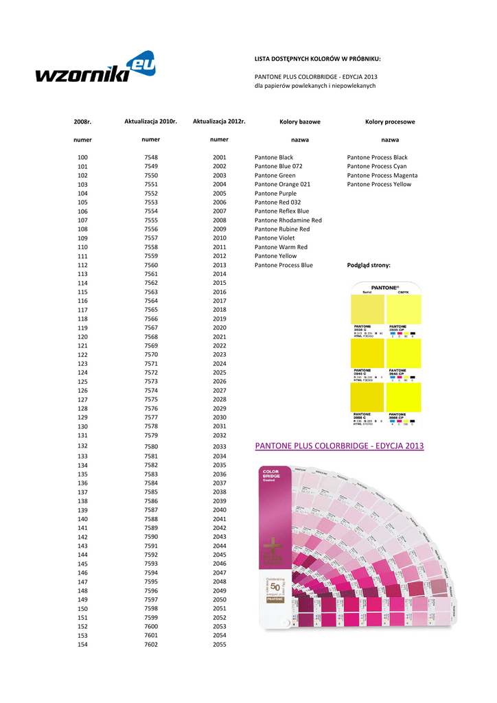 LISTA DOSTĘPNYCH KOLORÓW W PRÓBNIKU: PANTONE PLUS COLORBRIDGE ‐ EDYCJA 2013 dla papierów powlekanych i niepowlekanych 2008r. Aktualizacja 2010r. Aktualizacja 2012r. Kolory bazowe Kolory procesowe numer numer numer nazwa nazwa 100 101 102 103 104 105 106 107 108 109 110 111 112 113 114 115 116 117 118 119 120 121 122 123 124 125 126 127 128 129 130 131 7548 7549 7550 7551 7552 7553 7554 7555 7556 7557 7558 7559 7560 7561 7562 7563 7564 7565 7566 7567 7568 7569 7570 7571 7572 7573 7574 7575 7576 7577 7578 7579 2001 2002 2003 2004 2005 2006 2007 2008 2009 2010 2011 2012 2013 2014 2015 2016 2017 2018 2019 2020 2021 2022 2023 2024 2025 2026 2027 2028 2029 2030 2031 2032 Pantone Black Pantone Blue 072 Pantone Green Pantone Orange 021 Pantone Purple Pantone Red 032 Pantone Reflex Blue Pantone Rhodamine Red Pantone Rubine Red Pantone Violet Pantone Warm Red Pantone Yellow Pantone Process Blue 132 7580 7581 7582 7583 7584 7585 7586 7587 7588 7589 7590 7591 7592 7593 7594 7595 7596 7597 7598 7599 7600 7601 7602 2033 2034 2035 2036 2037 2038 2039 2040 2041 2042 2043 2044 2045 2046 2047 2048 2049 2050 2051 2052 2053 2054 2055 PANTONE PLUS COLORBRIDGE ‐ EDYCJA 2013 133 134 135 136 137 138 139 140 141 142 143 144 145 146 147 148 149 150 151 152 153 154 Pantone Process Black Pantone Process Cyan Pantone Process Magenta Pantone Process Yellow Podgląd strony: 155 156 157 158 159 160 161 162 163 164 165 166 167 168 169 170 171 172 173 174 175 176 177 178 179 180 181 182 183 184 185 186 187 188 189 190 191 192 193 194 195 196 197 198 199 200 201 202 203 204 205 206 207 208 209 210 211 212 213 214 215 216 217 218 219 220 221 222 7603 7604 7605 7606 7607 7608 7609 7610 7611 7612 7613 7614 7615 7616 7617 7618 7619 7620 7621 7622 7623 7624 7625 7626 7627 7628 7629 7630 7631 7632 7633 7634 7635 7636 7637 7638 7639 7640 7641 7642 7643 7644 7645 7646 7647 7648 7649 7650 7651 7652 7653 7654 7655 7656 7657 7658 7659 7660 7661 7662 7663 7664 7665 7666 7667 7668 7669 7670 2056 2057 2058 2059 2060 2061 2062 2063 2064 2065 2066 2067 2068 2069 2070 2071 2072 2073 2074 2075 2076 2077 2078 2079 2080 2081 2082 2083 2084 2085 2086 2087 2088 2089 2090 2091 2092 2093 2094 2095 2096 2097 2098 2099 2100 2101 2102 2103 2104 2105 2106 2107 2108 2109 2110 2111 2112 2113 2114 2115 2116 2117 2118 2119 2120 2121 2122 2123 223 224 225 226 227 228 229 230 231 232 233 234 235 236 237 238 239 240 241 242 243 244 245 246 247 248 249 250 251 252 253 254 255 256 257 258 259 260 261 262 263 264 265 266 267 268 269 270 271 272 273 274 275 276 277 278 279 280 281 282 283 284 285 286 287 288 289 290 7671 7672 7673 7674 7675 7676 7677 7678 7679 7680 7681 7682 7683 7684 7685 7686 7687 7688 7689 7690 7691 7692 7693 7694 7695 7696 7697 7698 7699 7700 7701 7702 7703 7704 7705 7706 7707 7708 7709 7710 7711 7712 7713 7714 7715 7716 7717 7718 7719 7720 7721 7722 7723 7724 7725 7726 7727 7728 7729 7730 7731 7732 7733 7734 7735 7736 7737 7738 2124 2125 2126 2127 2128 2129 2130 2131 2132 2133 2134 2135 2136 2137 2138 2139 2140 2141 2142 2143 2144 2145 2146 2147 2148 2149 2150 2151 2152 2153 2154 2155 2156 2157 2158 2159 2160 2161 2162 2163 2164 2165 2166 2167 2168 2169 2170 2171 2172 2173 2174 2175 2176 2177 2178 2179 2180 2181 2182 2183 2184 2185 2186 2187 2188 2189 2190 2191 291 292 293 294 295 296 297 298 299 300 301 302 303 304 305 306 307 308 309 310 311 312 313 314 315 316 317 318 319 320 321 322 323 324 325 326 327 328 329 330 331 332 333 334 335 336 337 338 339 340 341 342 343 344 345 346 347 348 349 350 351 352 353 354 355 356 357 358 7739 7740 7741 7742 7743 7744 7745 7746 7747 7748 7749 7750 7751 7752 7753 7754 7755 7756 7757 7758 7759 7760 7761 7762 7763 7764 7765 7766 7767 7768 7769 7770 7771 2192 2193 2194 2195 2196 2197 2198 2199 2200 2201 2202 2203 2204 2205 2206 2207 2208 2209 2210 2211 2212 2213 2214 2215 2216 2217 2218 2219 2220 2221 2222 2223 2224 2225 2226 2227 2228 2229 2230 2231 2232 2233 2234 2235 2236 2237 2238 2239 2240 2241 2242 2243 2244 2245 2246 2247 2248 2249 2250 2251 2252 2253 2254 2255 2256 2257 2258 2259 359 360 361 362 363 364 365 366 367 368 369 370 371 372 373 374 375 376 377 378 379 380 381 382 383 384 385 386 387 388 389 390 391 392 393 394 395 396 397 398 399 400 401 402 403 404 405 406 407 408 409 410 411 412 413 414 415 416 417 418 419 420 421 422 423 424 425 426 2260 2261 2262 2263 2264 2265 2266 2267 2268 2269 2270 2271 2272 2273 2274 2275 2276 2277 2278 2279 2280 2281 2282 2283 2284 2285 2286 2287 2288 2289 2290 2291 2292 2293 2294 2295 2296 2297 2298 2299 2300 2301 2302 2303 2304 2305 2306 2307 2308 2309 2310 2311 2312 2313 2314 2315 2316 2317 2318 2319 2320 2321 2322 2323 2324 2325 2326 2327 427 428 429 430 431 432 433 434 435 436 437 438 439 440 441 442 443 444 445 446 447 448 449 450 451 452 453 454 455 456 457 458 459 460 461 462 463 464 465 466 467 468 469 470 471 472 473 474 475 476 477 478 479 480 481 482 483 484 485 486 487 488 489 490 491 492 493 494 2328 2329 2330 2331 2332 2333 2334 2335 2336 495 496 497 498 499 500 501 502 503 504 505 506 507 508 509 510 511 512 513 514 515 516 517 518 519 520 521 522 523 524 525 526 527 528 529 530 531 532 533 534 535 536 537 538 539 540 541 542 543 544 545 546 547 548 549 550 551 552 553 554 555 556 557 558 559 560 561 562 563 564 565 566 567 568 569 570 571 572 573 574 575 576 577 578 579 580 581 582 583 584 585 586 587 600 601 602 603 604 605 606 607 608 609 610 611 612 613 614 615 616 617 618 619 620 621 622 623 624 625 626 627 628 629 630 631 632 633 634 635 636 637 638 639 640 641 642 643 644 645 646 647 648 649 650 651 652 653 654 655 656 657 658 659 660 661 662 663 664 665 666 667 668 669 670 671 672 673 674 675 676 677 678 679 680 681 682 683 684 685 686 687 688 689 690 691 692 693 694 695 696 697 698 699 700 701 702 703 704 705 706 707 708 709 710 711 712 713 714 715 716 717 718 719 720 721 722 723 724 725 726 727 728 729 730 731 732 1205 1215 1225 1235 1245 1255 1265 1345 1355 1365 1375 1385 1395 1405 1485 1495 1505 1525 1535 1545 1555 1565 15