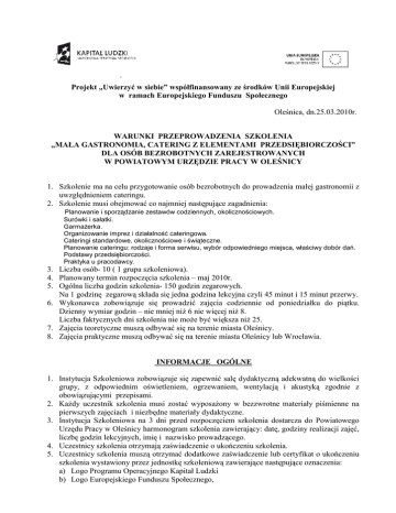 . Projekt „Uwierzyć w siebie” współfinansowany ze środków Unii Europejskiej w ramach Europejskiego Funduszu Społecznego Oleśnica, dn.25.03.2010r. WARUNKI PRZEPROWADZENIA SZKOLENIA „MAŁA GASTRONOMIA, CATERING Z ELEMENTAMI PRZEDSIĘBIORCZOŚCI” DLA OSÓB BEZROBOTNYCH ZAREJESTROWANYCH W POWIATOWYM URZĘDZIE PRACY W OLEŚNICY 1. Szkolenie ma na celu przygotowanie osób bezrobotnych do prowadzenia małej gastronomii z uwzględnieniem cateringu. 2. Szkolenie musi obejmować co najmniej następujące zagadnienia: Planowanie i sporządzanie zestawów codziennych, okolicznościowych. Surówki i sałatki. Garmażerka. Organizowanie imprez i działalność cateringowa. Cateringi standardowe, okolicznościowe i świąteczne. Planowanie cateringu: rodzaje i forma serwisu, wybór odpowiedniego miejsca, właściwy dobór dań. Podstawy przedsiębiorczości. Praktyka u pracodawcy. 3. Liczba osób- 10 ( 1 grupa szkoleniowa). 4. Planowany termin rozpoczęcia szkolenia – maj 2010r. 5. Ogólna liczba godzin szkolenia- 150 godzin zegarowych. Na 1 godzinę zegarową składa się jedna godzina lekcyjna czyli 45 minut i 15 minut przerwy. 6. Wykonawca zobowiązuje się prowadzić zajęcia codziennie od poniedziałku do piątku. Dzienny wymiar godzin – nie mniej niż 6 nie więcej niż 8. Liczba faktycznych dni szkolenia nie może być większa niż 25. 7. Zajęcia teoretyczne muszą odbywać się na terenie miasta Oleśnicy. 8. Zajęcia praktyczne muszą odbywać się na terenie miasta Oleśnicy lub Wrocławia. INFORMACJE OGÓLNE 1. Instytucja Szkoleniowa zobowiązuje się zapewnić salę dydaktyczną adekwatną do wielkości grupy, z odpowiednim oświetleniem, ogrzewaniem, wentylacją i akustyką zgodnie z obowiązującymi przepisami. 2. Każdy uczestnik szkolenia musi zostać wyposażony w bezzwrotne materiały piśmienne na pierwszych zajęciach i niezbędne materiały dydaktyczne. 3. Instytucja Szkoleniowa na 3 dni przed rozpoczęciem szkolenia dostarcza do Powiatowego Urzędu Pracy w Oleśnicy harmonogram szkolenia zawierający: datę, godziny realizacji zajęć, liczbę godzin lekcyjnych, imię i nazwisko prowadzącego. 4. Uczestnicy szkolenia otrzymają zaświadczenie o ukończeniu szkolenia. 5. Uczestnicy szkolenia muszą otrzymać dodatkowe zaświadczenie lub certyfikat o ukończeniu szkolenia wystawiony przez jednostkę szkoleniową zawierające następujące oznaczenia: a) Logo Programu Operacyjnego Kapitał Ludzki b) Logo Europejskiego Funduszu Społecznego, c) Logo Unii Europejskiej d) Zapis: „Szkolenie współfinansowane przez Unię Europejską w ramach Europejskiego Funduszu Społecznego”. oraz zawierające co najmniej: imię i nazwisko uczestnika, datę urodzenia, nazwę szkolenia, termin realizacji szkolenia, datę i miejsce wystawienia 6. Propozycja szkoleniowa, dokumenty dla Powiatowego Urzędu Pracy, materiały szkoleniowe dla uczestników szkolenia, pomieszczenia w których będzie się odbywać szkolenie muszą być oznaczone jak w pkt 5.