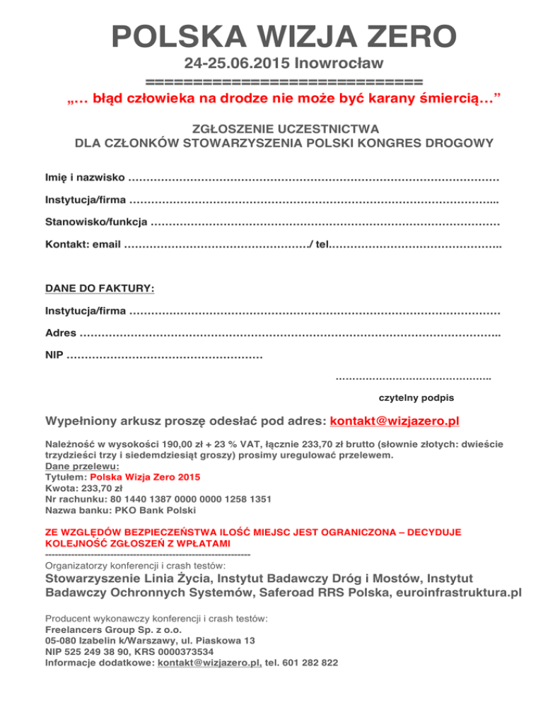 POLSKA WIZJA ZERO 24-25.06.2015 Inowrocław ============================= „… błąd człowieka na drodze nie może być karany śmiercią…” ZGŁOSZENIE UCZESTNICTWA DLA CZŁONKÓW STOWARZYSZENIA POLSKI KONGRES DROGOWY Imię i nazwisko ………………………………………………………………………………………… Instytucja/firma ………………………………………………………………………………………... Stanowisko/funkcja …………………………………………………………………………………… Kontakt: email ……………………………………………/ tel.……………………………………….. DANE DO FAKTURY: Instytucja/firma ………………………………………………………………………………………… Adres …………………………………………………………………………………………………….. NIP ……………………………………………… ……………………………………….. czytelny podpis Wypełniony arkusz proszę odesłać pod adres: [email protected] Należność w wysokości 190,00 zł + 23 % VAT, łącznie 233,70 zł brutto (słownie złotych: dwieście trzydzieści trzy i siedemdziesiąt groszy) prosimy uregulować przelewem. Dane przelewu: Tytułem: Polska Wizja Zero 2015 Kwota: 233,70 zł Nr rachunku: 80 1440 1387 0000 0000 1258 1351 Nazwa banku: PKO Bank Polski ZE WZGLĘDÓW BEZPIECZEŃSTWA ILOŚĆ MIEJSC JEST OGRANICZONA – DECYDUJE KOLEJNOŚĆ ZGŁOSZEŃ Z WPŁATAMI --------------------------------------------------------------Organizatorzy konferencji i crash testów: Stowarzyszenie Linia Życia, Instytut Badawczy Dróg i Mostów, Instytut Badawczy Ochronnych Systemów, Saferoad RRS Polska, euroinfrastruktura.pl Producent wykonawczy konferencji i crash testów: Freelancers Group Sp. z o.o. 05-080 Izabelin k/Warszawy, ul. Piaskowa 13 NIP 525 249 38 90, KRS 0000373534 Informacje dodatkowe: [email protected], tel. 601 282 822