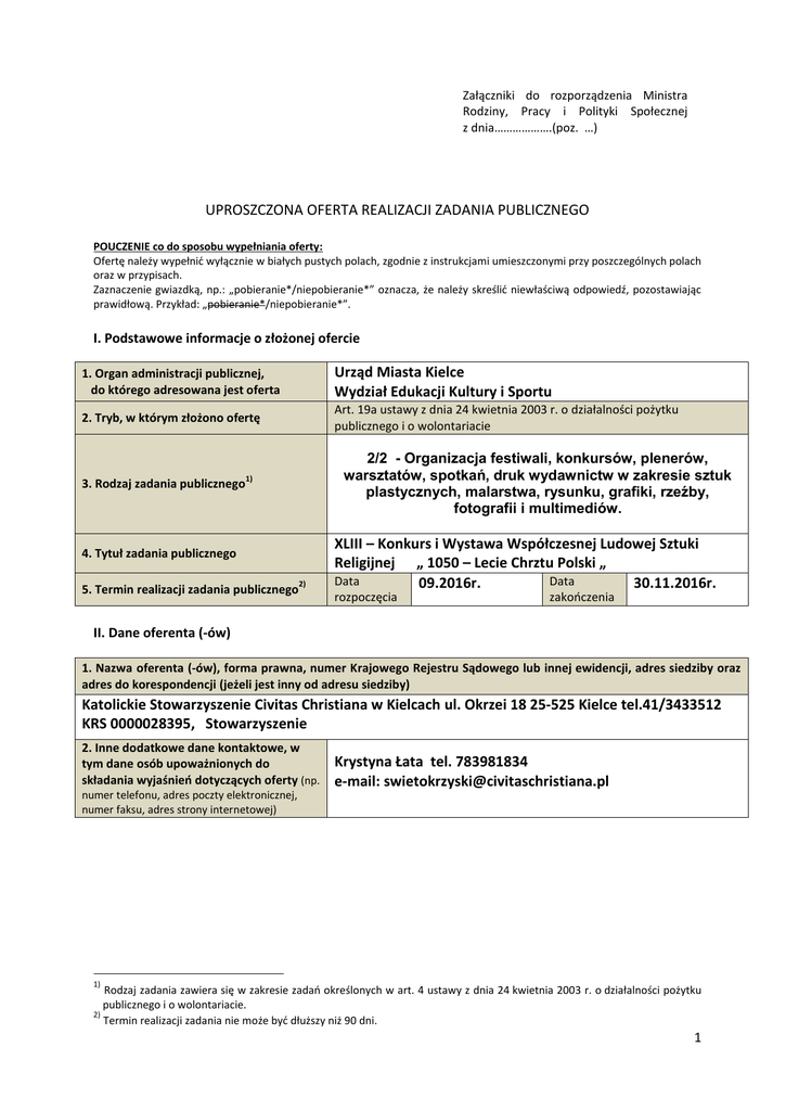Załączniki do rozporządzenia Ministra Rodziny, Pracy i Polityki Społecznej z dnia……………….(poz. …) UPROSZCZONA OFERTA REALIZACJI ZADANIA PUBLICZNEGO POUCZENIE co do sposobu wypełniania oferty: Ofertę należy wypełnić wyłącznie w białych pustych polach, zgodnie z instrukcjami umieszczonymi przy poszczególnych polach oraz w przypisach. Zaznaczenie gwiazdką, np.: „pobieranie*/niepobieranie*” oznacza, że należy skreślić niewłaściwą odpowiedź, pozostawiając prawidłową. Przykład: „pobieranie*/niepobieranie*”. I. Podstawowe informacje o złożonej ofercie 1. Organ administracji publicznej, do którego adresowana jest oferta Urząd Miasta Kielce Wydział Edukacji Kultury i Sportu 2. Tryb, w którym złożono ofertę Art. 19a ustawy z dnia 24 kwietnia 2003 r. o działalności pożytku publicznego i o wolontariacie 3. Rodzaj zadania publicznego 2/2 - Organizacja festiwali, konkursów, plenerów, warsztatów, spotkań, druk wydawnictw w zakresie sztuk plastycznych, malarstwa, rysunku, grafiki, rzeźby, fotografii i multimediów. 1) 4. Tytuł zadania publicznego 5. Termin realizacji zadania publicznego 2) XLIII – Konkurs i Wystawa Współczesnej Ludowej Sztuki Religijnej „ 1050 – Lecie Chrztu Polski „ Data Data 09.2016r. 30.11.2016r. rozpoczęcia zakończenia II. Dane oferenta (-ów) 1. Nazwa oferenta (-ów), forma prawna, numer Krajowego Rejestru Sądowego lub innej ewidencji, adres siedziby oraz adres do korespondencji (jeżeli jest inny od adresu siedziby) Katolickie Stowarzyszenie Civitas Christiana w Kielcach ul. Okrzei 18 25-525 Kielce tel.41/3433512 KRS 0000028395, Stowarzyszenie 2. Inne dodatkowe dane kontaktowe, w tym dane osób upoważnionych do składania wyjaśnień dotyczących oferty (np. Krystyna Łata tel. 783981834 e-mail: [email protected] numer telefonu, adres poczty elektronicznej, numer faksu, adres strony internetowej) 1) Rodzaj zadania zawiera się w zakresie zadań określonych w art. 4 ustawy z dnia 24 kwietnia 2003 r. o działalności pożytku publicznego i o wolontariacie. 2) Termin realizacji zadania nie może być dłuższy niż 90 dni. 1 III. Zakres rzeczowy zadania publicznego 1. Opis zadania publicznego proponowanego do realizacji wraz ze wskazaniem, w szczególności celu, miejsca jego realizacji, grup odbiorców zadania oraz przewidywanego do wykorzystania wkładu osobowego lub rzeczowego XLIII edycja konkursu Współczesnej Ludowej Sztuki Religijnej adresowana jest do twórców ludowych (rzeźbiarzy, ceramików, malarzy). Ma zasięg ogólnopolski ze szczególnym uwzględnieniem autorów regionu świętokrzyskiego. W tym roku preferujemy prace o tematyce rodziny ale też obrazowanie dróg prowadzących do świętości. Zadanie obejmuje przygotowanie i realizację konkursu oraz pokonkursowej wystawy. Dotychczasowe edycje konkursów i wystaw potwierdzają potrzebę ich kontynuacji zarówno ze względu na potrzeby twórców jak też szerokiej publiczności, co potwierdzają również recenzje prasowe. Ważność tematyki prac (jubileusz chrześcijaństwa w Polsce), wysoki poziom artystyczny dotychczasowych realizacji, ochrona wymierającej profesji twórcy ludowego, żywa jeszcze w naszym regionie tradycja sztuki ludowej, a także jedyna w kraju od lat cykliczna prezentacja aktualnej, ludowej, o religijnym charakterze sztuki. Bez finansowego wsparcia twórców (poprzez nagrody), a organizatorów w związku z niezbędnymi kosztami realizacji konkursu i wystawy nie ma szans na ochronę tej tradycji i wspieranie tej jakże ważnej części dziedzictwa narodowego i kulturowego. Mamy nadzieję na wsparcie powyższego. Adresatem powyższego zadania są przede wszystkim twórcy ludowi niemal z zasady wywodzący się z ubogich środowisk i każde wsparcie finansowe (nagrody), ale też publiczne dowartościowanie (wystawa) jest pomocą i utwierdzeniem ich w sensie dalszego uprawiania tej rzadkiej już dziś aktywności artystycznej. Dla wystawowej publiczności kolejna edycja konkursu i prezentacji jest szczególną formą przeżyć artystycznych połączonych z religijną refleksją, co kształtuje wrażliwość i stymuluje dobroć jakże dziś potrzebne. Wreszcie dla sponsorów jest to forma sprawowania mecenatu, niemal jedynego wobec praktycznie nieistnienia prywatnego Stowarzyszenie opracowuje i rozsyła regulamin konkursu. Ma stały kontakt z twórcami, pomoc merytoryczna, zwiezienie prac. Opracowanie wszystkich eksponatów. Powołanie komisji konkursowej. Opracowanie foldera, zaproszeń, plakatów, dyplomów. Urządzenie ekspozycji nagrodzonych i wyróżnionych prac. Uroczyste otwarcie XLIII pokonkursowej wystawy z wręczeniem nagród, wyróżnień i dyplomów. Rozpropagowanie wystawy w mediach, szkołach, uczelniach. Miejscem realizacji zadania jest klub Civitas Christiana Kielce ul. Okrzei 18. 2 2. Zakładane rezultaty realizacji zadania publicznego Aktywizacja twórców ludowych i do ludowości zbliżonych poprzez nagrody, poszerzanie ich wrażliwości i artystycznej świadomości poprzez konkursową konfrontację, zachętą młodzieży uzdolnionej artystycznie do podejmowania aktywności twórczej, a także społeczna akceptacja takiej formy sztuki. IV. Szacunkowa kalkulacja kosztów realizacji zadania publicznego (w przypadku większej liczby kosztów istnieje możliwość dodania kolejnych wierszy) Rodzaj kosztu Koszt całkowity (zł) do poniesienia z wnioskowanej 3) dotacji (zł) do poniesienia ze środków finansowych własnych, środków pochodzących z innych źródeł, wkładu osobowego 4) lub rzeczowego (zł) 6000.00 1000.00 500.00 500.00 600.00 3000.00 5. Nagrody Wynagrodzeni obsługi technicznej Transport eksponatów Zakup materiałów Foldery, plakaty ,dyplomy 3000.00 1000.00 500.00 500.00 600.00 6. Poczęstunek 400.00 9000.00 Lp. 1. 2. 3. 4. Koszty ogółem: 3000.00 400.00 6000.00 Oświadczam(-y), że: 1) proponowane zadanie publiczne będzie realizowane wyłącznie w zakresie działalności pożytku pub