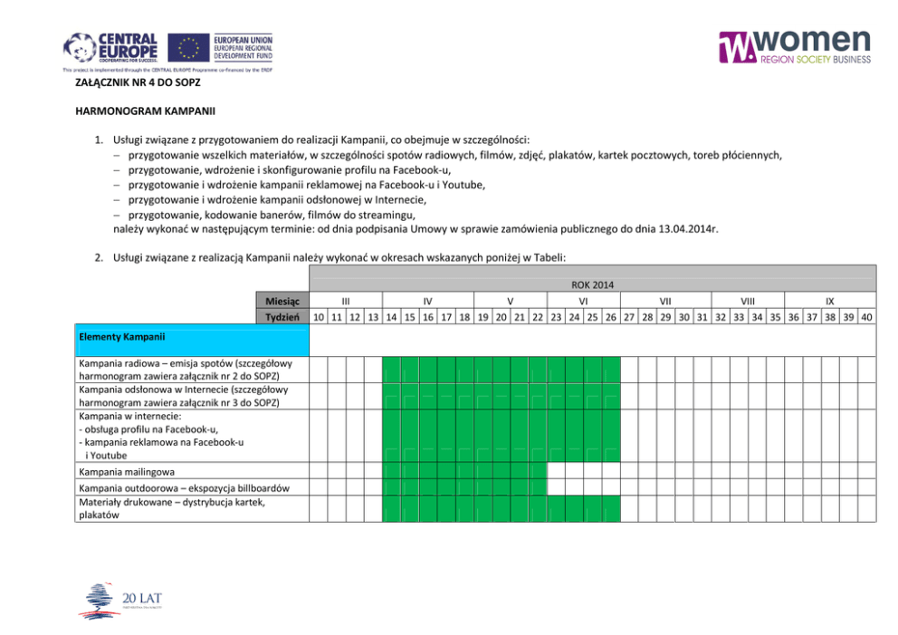 ZAŁĄCZNIK NR 4 DO SOPZ HARMONOGRAM KAMPANII 1. Usługi związane z przygotowaniem do realizacji Kampanii, co obejmuje w szczególności: przygotowanie wszelkich materiałów, w szczególności spotów radiowych, filmów, zdjęć, plakatów, kartek pocztowych, toreb płóciennych, przygotowanie, wdrożenie i skonfigurowanie profilu na Facebook-u, przygotowanie i wdrożenie kampanii reklamowej na Facebook-u i Youtube, przygotowanie i wdrożenie kampanii odsłonowej w Internecie, przygotowanie, kodowanie banerów, filmów do streamingu, należy wykonać w następującym terminie: od dnia podpisania Umowy w sprawie zamówienia publicznego do dnia 13.04.2014r. 2. Usługi związane z realizacją Kampanii należy wykonać w okresach wskazanych poniżej w Tabeli: ROK 2014 Miesiąc Tydzień Elementy Kampanii Kampania radiowa – emisja spotów (szczegółowy harmonogram zawiera załącznik nr 2 do SOPZ) Kampania odsłonowa w Internecie (szczegółowy harmonogram zawiera załącznik nr 3 do SOPZ) Kampania w internecie: - obsługa profilu na Facebook-u, - kampania reklamowa na Facebook-u i Youtube Kampania mailingowa Kampania outdoorowa – ekspozycja billboardów Materiały drukowane – dystrybucja kartek, plakatów III IV V VI VII VIII IX 10 11 12 13 14 15 16 17 18 19 20 21 22 23 24 25 26 27 28 29 30 31 32 33 34 35 36 37 38 39 40
