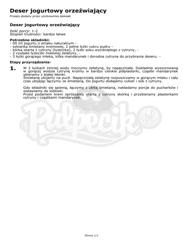 Deser jogurtowy orzeźwiający Przepis dodany przez użytkownika aleksa6 Deser jogurtowy orzeźwiający Ilość porcji: 1-2 Stopień trudności: bardzo łatwe Potrzebne składniki: - 00 ml jogurtu o smaku naturalnym - szklanka śmietany kremowej, 2 pełne łyżki cukru pudru - kórka otarta z cytryny (łyżeczka), 2 łyżki soku wyciśniętego z cytryny, - 2 czubate łyżeczki mielonej żelatyny, - 3 łyżki gorącego mleka, kilka mandarynek i dorodna cytryna do przybrania deseru. Etapy przyrządzania: 1. W 2 łyżkach zimnej wody moczymy żelatynę, by napęczniała. Dokładnie wyszorowaną w gorącej wodzie cytrynę kroimy w bardzo cienkie półplasterki, cząstki mandarynek obieramy z białej błonki. Śmietanę ubijamy na puch. Napęczniałą żelatynę rozpuszczamy w gorącym mleku i cały czas ubijając łączymy ze śmietaną. Do jogurtu dodajemy cukier i sok z cytryny. Gdy składniki się spienią, łączymy z ubitą śmietaną, nakładamy porcje do pucharków i wstawiamy do lodówki. Przed podaniem krem oprószamy otartą z cytryny skórką i przybieramy plasterkami cytryny i cząstkami mandarynek. Strona 1/1