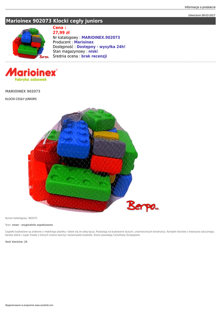 Informacje o produkcie Utworzono 08-03-2017 Marioinex 902073 Klocki cegły juniors Cena : 27,99 zł Nr katalogowy : MARIOINEX.902073 Producent : Marioinex Dostępność : Dostępny - wysyłka 24h! Stan magazynowy : niski Średnia ocena : brak recenzji MARIOINEX 902073 KLOCKI CEGŁY JUNIORS Numer katalogowy: 902073 Stan: nowe - oryginalnie zapakowane Cegiełki budowlane są zrobione z miękkiego plastiku i łatwo się ze sobą łączą. Pozwalają na budowanie dużych, urozmaiconych konstrukcji. Komplet klocków z tworzywa sztucznego, bardzo lekkie i super trwałe z których można tworzyć niesamowite budowle. Klocki posiadają Certyfikaty Europejskie. Ilość klocków: 25 Wygenerowano w programie www.oscGold.com Dostępność w salonach: Ilość sztuk: Sklep - Złotniki: 2 Sklep - zlikwidowany: 0 Sklep - Szczepankowo: 0 Dostępne opcje Marioinex 902073 Klocki cegły juniors » Wiek: 3 - 4 lat, 5 - 7 lat, 8 - 11 lat, 12 lat i więcej.