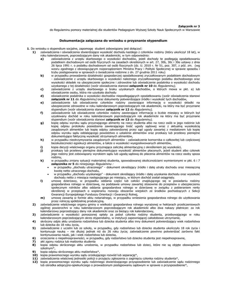 Załącznik nr 3 do Regulaminu pomocy materialnej dla studentów Pedagogium Wyższej Szkoły Nauk Społecznych w Warszawie Dokumentacja załączana do wniosku o przyznanie stypendium 1. Do wniosku o stypendium socjalne, zapomogę student zobowiązany jest dołączyć: 1) zaświadczenia i oświadczenia stwierdzające wysokość dochodu każdego z członków rodziny (który ukończył 18 lat), w roku kalendarzowym, poprzedzającym dany rok akademicki, w tym odpowiednio: a) zaświadczenia z urzędu skarbowego o wysokości dochodów, jeżeli dochody te podlegają opodatkowaniu podatkiem dochodowym od osób fizycznych na zasadach określonych w art. 27, 30b, 30c i 30e ustawy z dnia 26 lipca 1991 r. o podatku dochodowym od osób fizycznych (dz. U. 2010 r. Nr 51, poz. 307, z póź. zm. (wg wzoru zgodnego z obowiązującym rozporządzeniem Ministra Pracy i Polityki Społecznej w sprawie sposobu i trybu postępowania w sprawach o świadczenia rodzinne z dn. 27 grudnia 2011 roku) b) w przypadku prowadzenia działalności gospodarczej opodatkowanej zryczałtowanym podatkiem dochodowym - zaświadczenie z urzędu skarbowego o wysokości należnego zryczałtowanego podatku dochodowego oraz wysokości składek na ubezpieczenie społeczne i zdrowotne lub oświadczenie podatnika o wysokości dochodu uzyskanego z tej działalności (wzór oświadczenia stanowi załącznik nr 10 do Regulaminu), c) zaświadczenie z urzędu skarbowego o braku uzyskanych dochodów, o których mowa w pkt. a) lub oświadczenie osoby, która nie uzyskała dochodu d) oświadczenie podatnika o wysokości dochodów niepodlegających opodatkowaniu (wzór oświadczenia stanowi załącznik nr 11 do Regulaminu) oraz dokumenty potwierdzające źródło i wysokość tych dochodów, e) zaświadczenie lub oświadczenie członków rodziny zawierające informację o wysokości składki na ubezpieczenie zdrowotne w roku kalendarzowym poprzedzającym rok akademicki, na który ma być przyznane stypendium (wzór oświadczenia stanowi załącznik nr 12 do Regulaminu), f) zaświadczenie lub oświadczenie członków rodziny zawierające informację o liczbie miesięcy w których był uzyskiwany dochód w roku kalendarzowym poprzedzającym rok akademicki na który ma być przyznane stypendium (wzór oświadczenia stanowi załącznik nr 13 do Regulaminu), g) kopię odpisu wyroku sądu przyznającego alimenty na rzecz studenta albo na rzecz osób w jego rodzinie lub kopię odpisu protokołu posiedzenia zawierającego treść ugody sądowej wraz z aktualną wysokością zasądzonych alimentów lub kopię odpisu zatwierdzonej przez sąd ugody zawartej z mediatorem lub kopię odpisu wyroku sądu oddalającego powództwo o ustalenie alimentów oraz przekazy lub przelewy pieniężne dokumentujące faktyczną wysokość otrzymanych alimentów, h) w przypadku nieotrzymywania zasądzonych alimentów - zaświadczenie komornika o całkowitej lub częściowej bezskuteczności egzekucji alimentów, a także o wysokości wyegzekwowanych alimentów, i) kopia decyzji właściwego organu przyznająca zaliczkę alimentacyjną z określeniem jej wysokości, j) przekazy lub przelewy pieniężne dokumentujące wysokość alimentów płaconych, jeżeli student albo członek jego rodziny jest zobowiązany wyrokiem sądu lub ugodą sądową do płacenia alimentów na rzecz osoby spoza rodziny, k) w przypadku zmiany sytuacji materialnej studenta, spowodowanej okolicznościami wymienionymi w pkt. 6 i 7 załącznika nr 5 do niniejszego Regulaminu : w przypadku „dochodu utraconego” - dokument określający źródło i datę utraty dochodu oraz miesięczną kwotę netto utraconego dochodu, w przypadku „dochodu uzyskanego” - dokument określający źródło i datę uzyskania dochodu oraz wysokość dochodu netto z miesiąca następującego po miesiącu, w którym dochód został osiągnięty. l) umowę dzierżawy, w przypadku oddania części lub całości znajdującego się w posiadaniu rodziny gospodarstwa rolnego w dzierżawę, na podstawie umowy zawartej stosownie do przepisów o ubezpieczeniu społecznym rolników albo oddania gospodarstwa rolnego w dzierżawę w związku z pobieraniem renty określonej w przepisach o wspieraniu rozwoju obszarów wiejskich ze środków pochodzących z Sekcji Gwarancji Europejskiego Funduszu Orientacji i Gwarancji Rolnej, m) umowę zawartą w formie aktu notarialnego, w przypadku wniesienia gospodarstwa rolnego do użytkowania przez rolniczą spółdzielnię produkcyjną. 2) zaświadczenie właściwego organu gminy o wielkości gospodarstwa rolnego wyrażonej w hektarach przeliczeniowych ogólnej powierzchni w roku kalendarzowym poprzedzającym rok akademicki albo dwa nakazy płatnicze: za rok kalendarzowy poprzedzający dany rok akademicki oraz za bieżący rok kalendarzowy, 3) zaświadczenie o wysokości ponoszonej opłaty za pobyt członka rodziny studenta, przebywającego w roku kalendarzowym poprzedzającym okres stypendialny, w instytucji zapewniającej całodobowe utrzymanie, 4) skrócony odpis aktu urodzenia rodzeństwa lub dziecka studenta albo inny dokument potwierdzający wiek rodzeństwa lub dziecka do 18 roku życia, 5) zaświadczenie z uczelni lub ze szkoły, w przypadku, gdy rodzeństwo lub dziecko studenta ukończyło 18 rok życia i kontynuuje naukę – nie dłużej jednak niż do 26 roku życia; zaświadczenie powinno potwierdzać zarówno fakt kontynuowania nauki, jak i wiek rodzeństwa lub dziecka, 6) orzeczenie o niepełnosprawności, w przypadku, gdy rodzeństwo lub dziecko studenta jest niepełnosprawne, 7) akt zgonu rodzica lub małżonka studenta 8) kopia odpisu skróconego aktu urodzenia, w przypadku rodzeństwa lub dzieci, które nie są objęte obowiązkiem szkolnym*, 9) kopia odpisu skróconego aktu małżeństwa*, 10) kopia prawomocnego wyroku sądu orzekającego rozwód lub separację*, 11) zaświadczenia właściwej jednostki policji o przyjęciu zgłoszenia o zaginięciu członka rodziny studenta*, 1