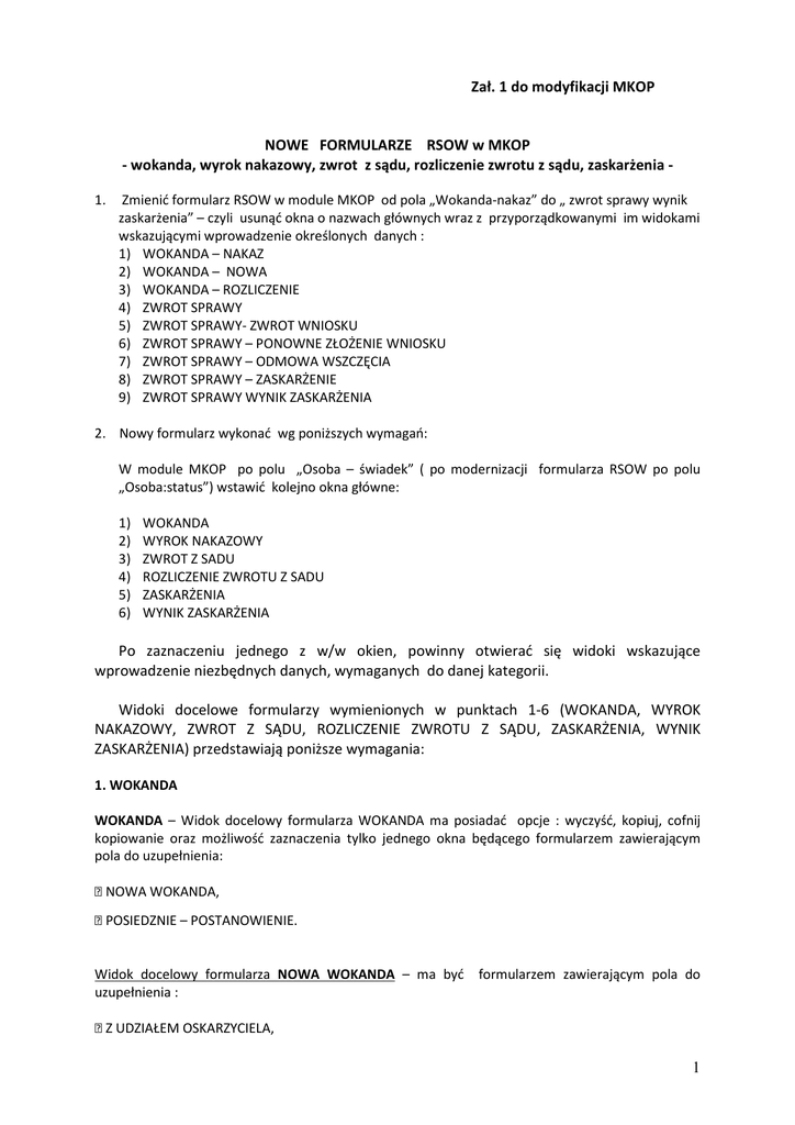 Zał. 1 do modyfikacji MKOP NOWE FORMULARZE RSOW w MKOP - wokanda, wyrok nakazowy, zwrot z sądu, rozliczenie zwrotu z sądu, zaskarżenia 1. Zmienić formularz RSOW w module MKOP od pola „Wokanda-nakaz” do „ zwrot sprawy wynik zaskarżenia” – czyli usunąć okna o nazwach głównych wraz z przyporządkowanymi im widokami wskazującymi wprowadzenie określonych danych : 1) WOKANDA – NAKAZ 2) WOKANDA – NOWA 3) WOKANDA – ROZLICZENIE 4) ZWROT SPRAWY 5) ZWROT SPRAWY- ZWROT WNIOSKU 6) ZWROT SPRAWY – PONOWNE ZŁOŻENIE WNIOSKU 7) ZWROT SPRAWY – ODMOWA WSZCZĘCIA 8) ZWROT SPRAWY – ZASKARŻENIE 9) ZWROT SPRAWY WYNIK ZASKARŻENIA 2. Nowy formularz wykonać wg poniższych wymagań: W module MKOP po polu „Osoba – świadek” ( po modernizacji formularza RSOW po polu „Osoba:status”) wstawić kolejno okna główne: 1) 2) 3) 4) 5) 6) WOKANDA WYROK NAKAZOWY ZWROT Z SADU ROZLICZENIE ZWROTU Z SADU ZASKARŻENIA WYNIK ZASKARŻENIA Po zaznaczeniu jednego z w/w okien, powinny otwierać się widoki wskazujące wprowadzenie niezbędnych danych, wymaganych do danej kategorii. Widoki docelowe formularzy wymienionych w punktach 1-6 (WOKANDA, WYROK NAKAZOWY, ZWROT Z SĄDU, ROZLICZENIE ZWROTU Z SĄDU, ZASKARŻENIA, WYNIK ZASKARŻENIA) przedstawiają poniższe wymagania: 1. WOKANDA WOKANDA – Widok docelowy formularza WOKANDA ma posiadać opcje : wyczyść, kopiuj, cofnij kopiowanie oraz możliwość zaznaczenia tylko jednego okna będącego formularzem zawierającym pola do uzupełnienia: NOWA WOKANDA, POSIEDZNIE – POSTANOWIENIE. Widok docelowy formularza NOWA WOKANDA – ma być uzupełnienia : formularzem zawierającym pola do Z UDZIAŁEM OSKARZYCIELA, 1 BEZ UDZIAŁU OSKARŻYCIELA Formularz NOWA WOKANDA - z udziałem oskarżyciela ma zawierać pola: 1) datę rozprawy (wybór z kalendarza), 2) godzinę rozprawy (pole tekstowe do uzupełnienia, dwukropek pomiędzy godziną a minutą ma się wygenerować automatycznie), 3) oskarżyciel –(pole tekstowe do uzupełnienia poprzez wybór z listy użytkowników nazwiska lub numeru służbowego; ma wyświetlać się podpowiedź po wpisaniu frazy. Jeśli użytkownik nie wprowadzi danych oskarżyciela system nie pozwoli mu przejść do kolejnego okna i podświetli okno „oskarżyciel” jako przypomnienie do uzupełnienia), 4) sposób zakończenia (wybór ze słownika jednego zadeklarowanego pola: Grzywna (po zaznaczeniu „grzywna” rozwinie się pole umożliwiające wpisanie kwotyliczbowo i na końcu zawsze będzie automatyczny wpis „zł” ), Nagana, Uniewinnienie (system ma umożliwić wpisanie powodu; powód użytkownik wpisze w pole umożliwiające wprowadzenie nieograniczonej ilości znaków. Jeśli użytkownik nie wpisze powodu uniewinnienia system nie pozwoli mu przejść do kolejnego okna i podświetli okno „powód” jako przypomnienie do uzupełnienia.), Uznano winę i odstąpiono od wymierzenia kary, Umorzono (po zaznaczeniu umorzenia rozwinie się pole „powód”- użytkownik zaznaczy powód wybierany z rozwijanej listy. Lista zawierać będzie ten sam opis powodów jaki w formularzu RSOW zawiera okno: ”Rodzaj wyniku-umorzenie-powód umorzenia” oraz umożliwi wpisanie innego powodu w oknie – „inna okoliczność”. W oknie tym użytkownik może wpisać nieograniczona ilość znaków. (tak ma się nazywać to okno po zmianie formularza, obecnie w MKOP nazywa się „powód umorzenia –inne okoliczności” Jeśli użytkownik zaznaczy w oknie „powód” umorzenia –inną okoliczność to system podpowie że użytkownik musi w oknie „inna okoliczność” dokonać odpowiedniego wpisu jaka to była ta inna okoliczność. Jeśli użytkownik nie wpisze powodu innej okoliczności a zaznaczył ją w oknie powód system nie pozwoli mu przejść do kolejnego okna a w oknie „inna okoliczność” – zaznaczy się podpowiedź że musi coś wpisać) Odroczono, Areszt, Ograniczenie wolności. Formularz NOWA WOKANDA - bez udziału oskarżyciela ma zawierać pola: 1) datę rozprawy (wybór z kalendarza), 2) godzinę rozprawy (pole tekstowe do uzupełnienia, dwukropek pomiędzy godziną a minutą ma się wygenerować automatycznie), 3) sposób zakończenia (wybór ze słownika jednego zadeklarowanego pola: Grzywna (po zaznaczeniu „grzywna” rozwinie się pole umożliwiające wpisanie kwotyliczbowo i na końcu zawsze będzie automatyczny wpis „zł” ), Nagana, Uniewinnienie (system ma umożliwić wpisanie powodu; powód użytkownik wpisze w pole umożliwiające wprowadzenie nieograniczonej ilości znaków. Jeśli użytkownik nie wpisze powodu uniewinnienia system nie pozwoli mu przejść do kolejnego okna i podświetli okno „powód” jako przypomnienie do uzupełnienia.), Uznano winę i odstąpiono od wymierzenia kary, Umorzono (po zaznaczeniu umorzenia rozwinie się pole „powód”- użytkownik zaznaczy powód wybierany z rozwijanej listy. Lista zawierać będzie ten sam opis powodów jaki w formularzu RSOW zawiera okno: ”Rodzaj wyniku-umorzenie-powód umorzenia” oraz umożliwi wpisanie innego powodu w oknie – „inna okoliczność” . W oknie tym użytkownik może wpisać nieograniczona ilość znaków. (tak ma się nazywać to okno po zmianie formularza, obecnie w MKOP nazywa się „powód umorzenia –inne okoliczności” 2 Jeśli użytkownik zaznaczy w oknie „powód” umorzenia –inną okoliczność to system podpowie że użytkownik musi w oknie „inna okoliczność” dokonać odpowiedniego wpisu jak to była ta inna okoliczność. Jeśli użytkownik nie wpisze powodu innej okoliczności a zaznaczył ją w oknie „powód” system nie pozwoli mu przejść do kolejnego okna a w oknie „inna okoliczność” – zaznaczy się podpowiedź że musi coś wpisać), Odroczono, Areszt, Ograniczenie wolności. Widok docelowy formularza– POSIEDZENIE – POSTANOWIENIE ma być formularzem zawierającym pola do uzupełnienia : Z UDZIAŁEM OSKARŻYCIELA, BEZ UDZIAŁU OSKARŻYCIELA. Formularz POSIED
