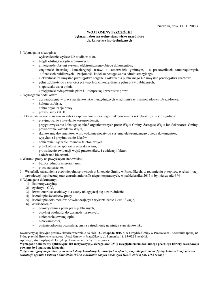 Pszczółki, dnia 13.11. 2015 r. WÓJT GMINY PSZCZÓŁKI ogłasza nabór na wolne stanowisko urzędnicze ds. kancelaryjno-technicznych 1. Wymagania niezbędne: wykształcenie wyższe lub studia w toku, biegła obsługa urządzeń biurowych, umiejętność obsługi systemu elektronicznego obiegu dokumentów, znajomość instrukcji kancelaryjnej, ustaw: o samorządzie gminnym, o pracownikach samorządowych, o finansach publicznych , znajomość kodeksu postępowania administracyjnego, niekaralność za umyślne przestępstwa ścigane z oskarżenia publicznego lub umyślne przestępstwa skarbowe, pełna zdolność do czynności prawnych oraz korzystanie z pełni praw publicznych, nieposzlakowana opinia, umiejętność redagowania pism i interpretacji przepisów prawa. 2. Wymagania dodatkowe: doświadczenie w pracy na stanowiskach urzędniczych w administracji samorządowej lub rządowej, kultura osobista, dobra organizacja pracy. prawo jazdy kat. B. 3. Do zadań na ww. stanowisku należy zapewnienie sprawnego funkcjonowania sekretariatu, a w szczególności: przyjmowanie i wysyłanie korespondencji, przygotowywanie i obsługa spotkań organizowanych przez Wójta Gminy, Zastępcę Wójta lub Sekretarza Gminy, prowadzenie kalendarza Wójta, skanowanie dokumentów, wprowadzanie poczty do systemu elektronicznego obiegu dokumentów, wysyłanie i przyjmowanie faksów, odbieranie i łączenie rozmów telefonicznych, protokółowanie spotkań z mieszkańcami, prowadzenie ewidencji wyjść pracowników i ewidencji faktur, nadzór nad kluczami. 4.Warunki pracy na powyższym stanowisku: bezpośrednio z interesantami, praca na parterze. 5. Wskaźnik zatrudnienia osób niepełnosprawnych w Urzędzie Gminy w Pszczółkach, w rozumieniu przepisów o rehabilitacji zawodowej i społecznej oraz zatrudnianiu osób niepełnosprawnych, w październiku 2015 r. był niższy niż 6 % 6. Wymagane dokumenty: 1) list motywacyjny, 2) życiorys - C.V., 3) kwestionariusz osobowy dla osoby ubiegajacej się o zatrudnienie, 4) kserokopie świadectw pracy, 5) kserokopie dokumentów poświadczających wykształcenie i kwalifikacje, 6) oświadczenie: o korzystaniu z pełni praw publicznych, o pełnej zdolności do czynności prawnych, o nieposzlakowanej opinii, o niekaralności, o stanie zdrowia pozwalającym na zatrudnienie na niniejszym stanowisku. Dokumenty aplikacyjne prosimy składać w terminie do dnia 23 listopada 2015 r., w Urzędzie Gminy w Pszczółkach - sekretariat (pokój nr 1) lub przesłać listownie na adres: Urząd Gminy w Pszczółkach, ul. Pomorska 18, 83-032 Pszczółki. Aplikacje, które wpłyną do Urzędu po terminie, nie będą rozpatrywane. Wymagane dokumenty aplikacyjne: list motywacyjny, szczegółowe CV (z uwzględnieniem dokładnego przebiegu kariery zawodowej) powinny być opatrzone klauzulą: " Wyrażam zgodę na przetwarzanie moich danych osobowych, zawartych w ofercie pracy, dla potrzeb niezbędnych do realizacji procesu rekrutacji, zgodnie z ustawą z dnia 29.08.1997 r. o ochronie danych osobowych (Dz.U. 2014 r. poz. 1182 ze zm.)."