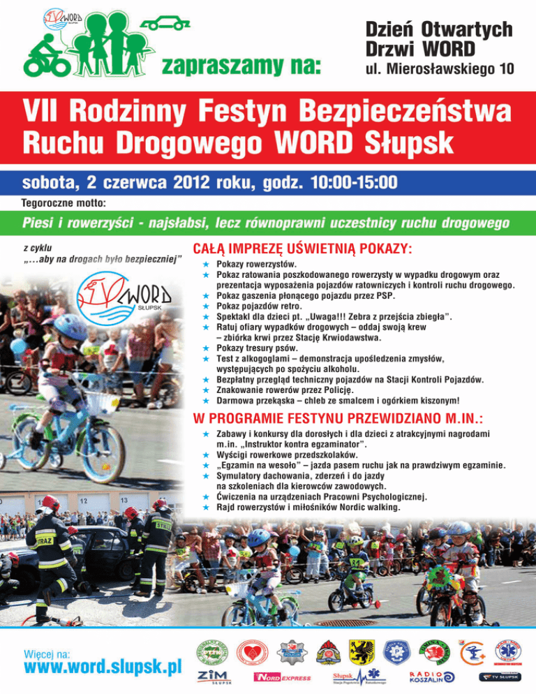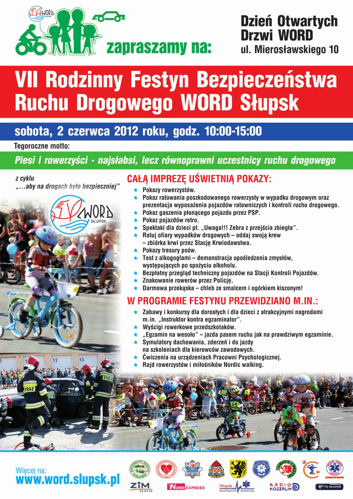 Całą imprezę uświetnią pokazy: Pokazy rowerzystów. Pokaz ratowania poszkodowanego rowerzysty w wypadku drogowym oraz prezentacja wyposażenia pojazdów ratowniczych i kontroli ruchu drogowego. Pokaz gaszenia płonącego pojazdu przez PSP. Pokaz pojazdów retro. Spektakl dla dzieci pt. „Uwaga!!! Zebra z przejścia zbiegła”. Ratuj ofiary wypadków drogowych – oddaj swoją krew – zbiórka krwi przez Stację Krwiodawstwa. Pokazy tresury psów. Test z alkogoglami – demonstracja upośledzenia zmysłów, występujących po spożyciu alkoholu. Bezpłatny przegląd techniczny pojazdów na Stacji Kontroli Pojazdów. Znakowanie rowerów przez Policję. Darmowa przekąska – chleb ze smalcem i ogórkiem kiszonym! W programie festynu przewidziano m.in.: Zabawy i konkursy dla dorosłych i dla dzieci z atrakcyjnymi nagrodami m.in. „Instruktor kontra egzaminator”. Wyścigi rowerkowe przedszkolaków. „Egzamin na wesoło” – jazda pasem ruchu jak na prawdziwym egzaminie. Symulatory dachowania, zderzeń i do jazdy na szkoleniach dla kierowców zawodowych. Ćwiczenia na urządzeniach Pracowni Psychologicznej. Rajd rowerzystów i miłośników Nordic walking.