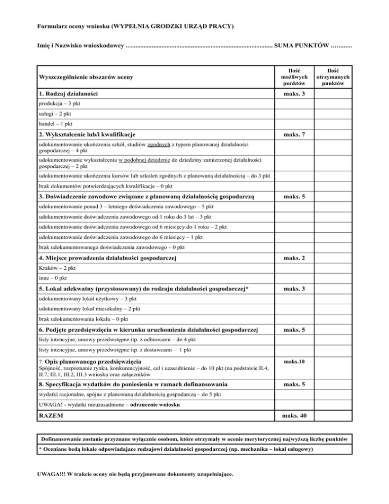 Formularz oceny wniosku - Grodzki Urząd Pracy w Krakowie