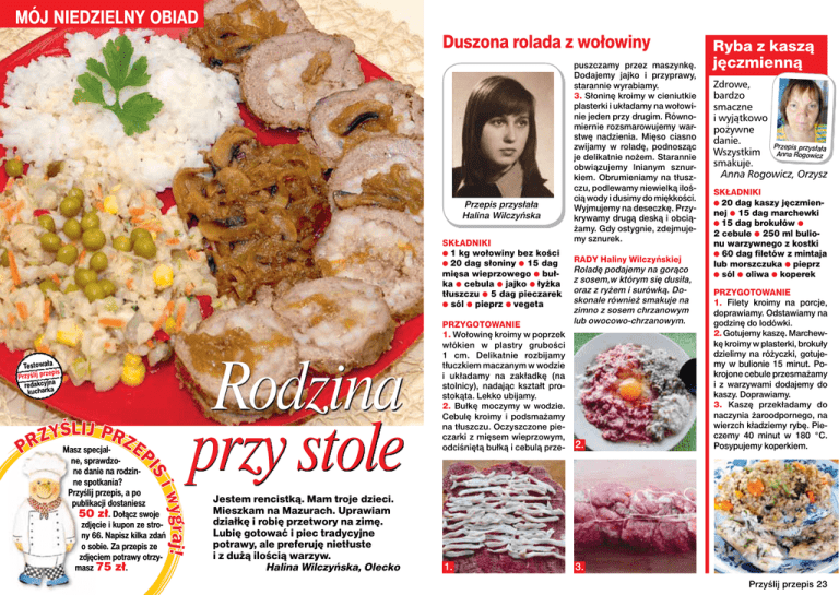 MÓJ NIEDZIELNY OBIAD Duszona rolada z wołowiny Przepis przysłała Halina Wilczyńska SKŁADNIKI ● 1 kg wołowiny bez kości ● 20 dag słoniny ● 15 dag mięsa wieprzowego ● bułka ● cebula ● jajko ● łyżka tłuszczu ● 5 dag pieczarek ● sól ● pieprz ● vegeta Testowała pis Przyślij prze na yj kc da re kucharka Masz specjalne, sprawdzone danie na rodzinne spotkania? Przyślij przepis, a po publikacji dostaniesz 50 zł. Dołącz swoje zdjęcie i kupon ze strony 66. Napisz kilka zdań o sobie. Za przepis ze zdjęciem potrawy otrzymasz 75 zł. Rodzina przy stole Jestem rencistką. Mam troje dzieci. Mieszkam na Mazurach. Uprawiam działkę i robię przetwory na zimę. Lubię gotować i piec tradycyjne potrawy, ale preferuję nietłuste i z dużą ilością warzyw. Halina Wilczyńska, Olecko PRZYGOTOWANIE 1. Wołowinę kroimy w poprzek włókien w plastry grubości 1 cm. Delikatnie rozbijamy tłuczkiem maczanym w wodzie i układamy na zakładkę (na stolnicy), nadając kształt prostokąta. Lekko ubijamy. 2. Bułkę moczymy w wodzie. Cebulę kroimy i podsmażamy na tłuszczu. Oczyszczone pieczarki z mięsem wieprzowym, odciśniętą bułką i cebulą prze- 1. puszczamy przez maszynkę. Dodajemy jajko i przyprawy, starannie wyrabiamy. 3. Słoninę kroimy w cieniutkie plasterki i układamy na wołowinie jeden przy drugim. Równomiernie rozsmarowujemy warstwę nadzienia. Mięso ciasno zwijamy w roladę, podnosząc je delikatnie nożem. Starannie obwiązujemy lnianym sznurkiem. Obrumieniamy na tłuszczu, podlewamy niewielką ilością wody i dusimy do miękkości. Wyjmujemy na deseczkę. Przykrywamy drugą deską i obciążamy. Gdy ostygnie, zdejmujemy sznurek. RADY Haliny Wilczyńskiej Roladę podajemy na gorąco z sosem,w którym się dusiła, oraz z ryżem i surówką. Doskonale również smakuje na zimno z sosem chrzanowym lub owocowo-chrzanowym. 2. Ryba z kaszą jęczmienną Zdrowe, bardzo smaczne i wyjątkowo pożywne danie. Przepis przysłała Wszystkim Anna Rogowicz smakuje. Anna Rogowicz, Orzysz SKŁADNIKI ● 20 dag kaszy jęczmiennej ● 15 dag marchewki ● 15 dag brokułów ● 2 cebule ● 250 ml bulionu warzywnego z kostki ● 60 dag filetów z mintaja lub morszczuka ● pieprz ● sól ● oliwa ● koperek PRZYGOTOWANIE 1. Filety kroimy na porcje, doprawiamy. Odstawiamy na godzinę do lodówki. 2. Gotujemy kaszę. Marchewkę kroimy w plasterki, brokuły dzielimy na różyczki, gotujemy w bulionie 15 minut. Pokrojone cebule przesmażamy i z warzywami dodajemy do kaszy. Doprawiamy. 3. Kaszę przekładamy do naczynia żaroodpornego, na wierzch kładziemy rybę. Pieczemy 40 minut w 180 °C. Posypujemy koperkiem. 3. Przyślij przepis 23