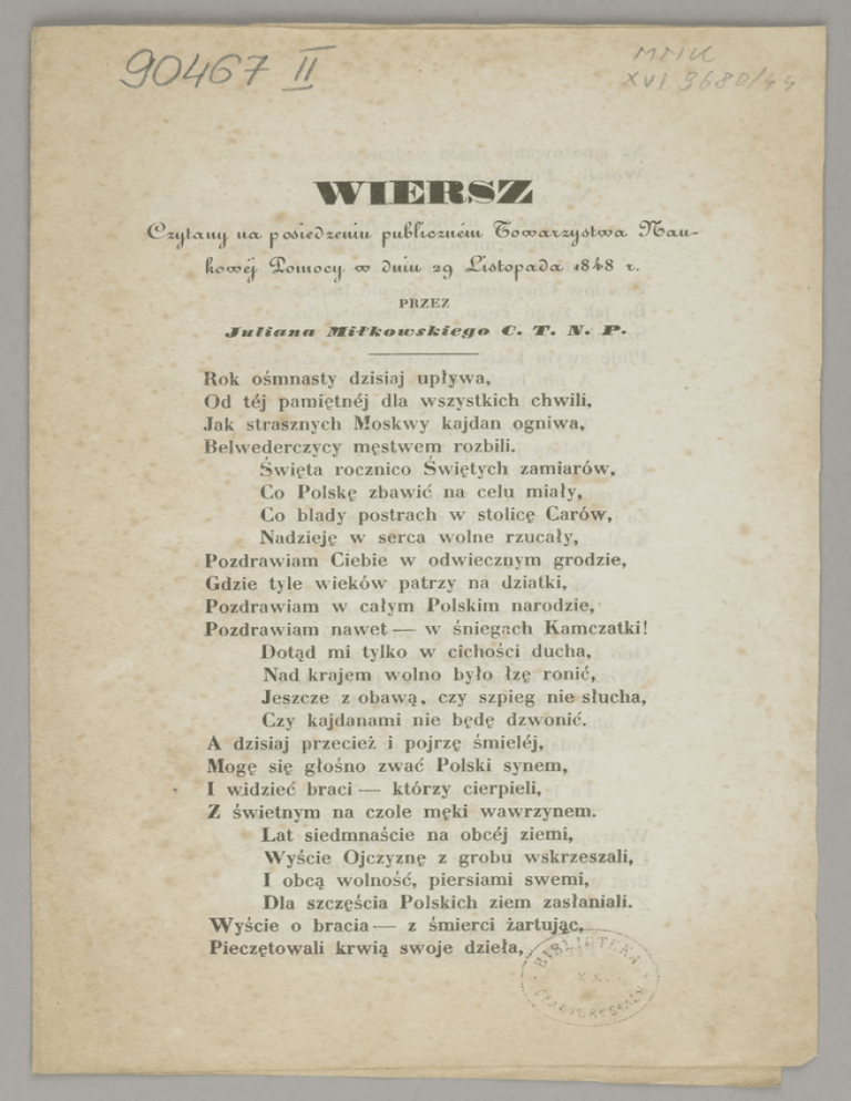 H W P t- 9 0 //G? 1 WIERiK J fu liu n u JfEitfleowcsleiego C. T . JW JP* | Rok ośmnasty dzisiaj upływa, Od tój pamiętnej dla wszystkich chwili, Jak strasznych Moskwy kajdan ogniwa, Belwederczycy męstwem rozbili. Święta rocznico Świętych zamiarów, Co Polskę zbawić na celu miały, Co blady postrach w' stolicę Carów, Nadzieję w serca wolne rzucały, Pozdrawiam Ciebie w odwiecznym grodzie, Gdzie tyle wieków patrzy na dziatki, Pozdrawiam w całym Polskim narodzie,1 Pozdrawiam naw et— w śniegach Kamczatki! Dotąd mi tylko w cichości ducha, Nad krajem wolno było łzę ronić, Jeszcze z obawą, czy szpieg nie słucha, Czy kajdanami nie będę dzwonić. A dzisiaj przecież i pojrzę śmielćj, Mogę się głośno zwąc Polski synem, I widzieć b ra ci— którzy cierpieli, Z świetnym na czole męki wawrzynem. v Lat siedmnaście na obcej ziemi, Wyście Ojczyznę z grobu wskrzeszali, I obcą wolność, piersiami swemi, Dla szczęścia Polskich ziem zasłaniali. W yście o bracia— z śmierci żartuj<yv_~.^ Pieczętowali krwią swoje d z i e ł a , ! f •£. , W ybawią Polskę— lecz jedność ducha, blask oświaty złączony z enotą. T ak! przyszłe szczęście w waszćj jest dłoni, Za prawość, mądrość nie grożą męki, Bo czyż być prawym ktokolwiek wzbroni, Lub zniszczą światło arm at paszCięki? W ięc cześć W am grona tutaj zebrane! Na waszych barkach śpi Polska ca ła , W am narodowe losy oddane, Stróże praw L u d u ! cześć W am i chwała! W ytrwajcie szczytnie;; mimo przeszkody | Lud nasz do równi wiedźcie z innemi. Szerzcie pojęcia braterstwa ■ — zgody — Miłości bliźnich— Ojczystćj ziemi. W potęgę Ludu nie traćcie wiary, Że Ona niczćm — podłe oszczerstwo: Ona nam jedna wzniesie sztandary Z napisem: Wolność, Równość, Braterstwo! Gdyż jak szewc bosych braci obuje, Krawiec ustroi w białe .sukmany, Kowal nam groty do lanc ukuje Spytamy wszyscy „gdzie są tyrany?“ , Bo jeźli stanie zarówno w boju 2 szlachtą i chłopem, młódź rzemieślnicza, To za rok walki — sto lat pokoju Użyje P olska —* wolna — dziewicza! I widząc u nas jak bez korony. Szczęście i spokój błogo zakwita, Z zazdrością krzyknie świąt zadziwiony, „Niemasz jak POLSKA RZECZPOSPOLITA!* I Isfiis!S B Ittii1 M P V ~'J%f - XX, f-1 , / \Ł<Y*;rr.a (Cena ffó sz y 6.) WIERiZ ita- po4te0 *eum pii$fussueiu/ t 2(&a,iL- Łj?onioci| w Outu. 2 C) jCiólopciOa. i8 4 ’8 t-. PRZEZ J f u l i a n a m i t h o w s k i e g n C. V . JV. P. Rok ośmnasty dzisiaj upływa, Od tój pamiętnćj dla wszystkich chwili, Jak strasznych Moskwy kajdan ogniwa, Bejwederczycy męstwem rozbili. Święta rocznico Świętych zamiarów, Co Polskę zbawić na celu miały, Co blady postrach w stolicę Garów, Nadzieję w serca wolne rzucały, Pozdrawiam Ciebie w odwiecznym grodzie, Gdzie tyle wieków patrzy na dziatki, Pozdrawiam w całym Polskim narodzie,4 Pozdrawiam nawet — w śniegach Kamczatki! Dotąd mi tylko w cichości ducha, Nad krajem wolno było łzę ronić, Jeszcze z obawą, czy szpieg nie słucha, Czy kajdanami nie będę dzwonić. A dzisiaj przecież i pojrzę śmielćj, Mogę się głośno zwać Polski synem, I widzieć braci — którzy cierpieli, Z świetnym na czole męki wawrzynem. Lat siedmnaście na obcćj ziemi, Wyście Ojczyznę z grobu wskrzeszali, I obcą wolność, piersiami swemi, Dla szczęścia Polskich ziem zasłaniali. W yście o bracia— z śmierci ż a rtu j^ c^ ^ Pieczętowali krwią swoje dzieła, . / i ! ~r$.f-■ ■I » ' y i 0 - I 4^'/ S l I i l B i 1 1-; i i i .• f i ® ! M U ’ Na rusztowania deski wstępując, Wołali: „Polska nie zaginęła." Nie zaginęła i nie zaginie, Bo jeszcze uczniów Chrystusa liczy, I jeszcze nieraz choć krew popłynie, Toć w końcu wielkość swą odziedziczy. Uczniów Chrystusa!— to nie bluznierstwem Bo jak zwać Tego, co własne ciało,. Szarpiąc zębami w oczy z szyderstwem* Pluje swym katom, mówiąc: „To mało!" A nie brak takich, co się zaparli Wszystkiego, co zwą życia potrzebą: Tak, żeby święci w Niebie wymarli, Polska jest zdolną zapełnić Niebo ! I krew ta Święta szeroką strugą, Użyźnia ziemię *— plon niesie złoty, Z ajć j to sprawą ujrzym niedługo, Królestwo Boże — Królestwo Cnoty. Ale królestwo nie z tego świata, Nie z koron, bereł, cacek, łachmanów, Bez hord żołdaetwa — szubienic — kata, Bez zgrai książąt'— ministrów — panów. Ono tćj ziemskiój nie zna nicości, Wyższy, świetniejszy blask je okrywa: W imie W olności—• w imie Równości— W imie Braterstw a Narody v żywa. Podaje wszystkim Ludom dłoń bratnią, W oła do walki z każdym tyranem, Ta będzie straszną %■ ale ostatnią, Bo będzie walką Boga z Szatanem. W strząśnie się ziemia— słońce się skryje, Umarły naród będzie wskrzeszony, Brat wyrodnego brata zabije, Z łbów pomazanych spadną korony. A gdy je zedrzeć za wiele trudu, Precz z koronami i łby odrazu, Nie chciały woli skłonie się Ludu, To się ukłonią teraz żelazu. Bo ten co gardził wzorami Zbawcy, Szatana raczćj szukając śladu, Niechaj jak zbrodiień w rękach oprawcy, Dla straszliwego kona przykładu. I gdy niewolno prawu różnicy, Pomiędzy rodem — majątkiem stawić, To i król może z pod szubienicy, Królewską nogą świat błogosławić. My jednak wcale nie chceni zniszczenia , Brzydzim się. rzezią — Polski szukamy! A przecież dla tej Polski zbawienia, Rodzonych braci w ofiarę damy. Lekarzom winę krwi: któż śmiś zwalić, Gdy w brzydkich topią swe noże wrzodach Naród jak ciało trzeba ocalić, Złe niszcząc w samych jego zarodach. O chcićj odsunąć ten kielich Boże, Kielich goryczy z krwią pomieszany, Lecz kiedy przezeń tylko być może Ojczyzna wolną: śmierć wam tyrany ! I dzisiaj toast podnoszę święty, Niech żyje Polska! ludy powstaną! « Niech ród tyranów zginie przeklęty, Niech ujrzy ziemię świat obiecaną! A gdy nam obcą przeznacz